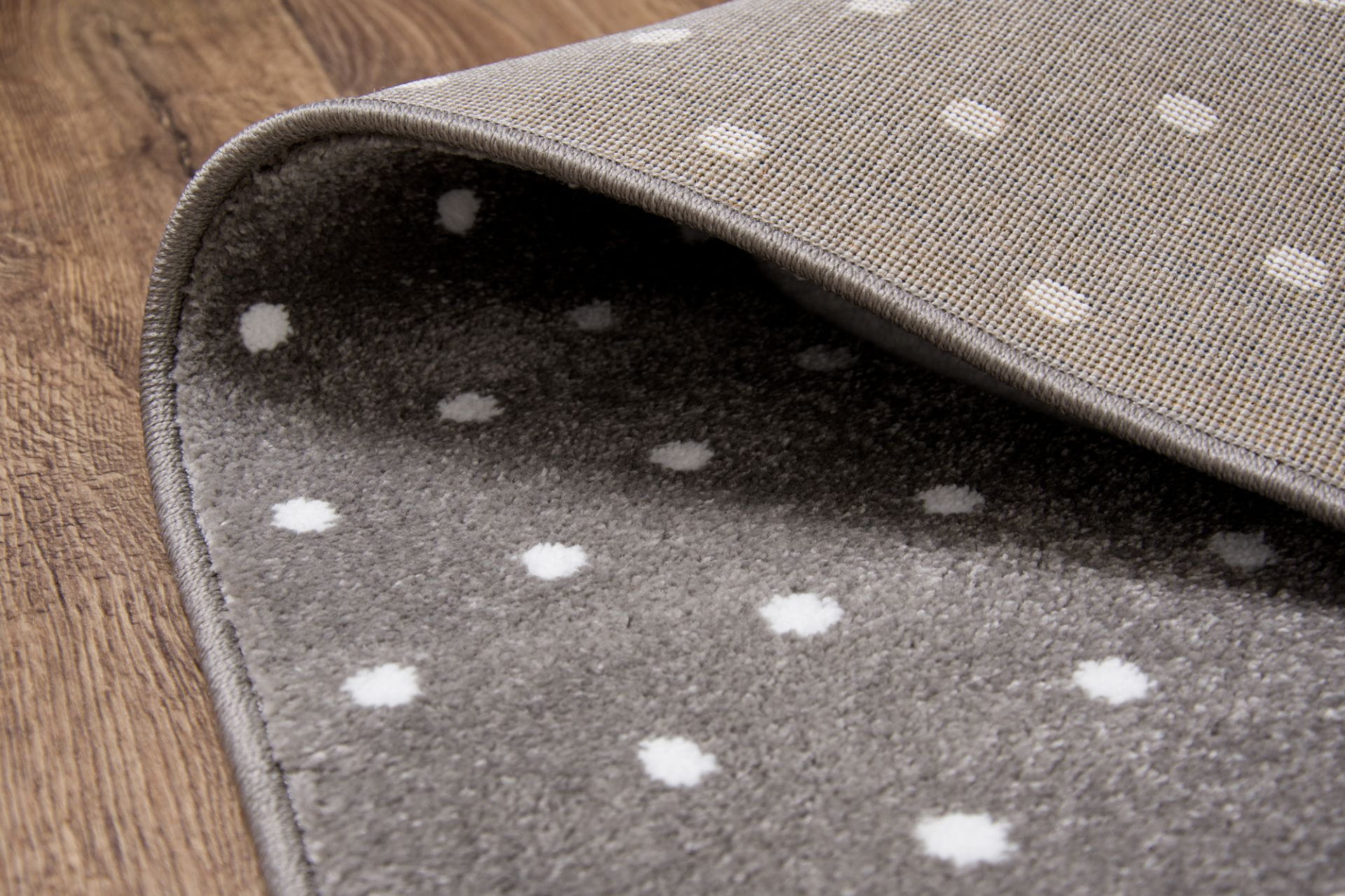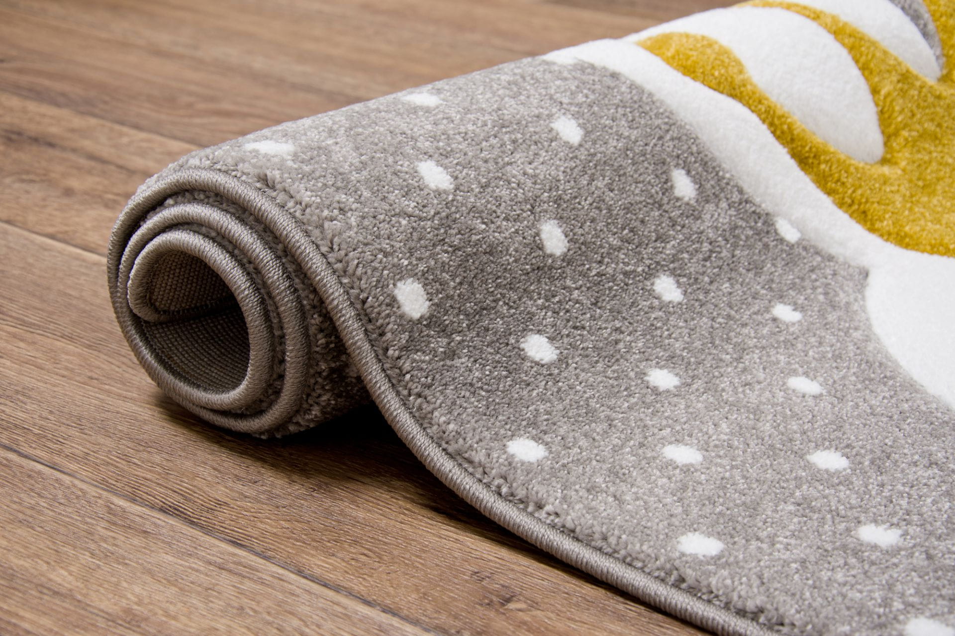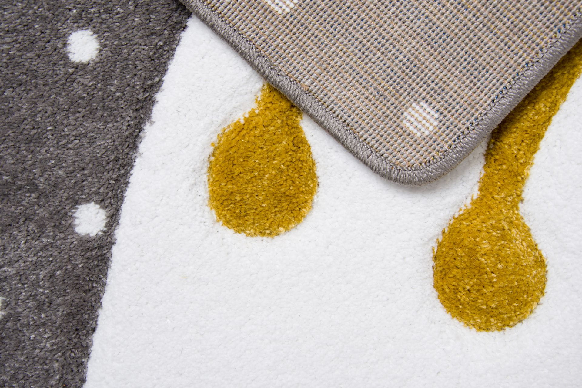 Ten dywan posiada prześliczny motyw białego króliczka z koroną na szarym tle w białe kropeczki. Trójwymiarowy wzór osiągnięty przez wycinany relief sprawią, że te dywaniki będą przyjemną i wdzięczną dekoracją dziecięcego pokoju.