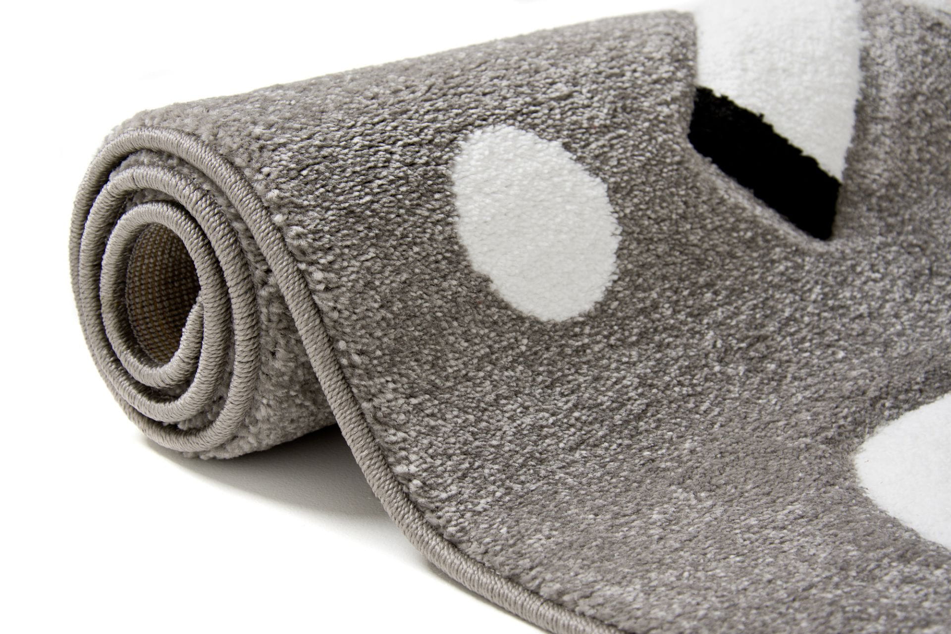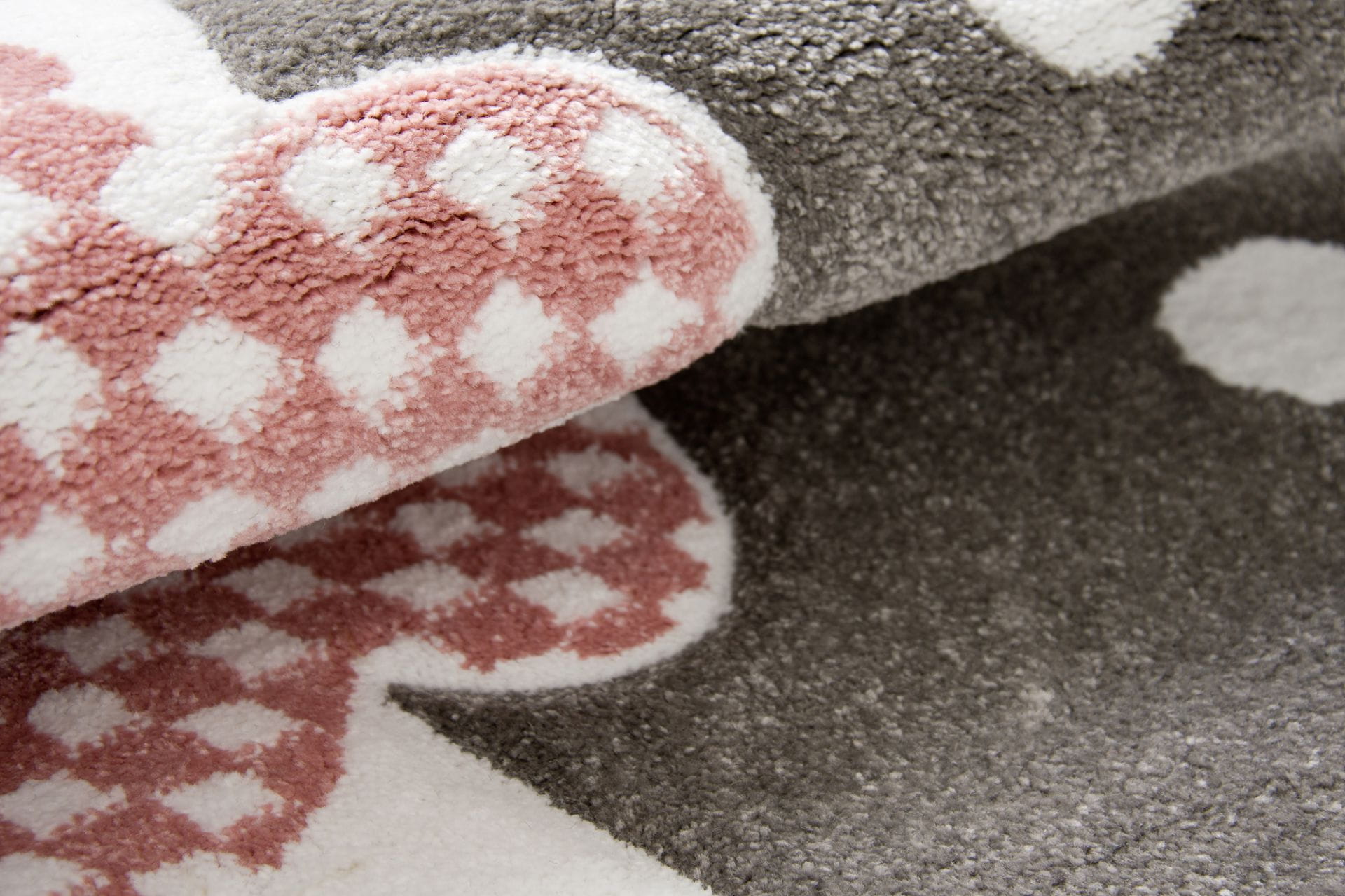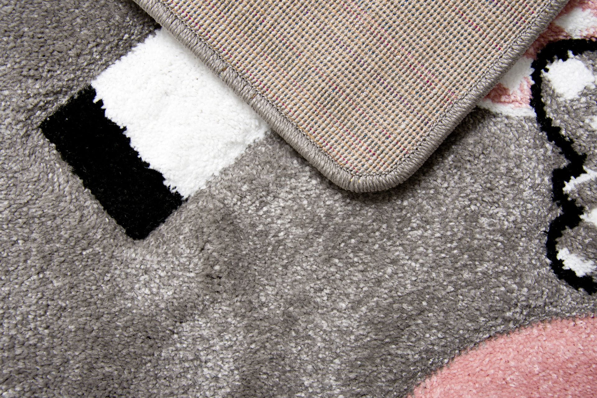 Ten dywan posiada prześliczny motyw białego króliczka z koroną na szarym tle w białe kropeczki. Trójwymiarowy wzór osiągnięty przez wycinany relief sprawią, że te dywaniki będą przyjemną i wdzięczną dekoracją dziecięcego pokoju.