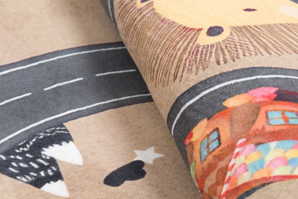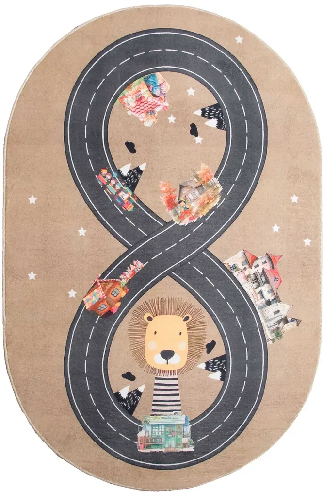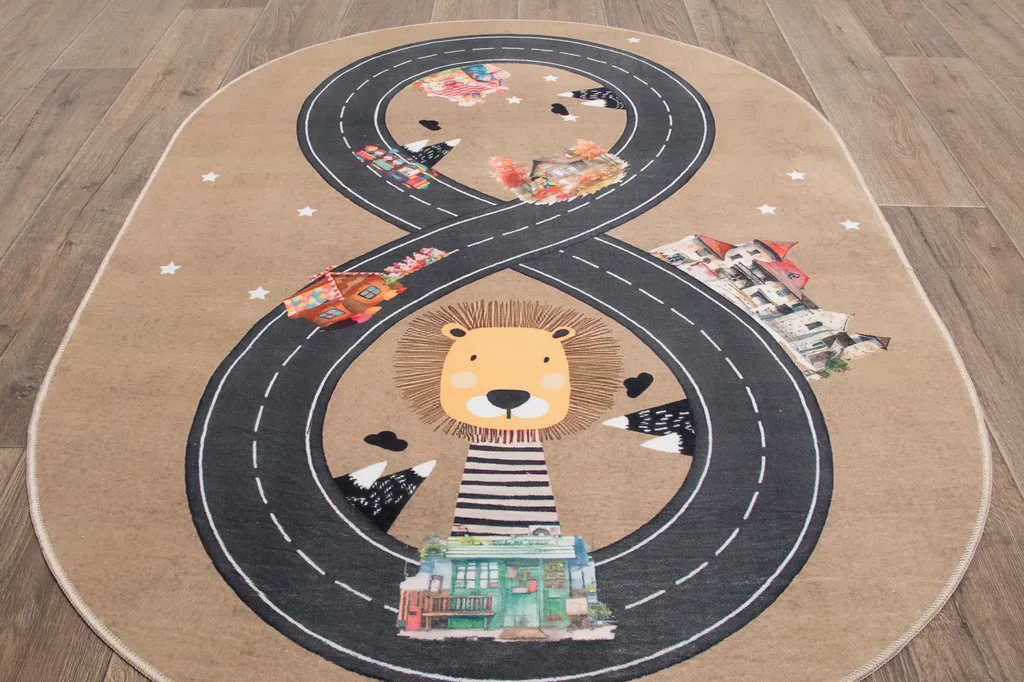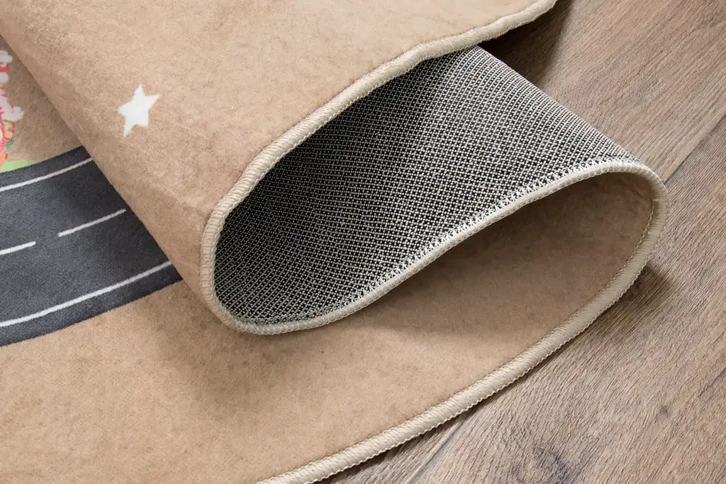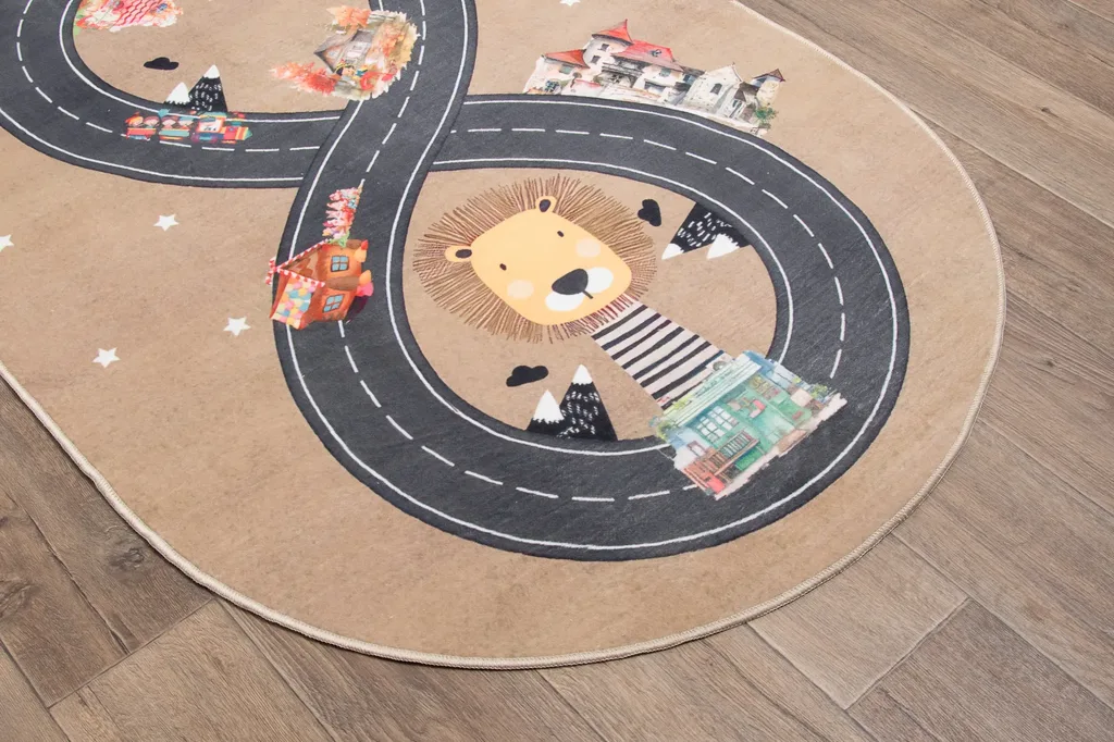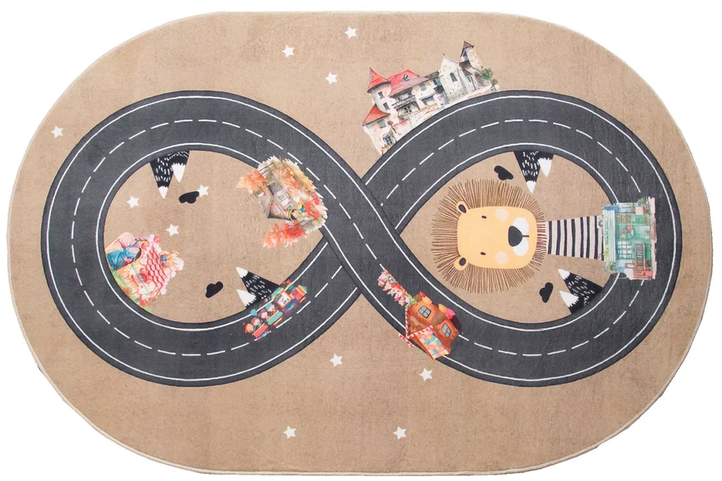 Dywan dziecięcy ze wzorem toru wyścigowego w kształcie ósemki na beżowym tle, otoczonego kolorowymi samochodzikami i elementami miasteczka. Niskie runo ułatwia czyszczenie, a antypoślizgowe wypustki na spodzie zapobiegają przesuwaniu się dywanu, zapewniając bezpieczeństwo podczas zabawy.