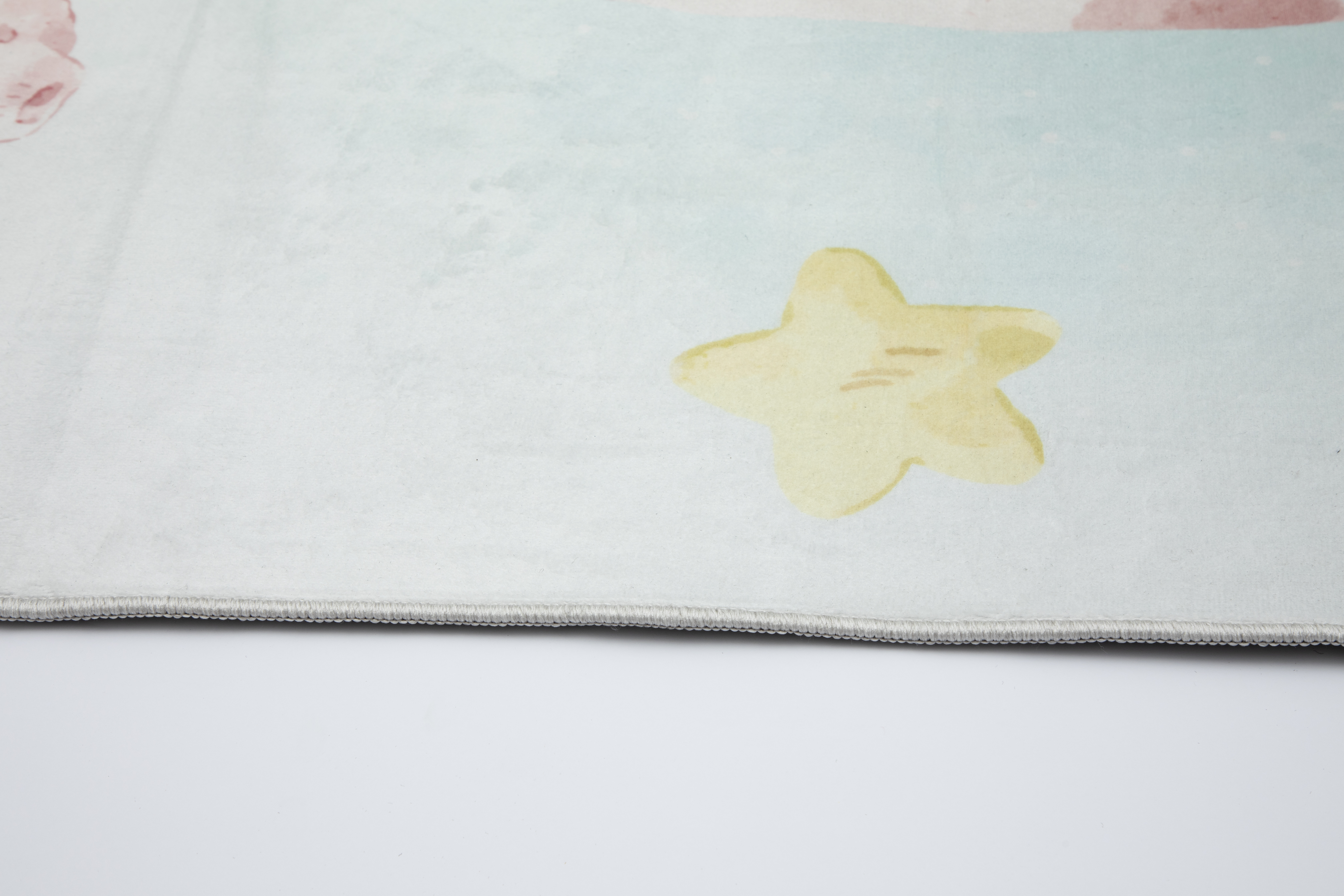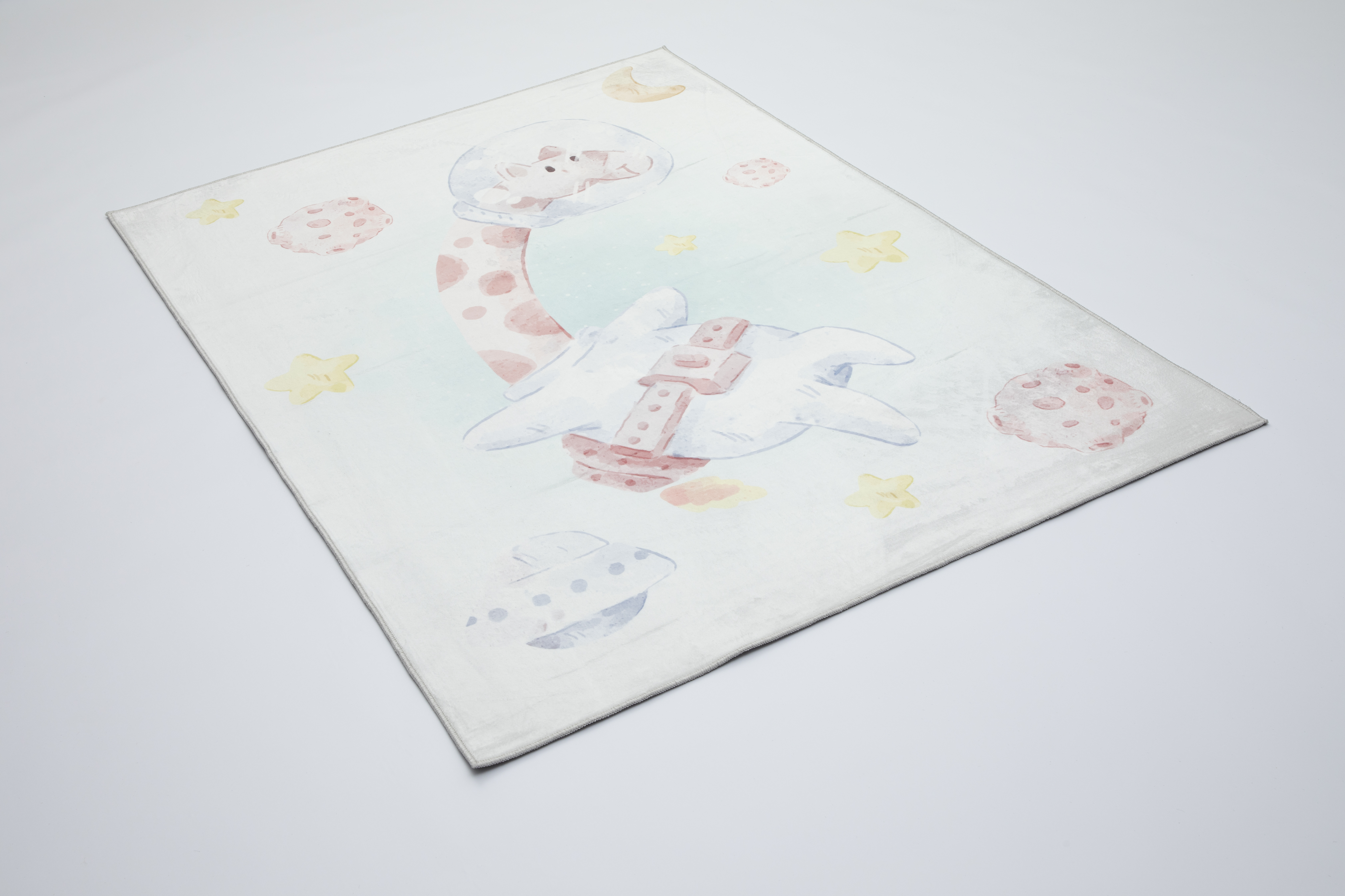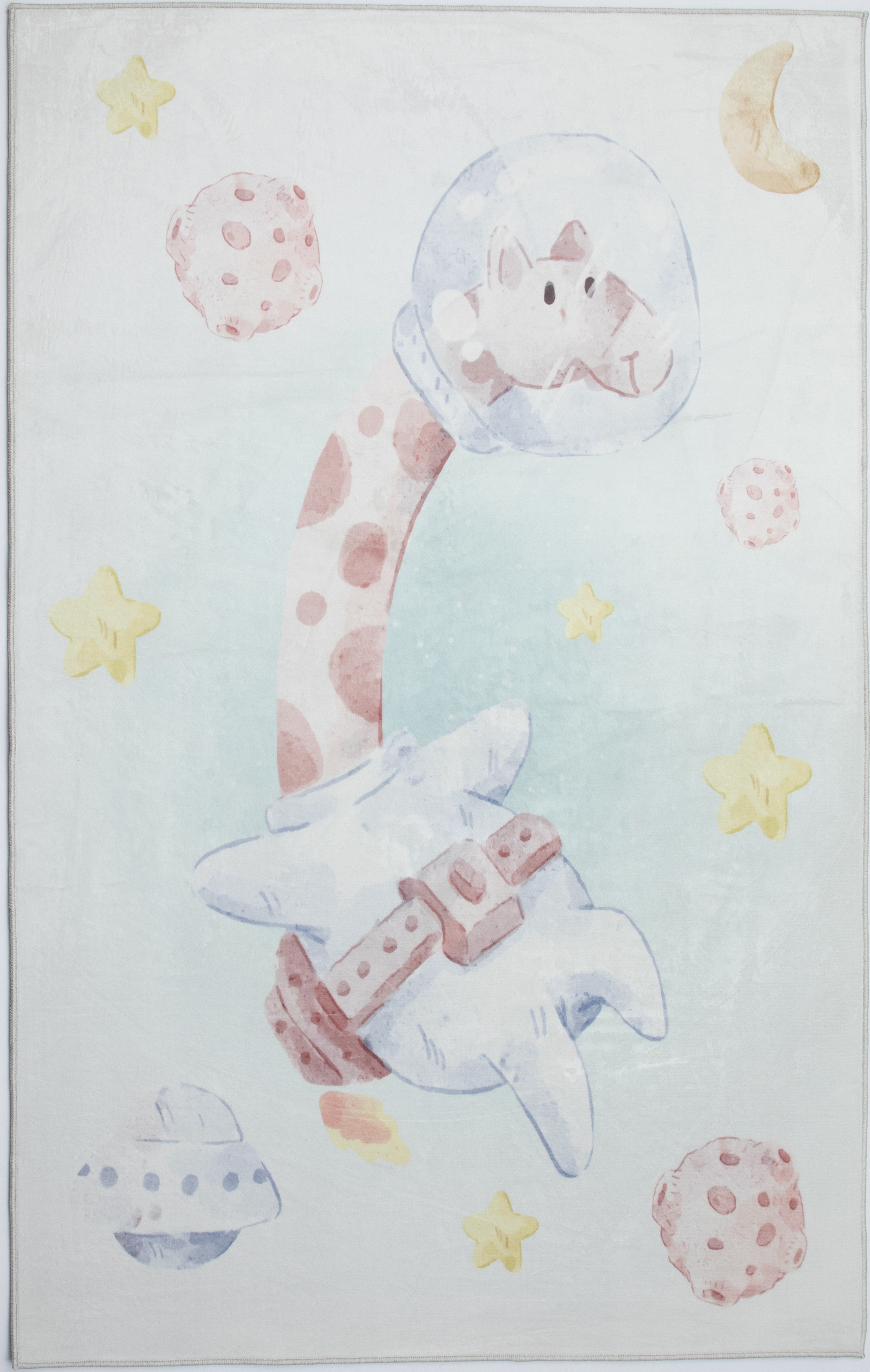 Uroczy dywan dziecięcy w pastelowych odcieniach, z żyrafą latającą w przestrzeniach kosmicznych. Wykonany z uszlachetnionego polipropylenu zapewniającego trwałość oraz łatwość w czyszczeniu.