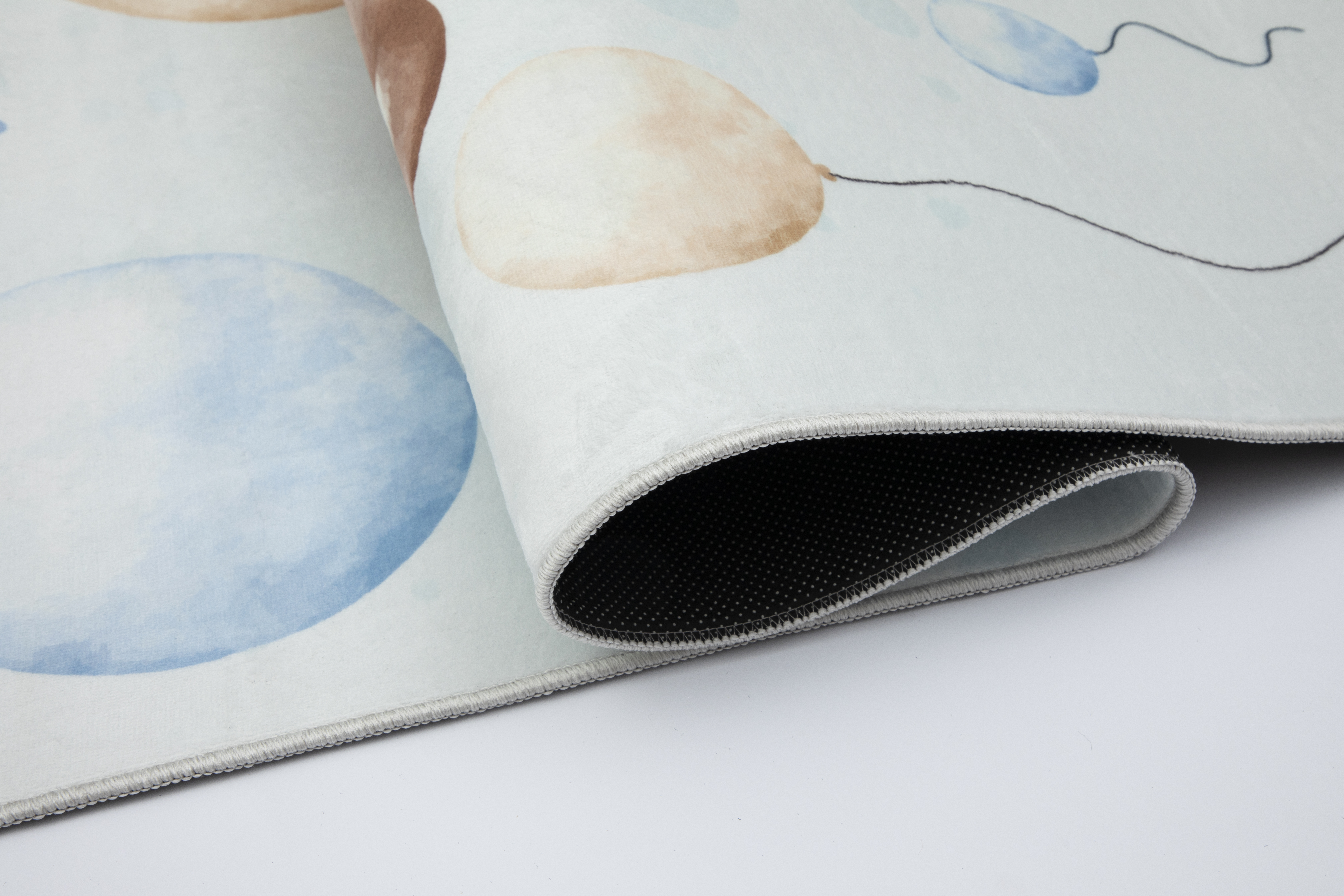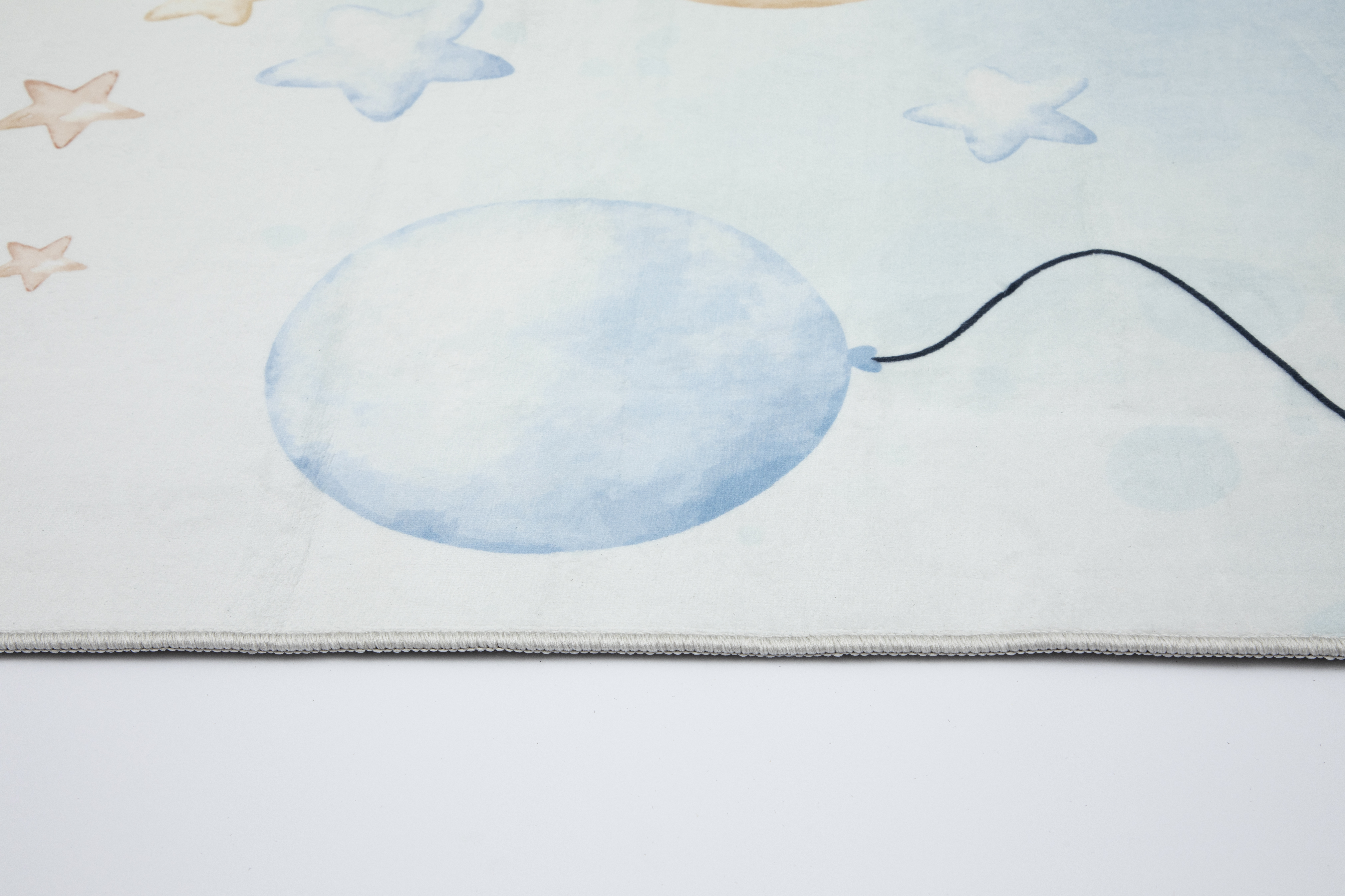 Uroczy dywan dziecięcy w pastelowych odcieniach, z brązowym misiem trzymającym kolorowe baloniki. Wykonany z uszlachetnionego polipropylenu zapewniającego trwałość oraz łatwość w czyszczeniu.