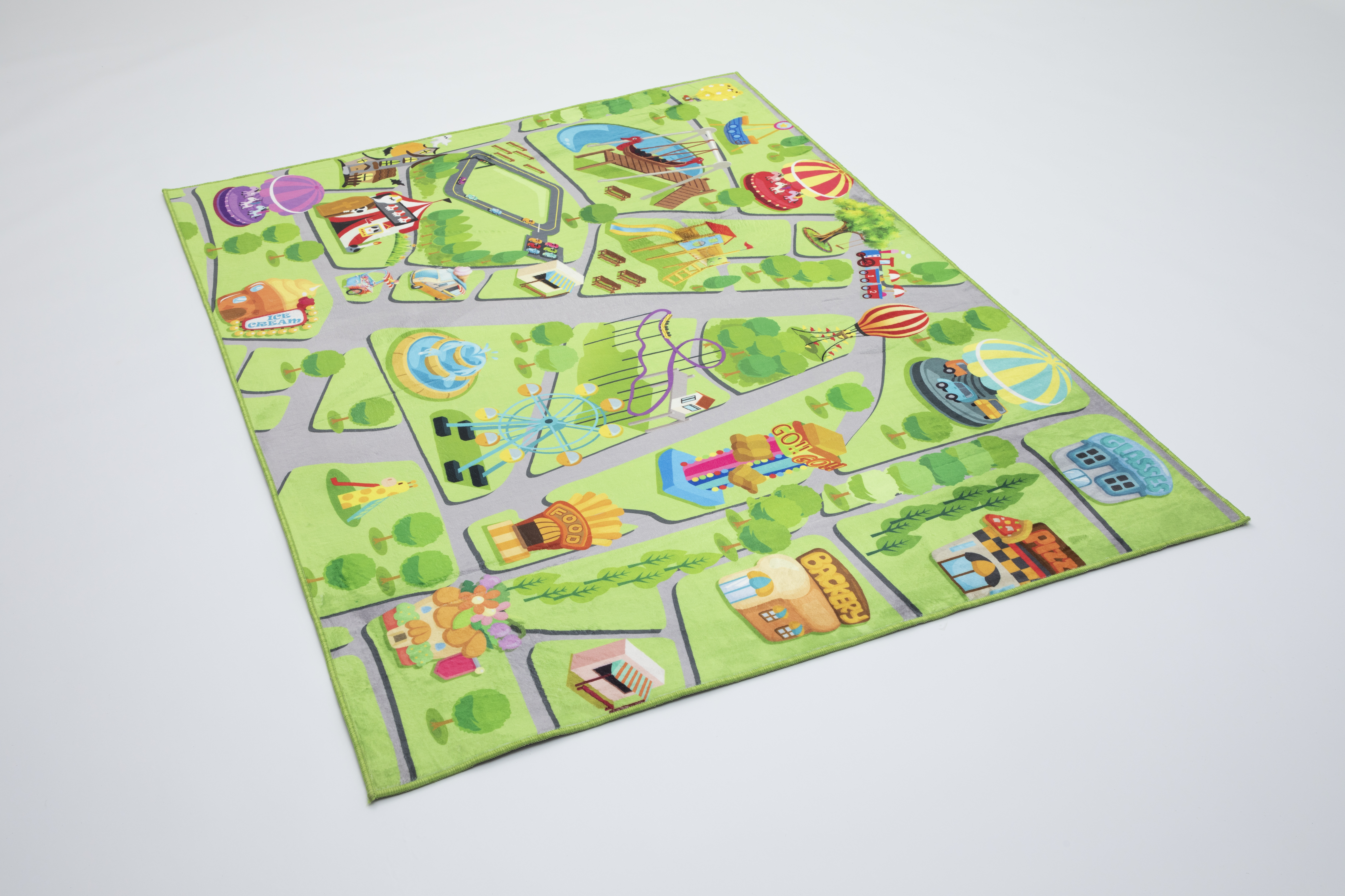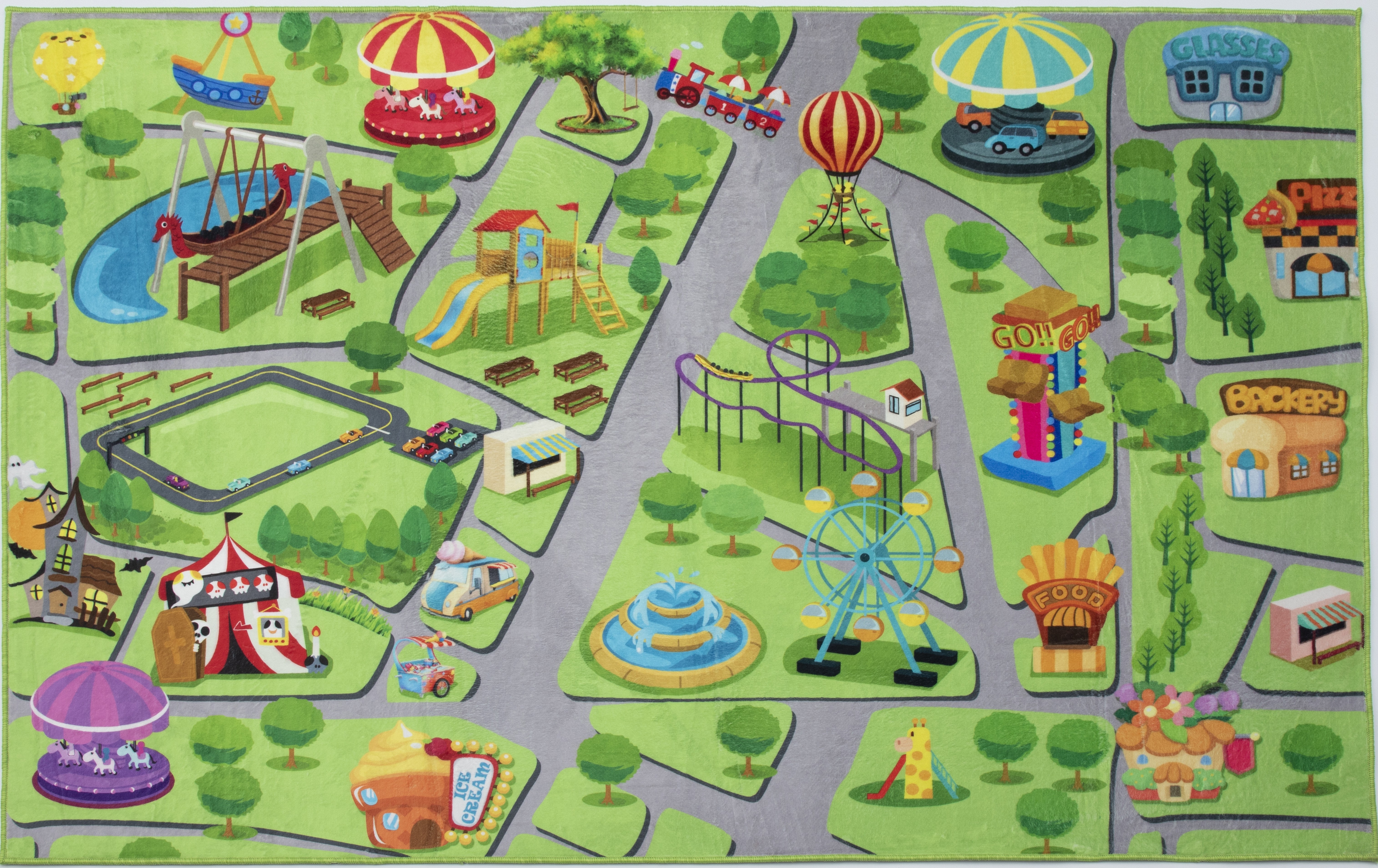 Uroczy dywan dziecięcy w pastelowych odcieniach, z wzorem wesołego miasteczka. Wykonany z uszlachetnionego polipropylenu zapewniającego trwałość oraz łatwość w czyszczeniu.