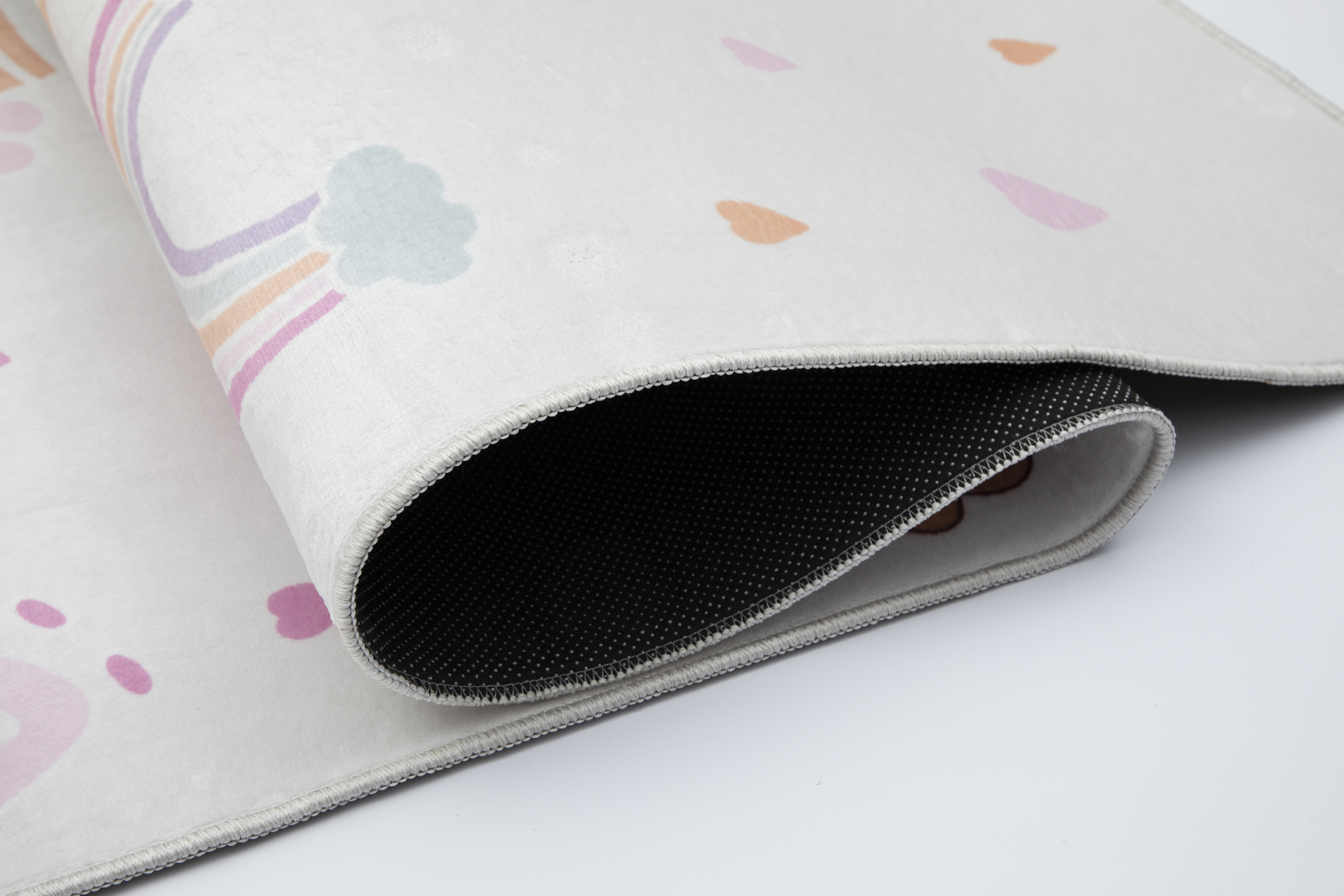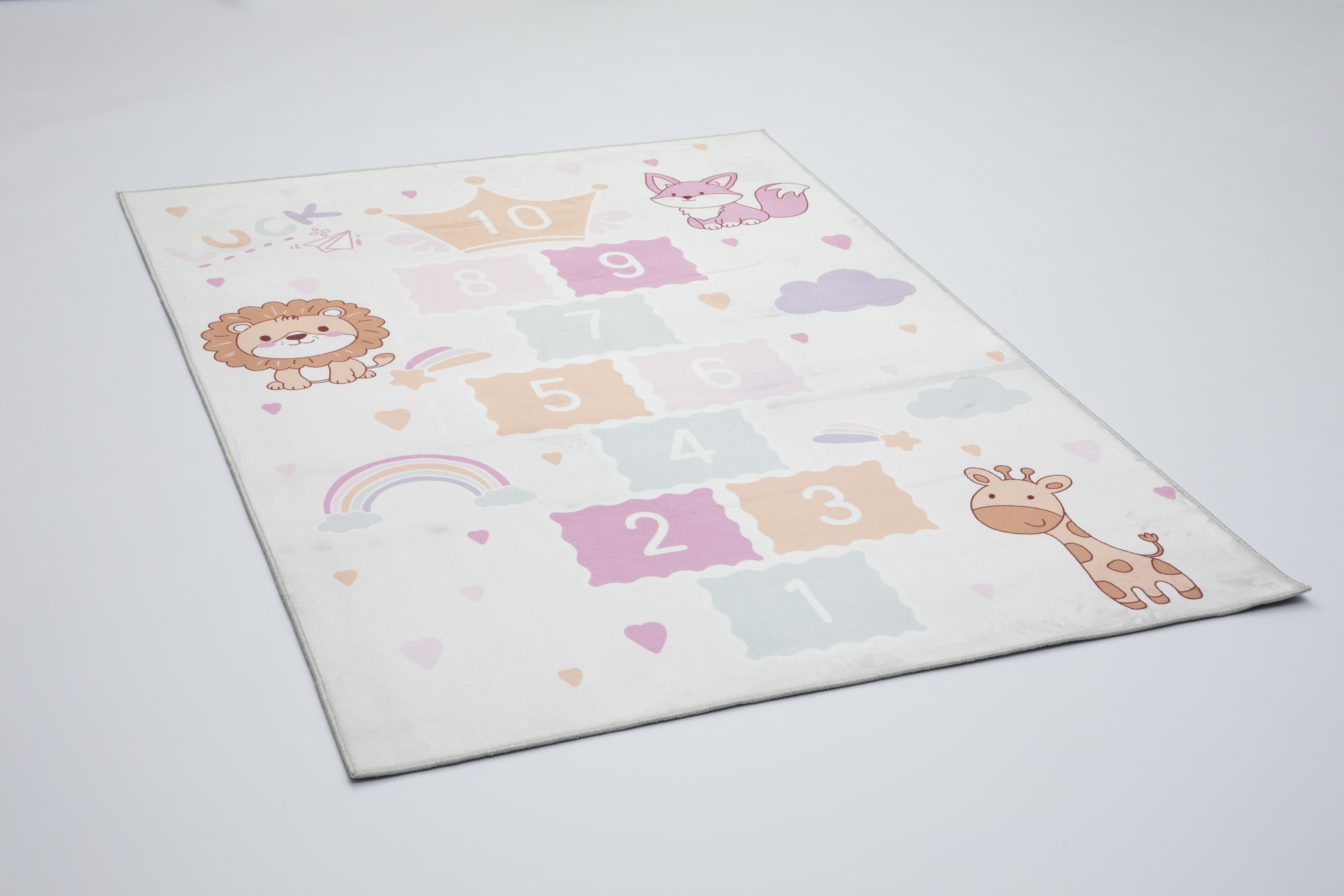 Uroczy dywan dziecięcy w pastelowych odcieniach z wzorem kolorowych klas oraz zwierzątek. Wykonany z uszlachetnionego polipropylenu zapewniającego trwałość oraz łatwość w czyszczeniu.