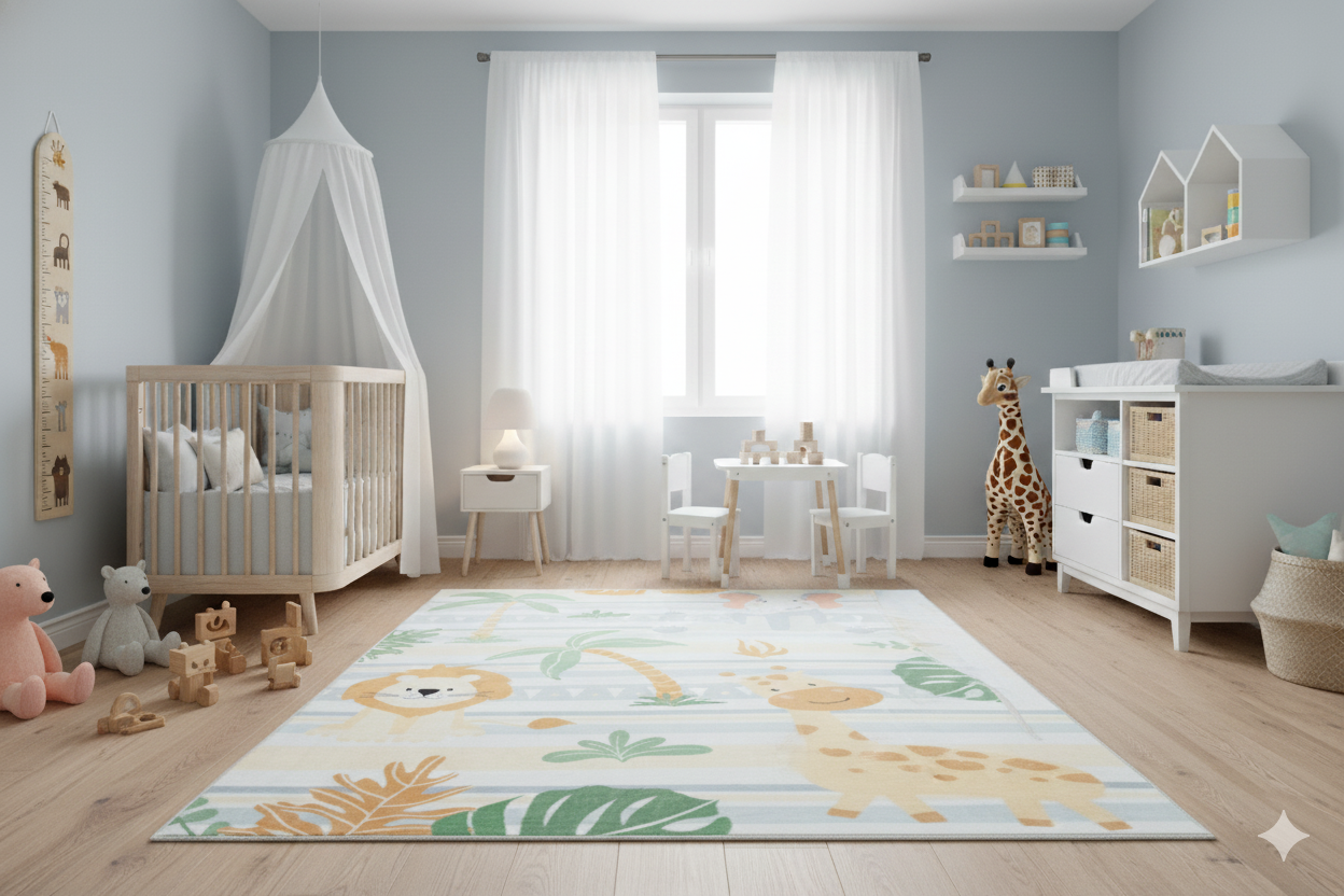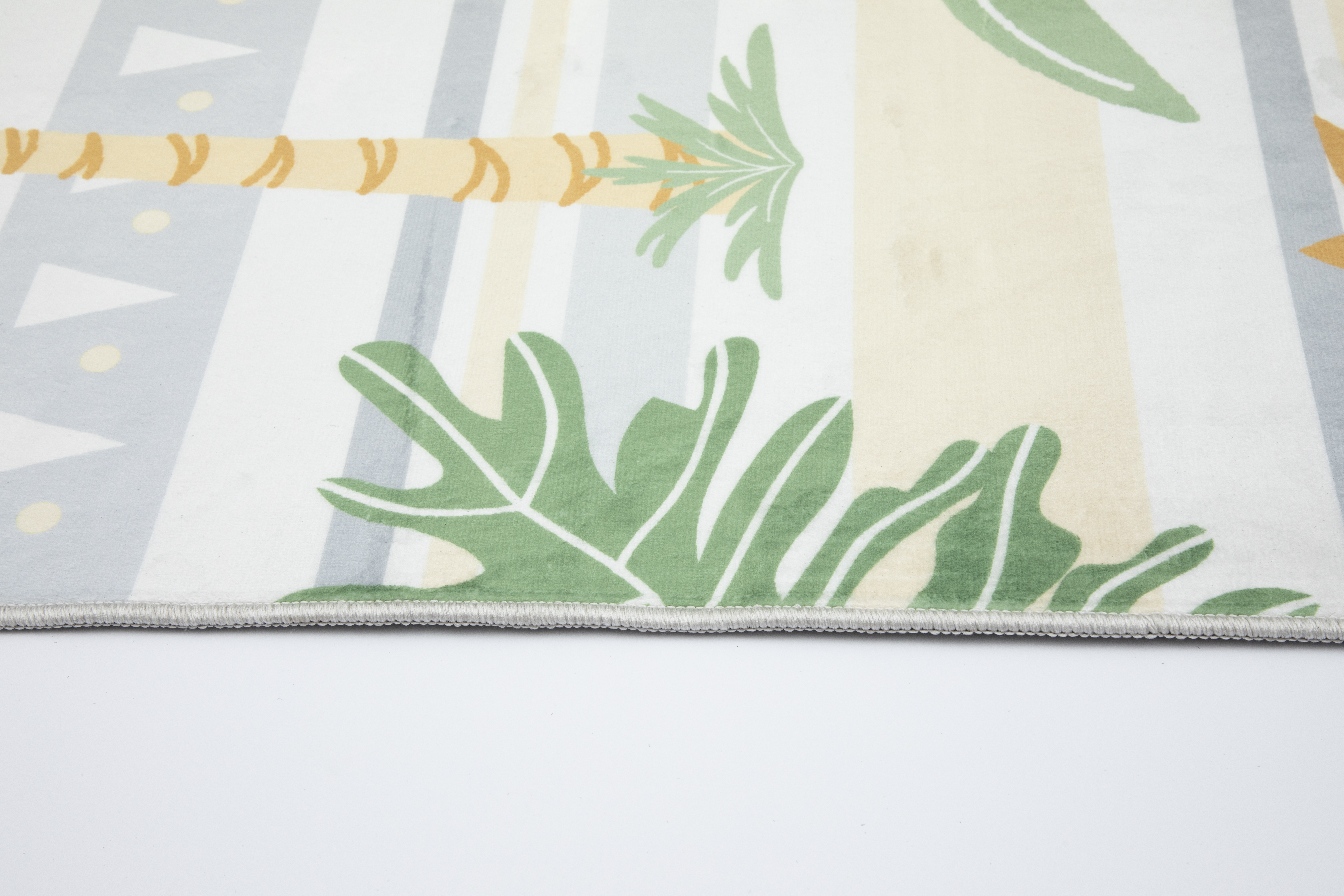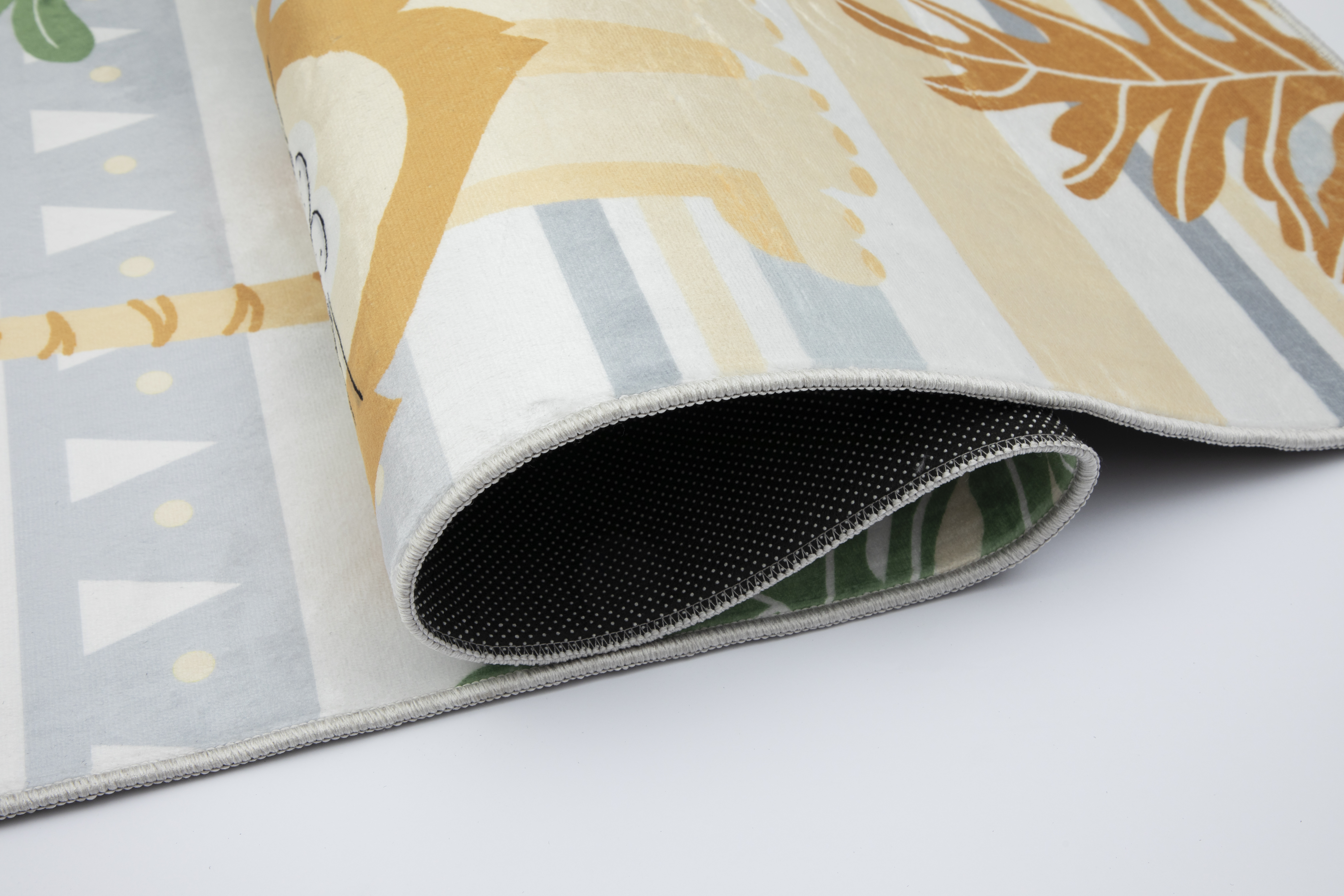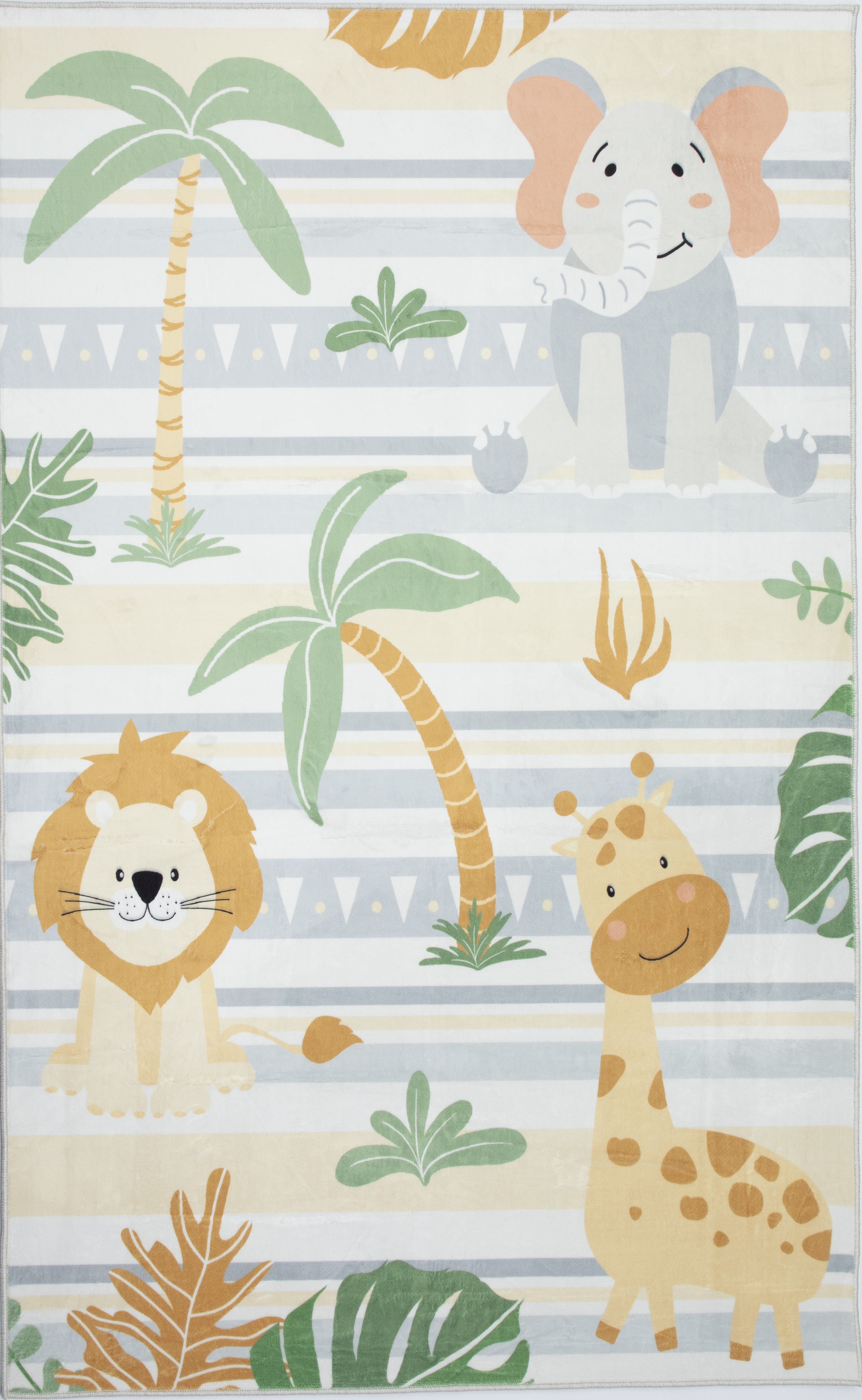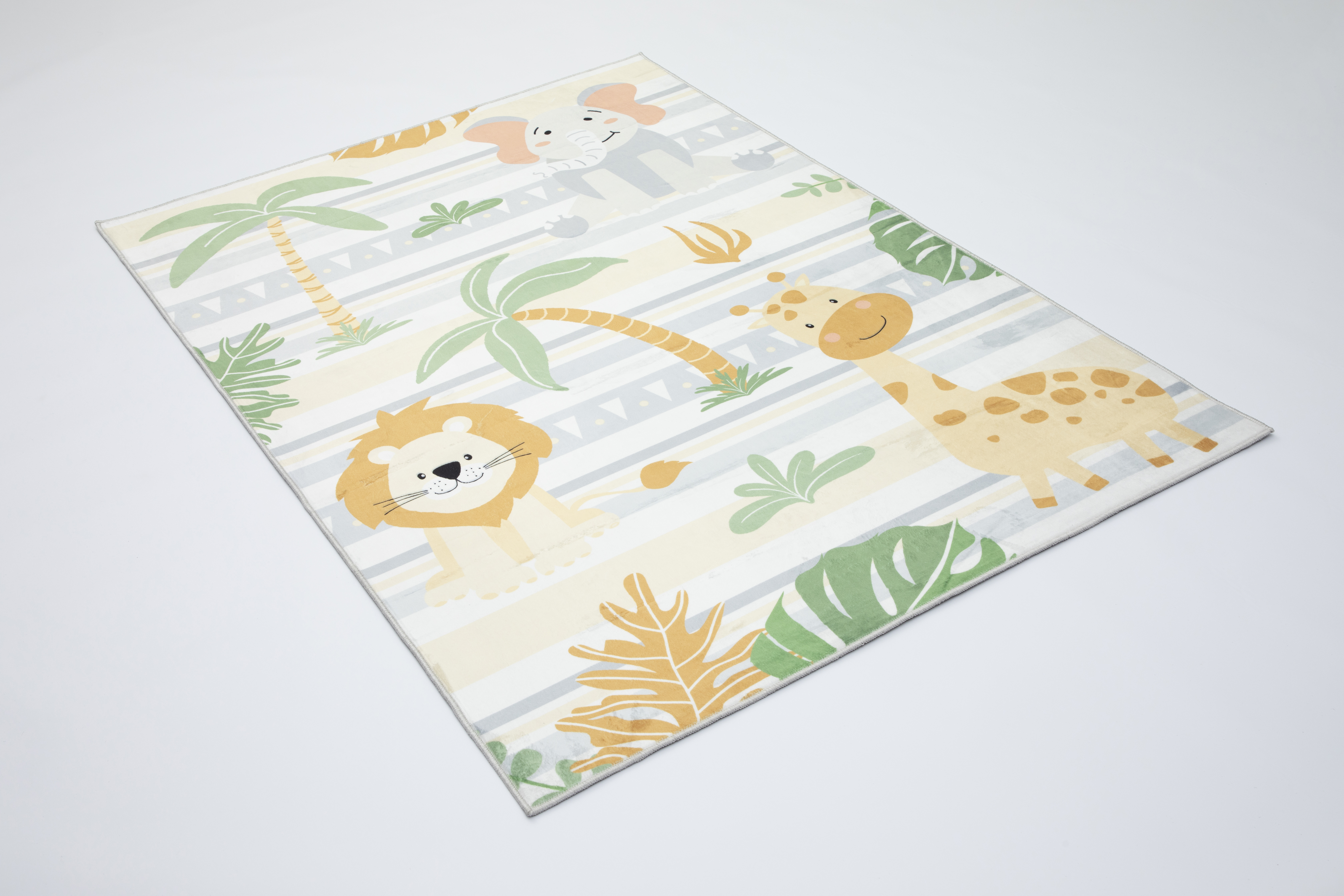 Uroczy dywan dziecięcy w pastelowych odcieniach z wzorem zwierząt w afrykańskiej dżungli. Wykonany z uszlachetnionego polipropylenu zapewniającego trwałość oraz łatwość w czyszczeniu.