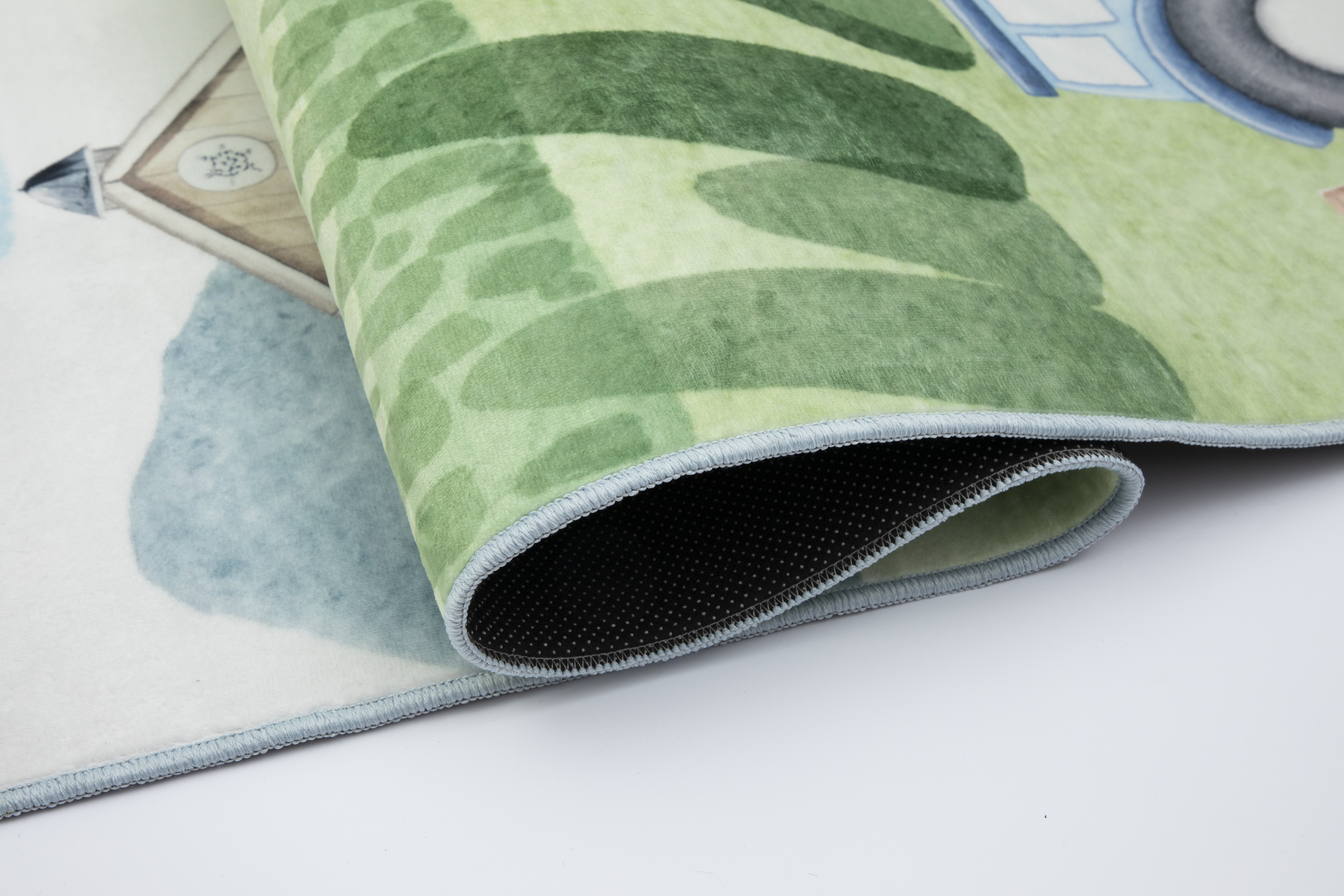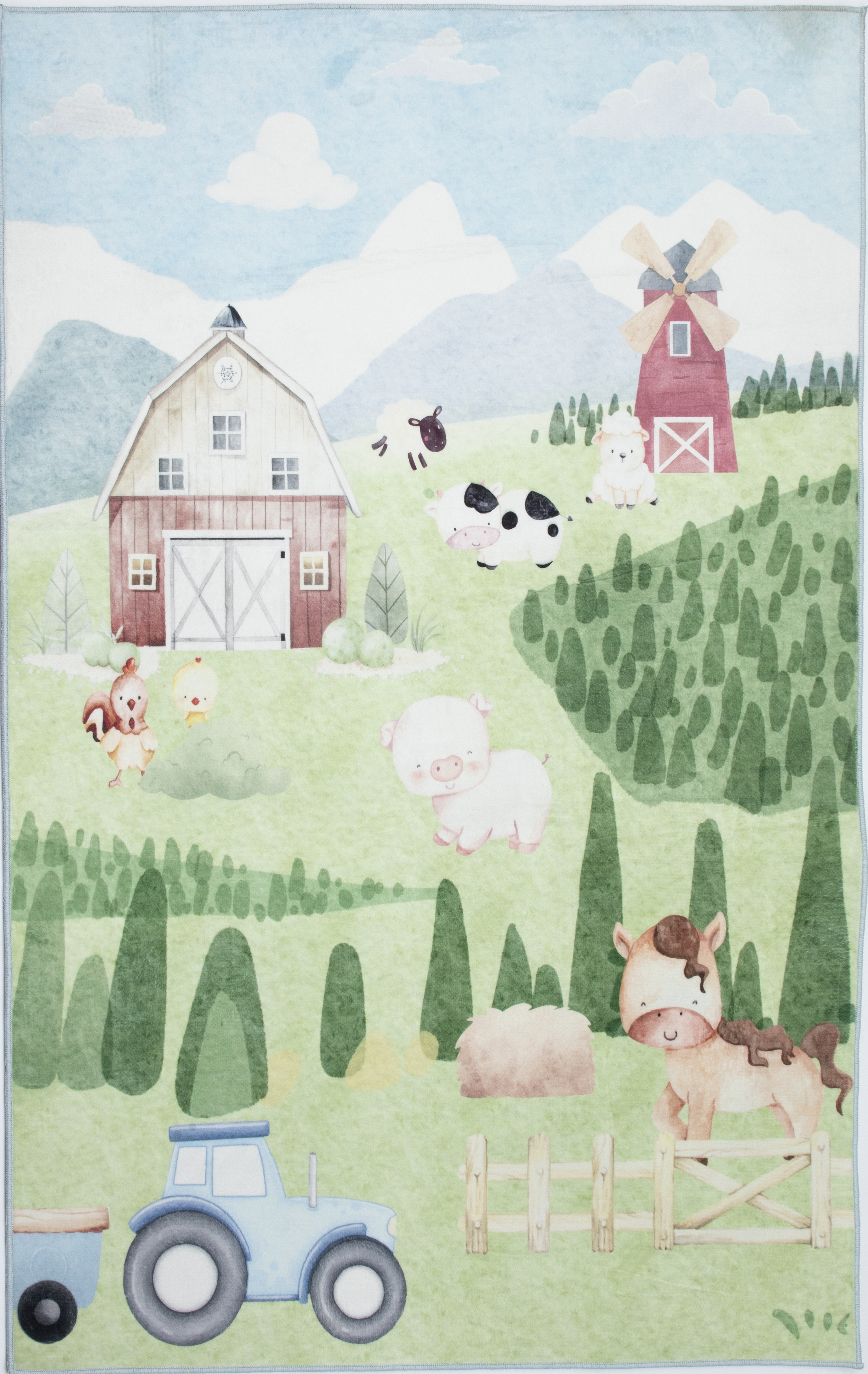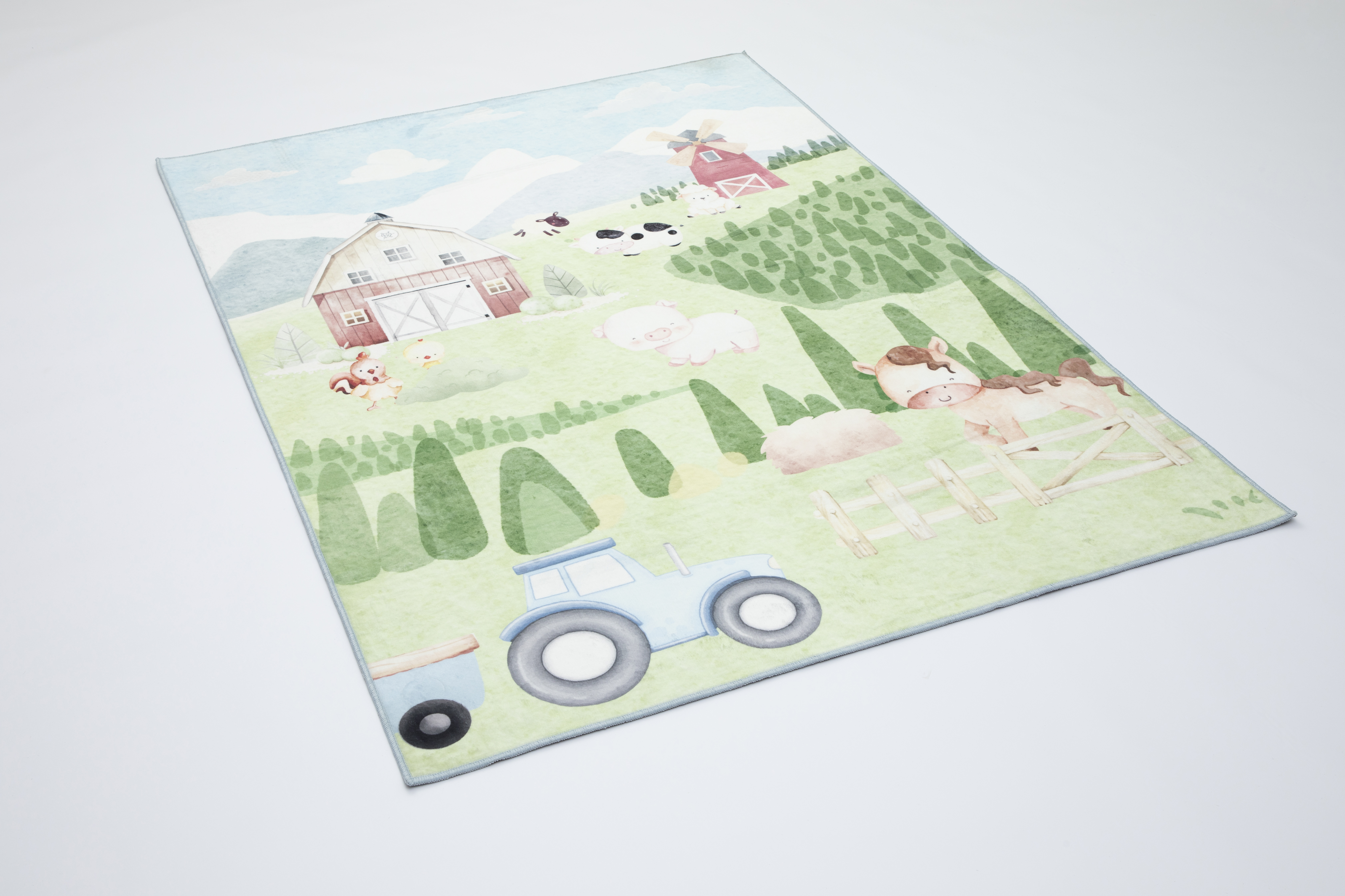 Uroczy dywan dziecięcy w pastelowych odcieniach, z wzorem przedstawiającym wiejski krajobraz wraz ze zwierzętami. Wykonany z uszlachetnionego polipropylenu zapewniającego trwałość oraz łatwość w czyszczeniu.