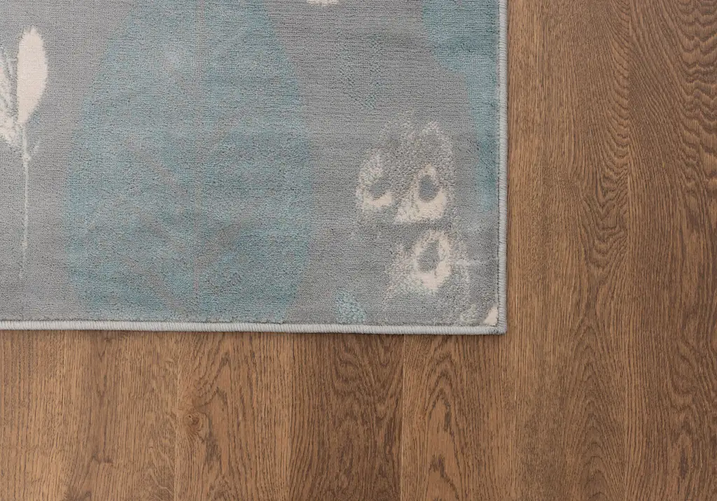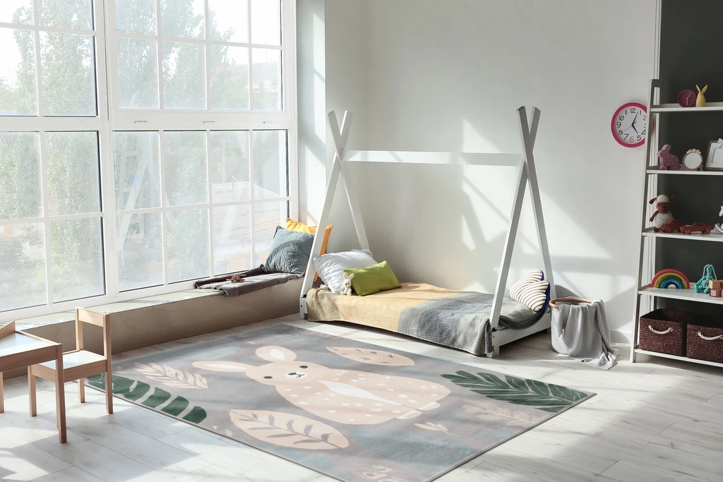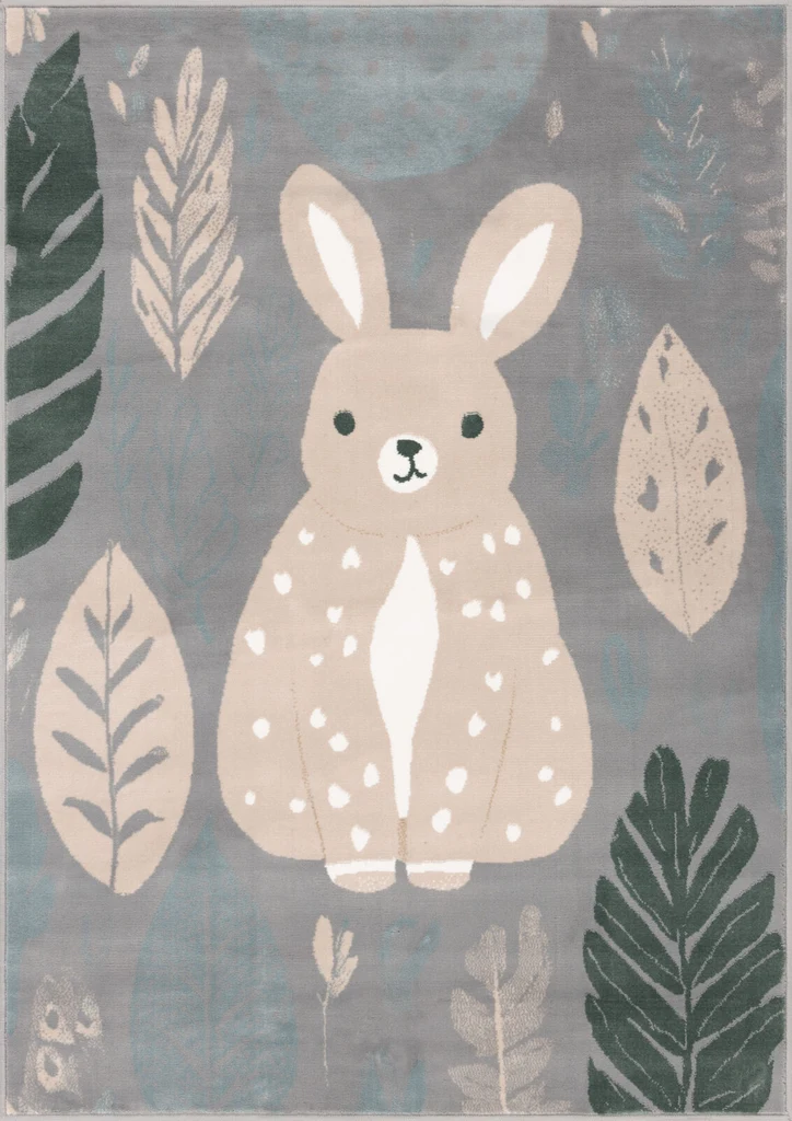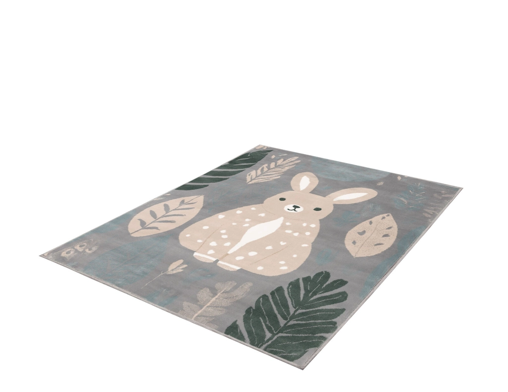 Dywan z beżowym króliczkiem na szarym tle, ozdobiony delikatnymi roślinkami. Wykonany z wysokiej jakości przędzy polipropylenowej Heat Set – miękki, przyjemny w dotyku i odporny na ścieranie. Idealny do pokoju dziecięcego, łączy urokliwy design z praktycznym zastosowaniem.