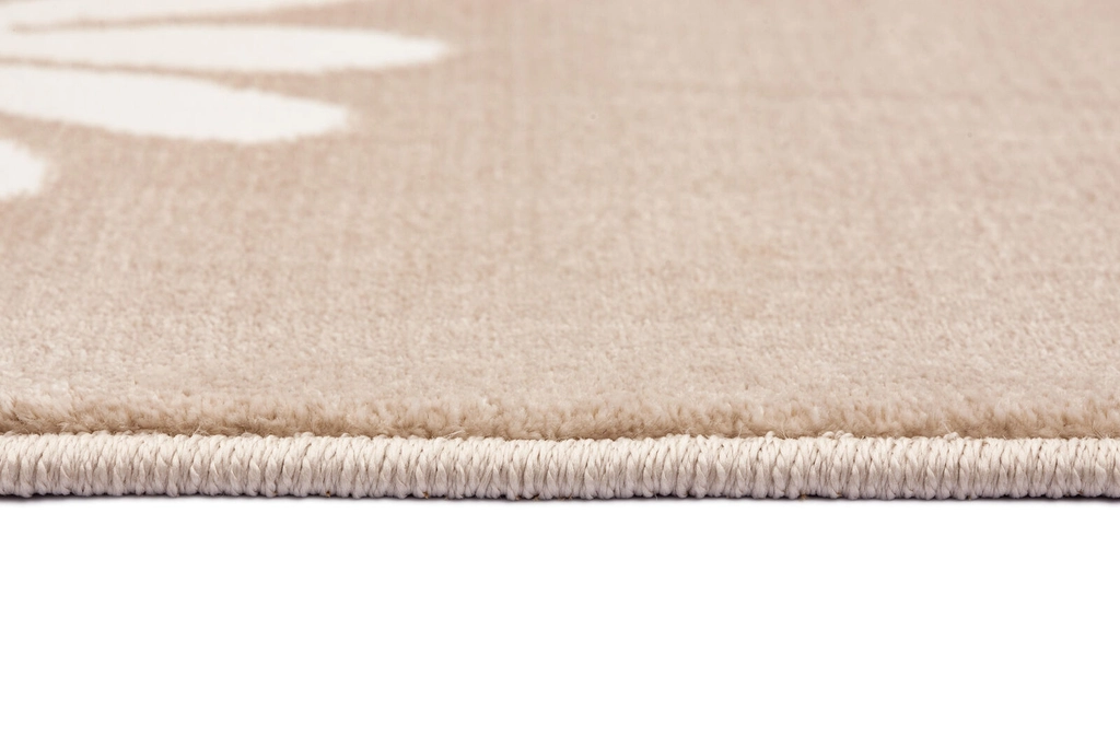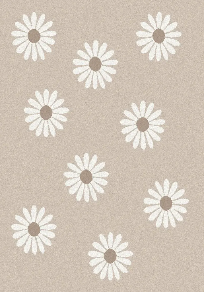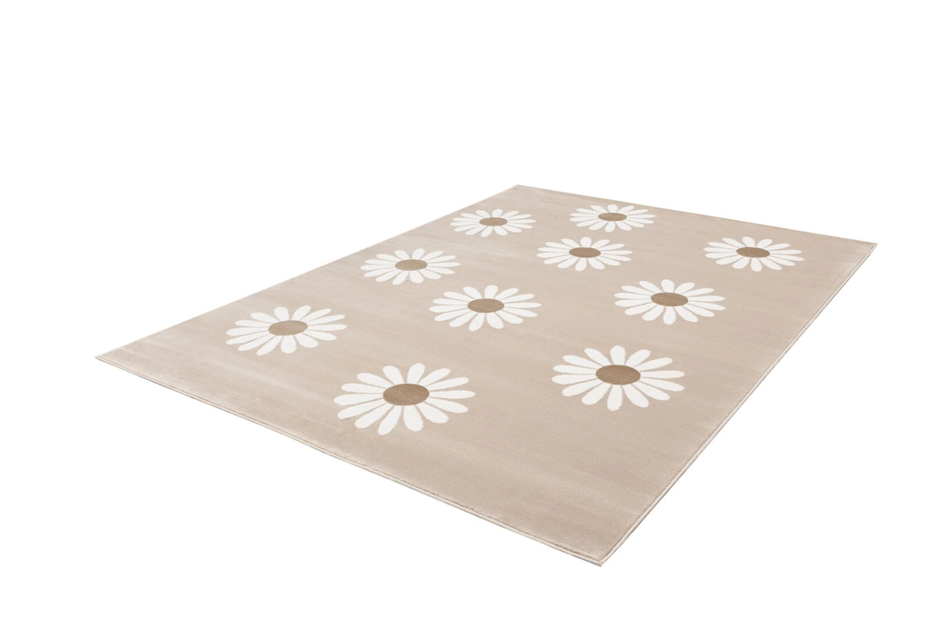 Wzór dywanu przedstawia równomiernie rozmieszczone stokrotki z białymi płatkami i beżowymi środkami na beżowym tle. Wykonany z wysokiej jakości przędzy polipropylenowej Heat Set – miękki, przyjemny w dotyku i odporny na ścieranie. Idealny do pokoju dziecięcego, łączy urokliwy design z praktycznym zastosowaniem.