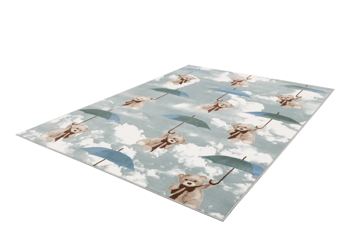 Dywan z krótkim runem, wykonany z łatwej w czyszczeniu przędzy polipropylenowej. Krótkie runo sprawdzi się doskonale nawet w domach z czworonogami. Uroczy wzór misiów z parasolkami z pewnością wywoła uśmiech na twarzy każdego maluszka.