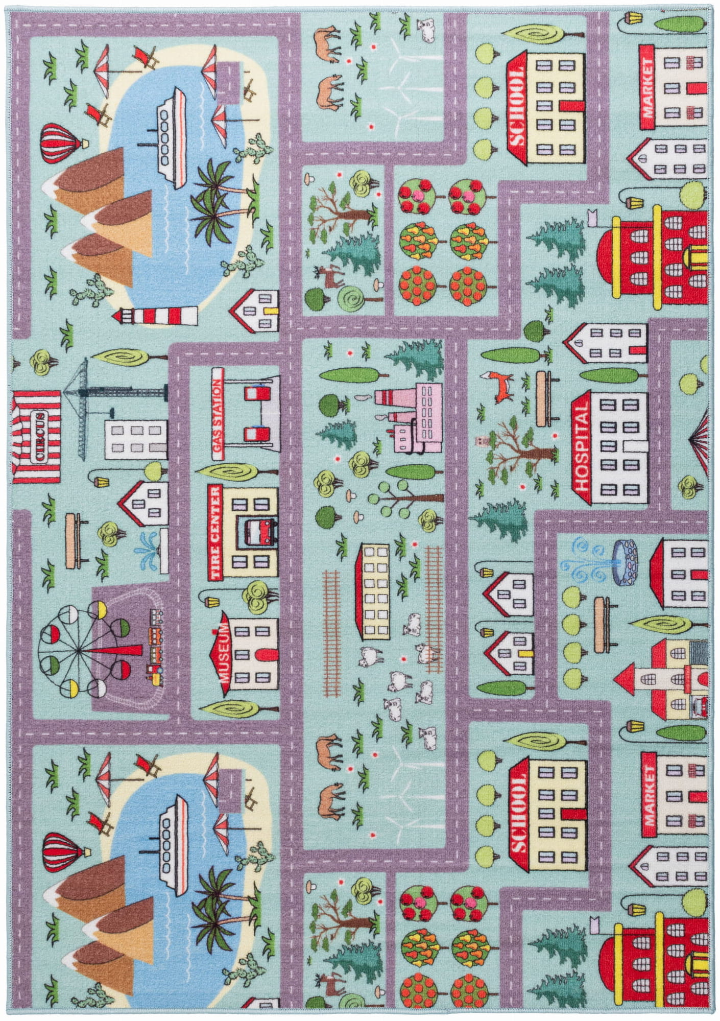 Dywan ten to gwarancja radosnej dziecięcej zabawy na kolorowej makiecie miasta.