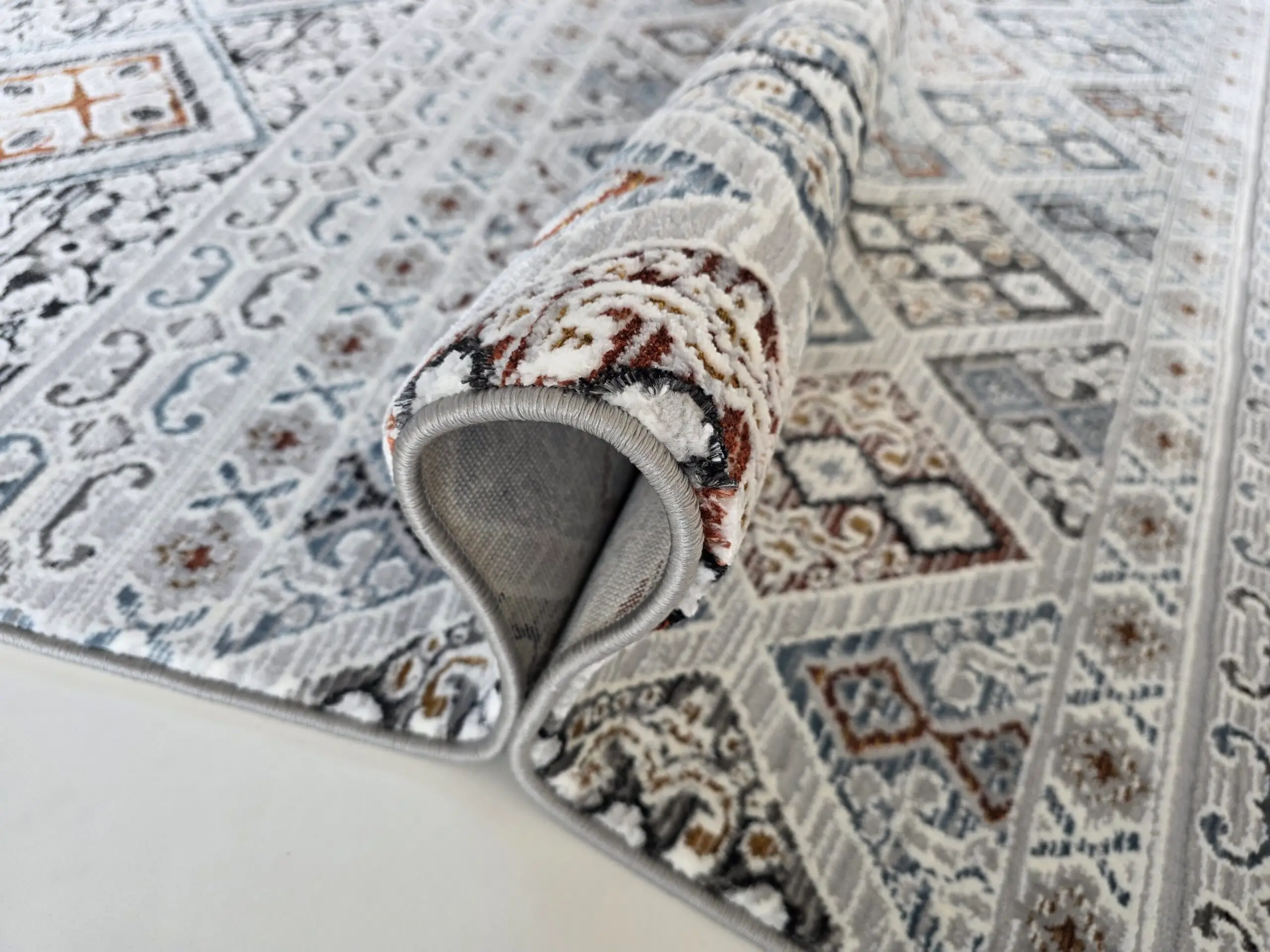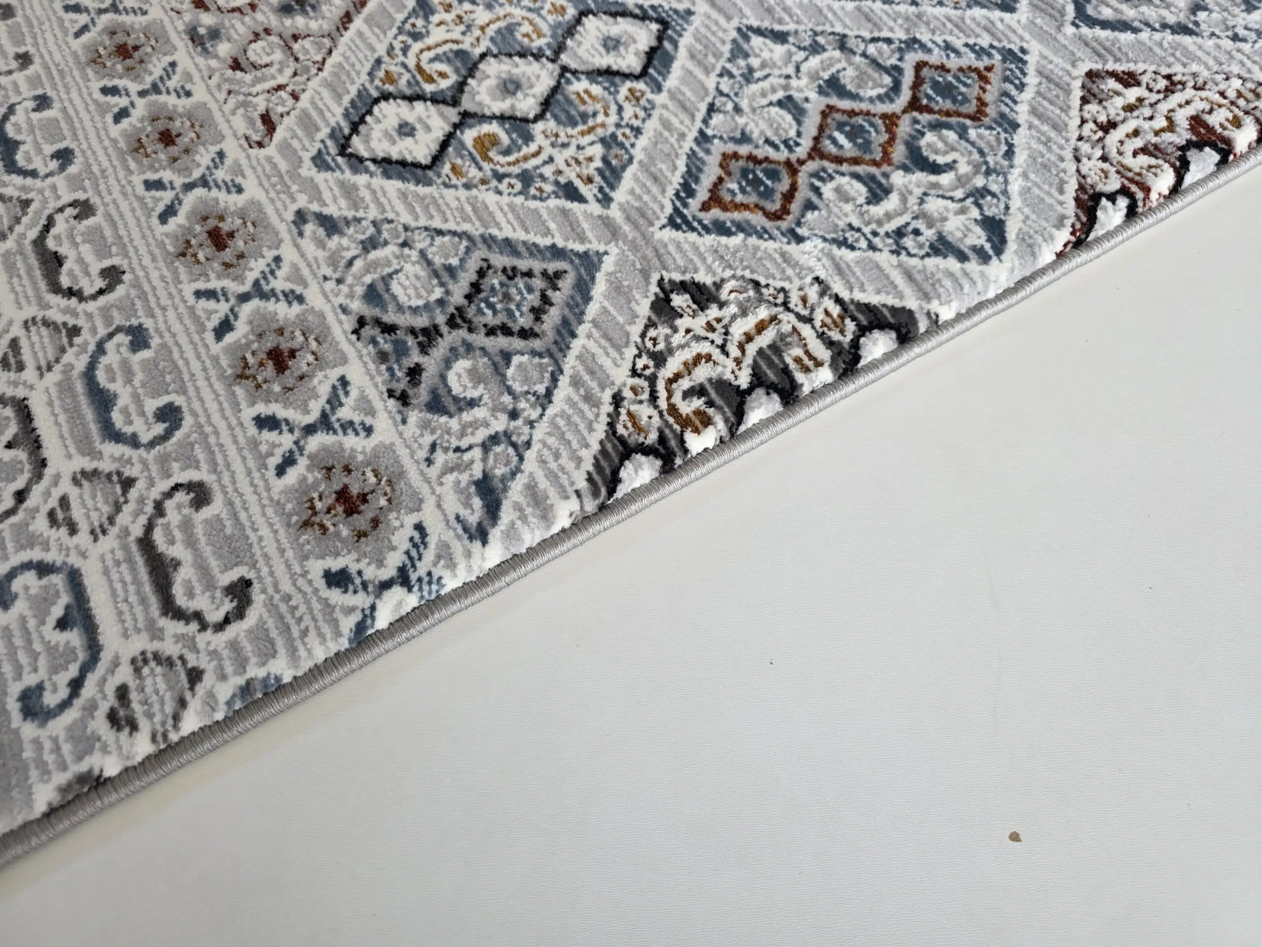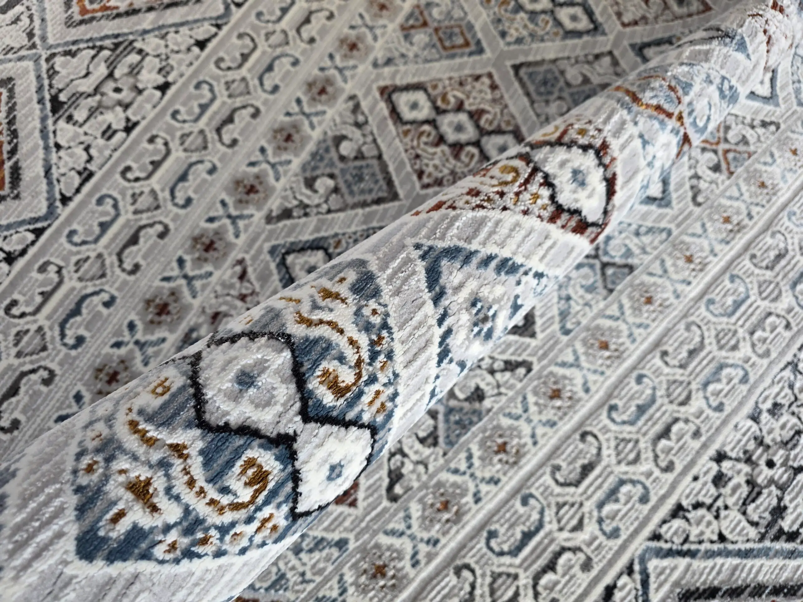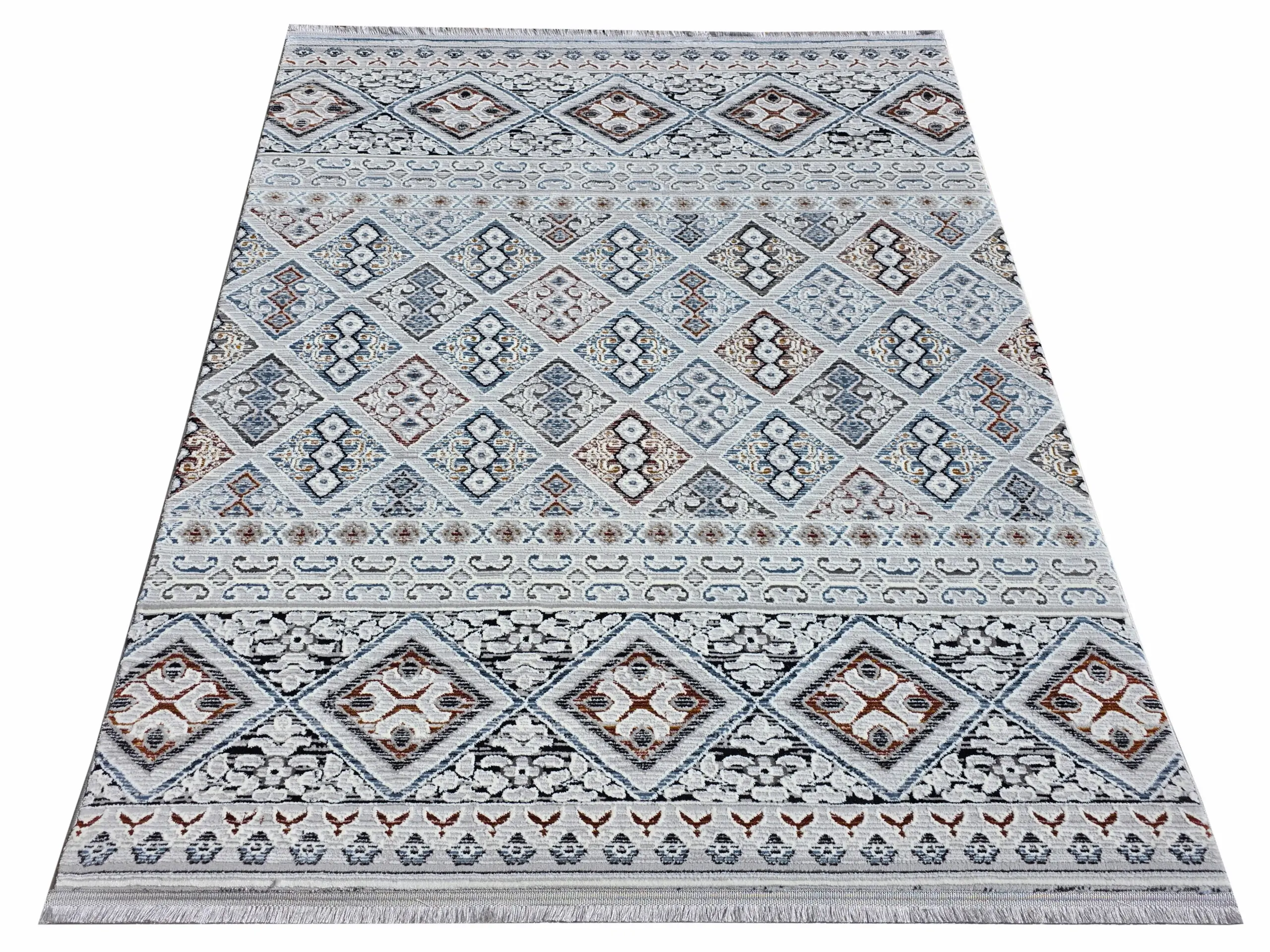 Geometryczny dywan wykończony frędzlami wpisuje się w styl etno. Dwupoziomowe runo tworzy trójwymiarowy efekt 3d, a całości dopełnia delikatny połysk runa. Ze względu na rodzaj użytego do ich produkcji włókna oraz gęstości runa dywany te są bardzo praktyczne w użytkowaniu.
