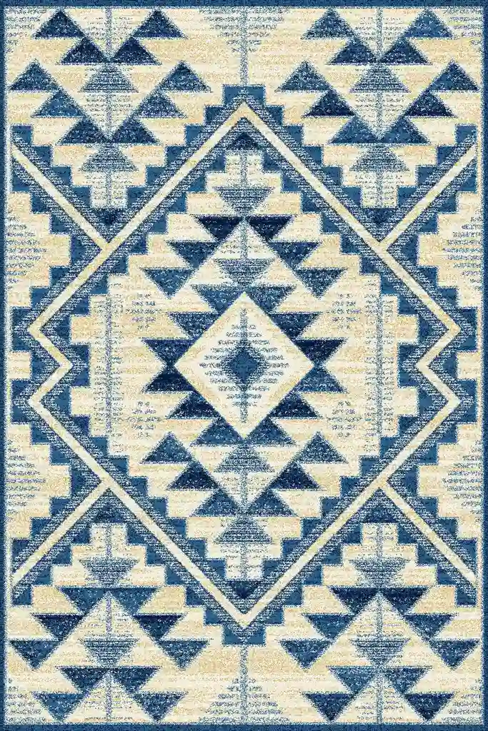 Dywan w azteckie wzory w odcieniach niebieskiego koloru, inspirowany tradycyjnym kilimem, został precyzyjnie utkany maszynowo z wysokiej jakości włókna heat-set. Dzięki temu wyróżnia się wyjątkową trwałością, odpornością na codzienne użytkowanie oraz łatwością w utrzymaniu czystości.