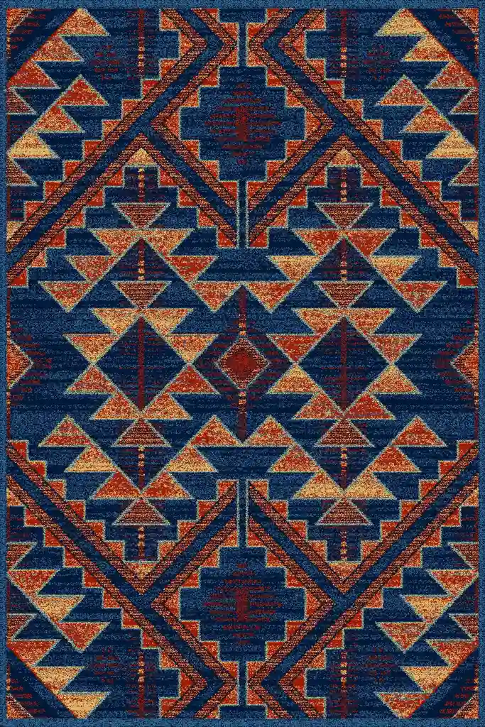 Dywan w azteckie wzory w niebieskim kolorze, inspirowany tradycyjnym kilimem, został precyzyjnie utkany maszynowo z wysokiej jakości włókna heat-set. Charakteryzuje się wyjątkową trwałością, odpornością na codzienne użytkowanie oraz łatwością w utrzymaniu czystości