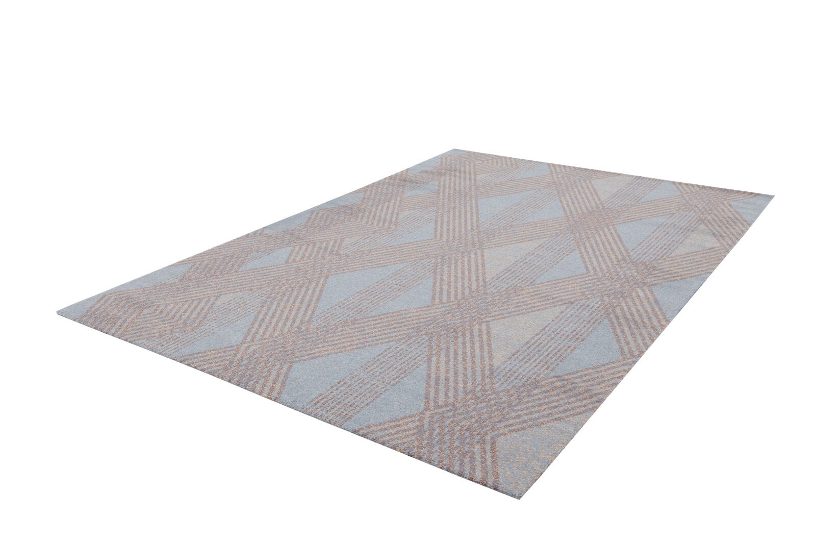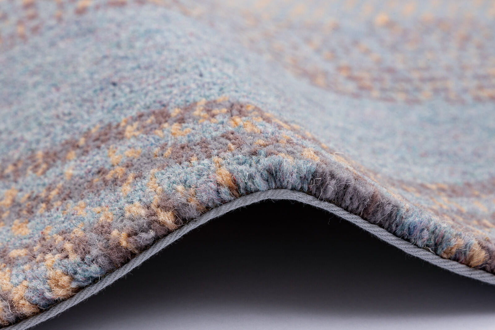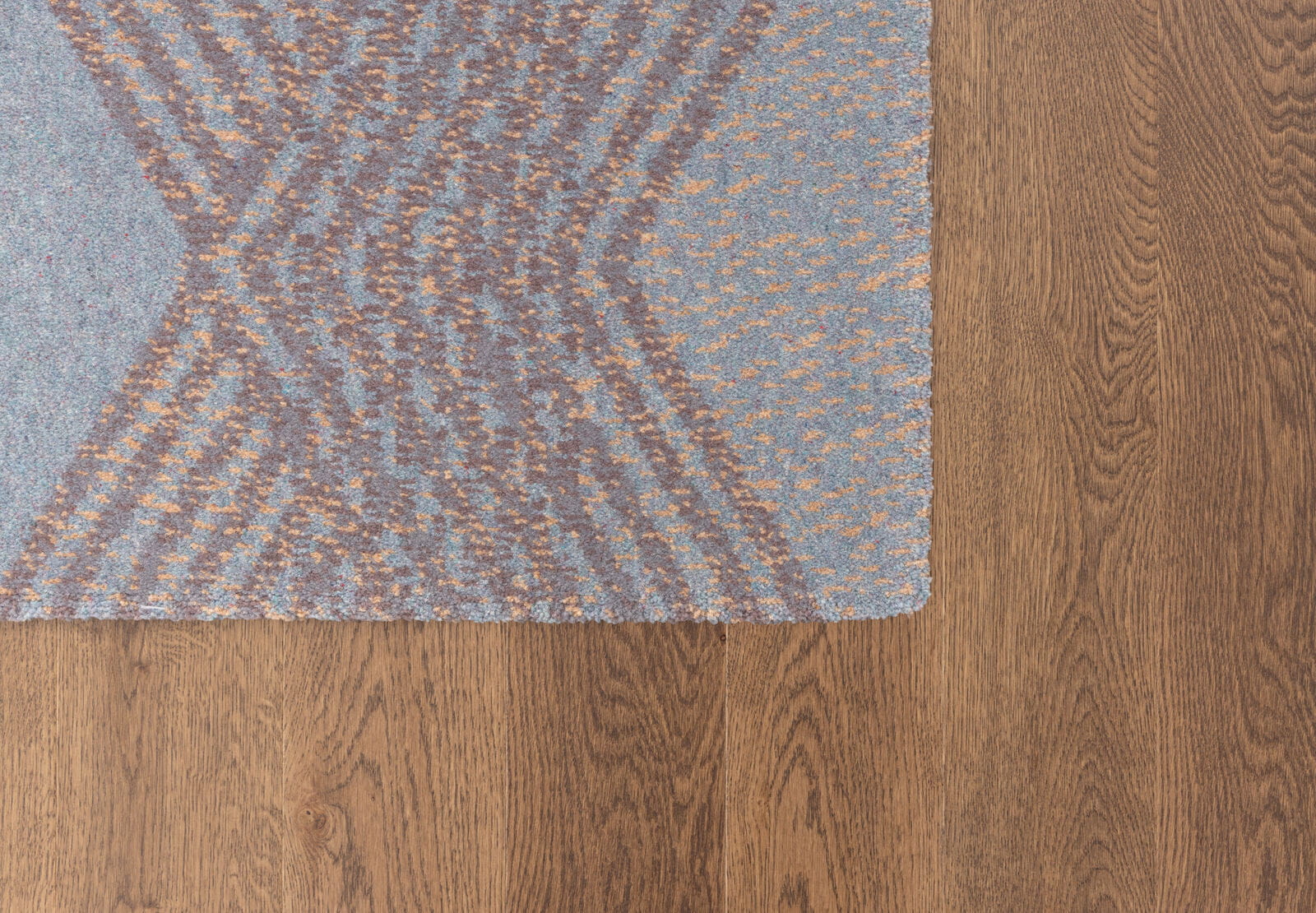 Nowoczesny dywan z geometrycznym wzorem w paski, zestawionym z tłem w odcieniach morskiego błękitu. Wzór nadaje wnętrzu dynamizmu, jest idealny dla nowoczesnych przestrzeni. Wykonany z luksusowej wełny owczej, gwarantującej jego trwałość i komfort.