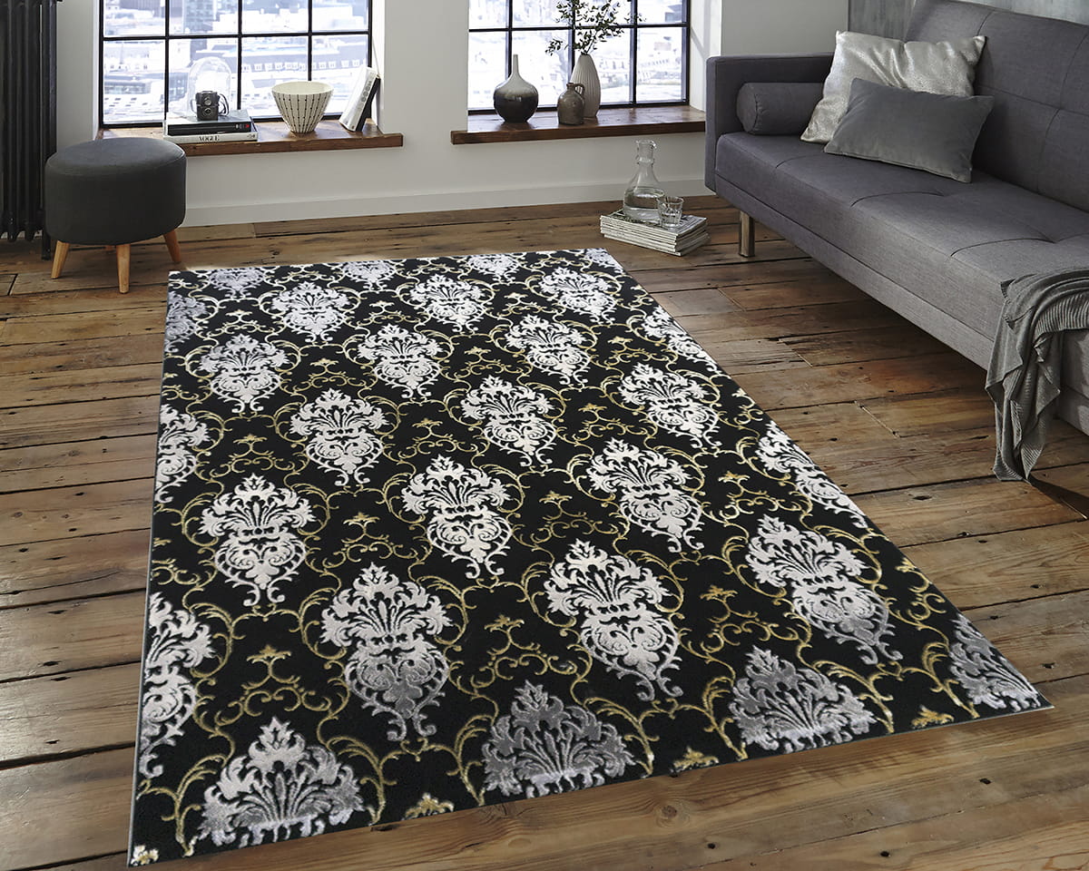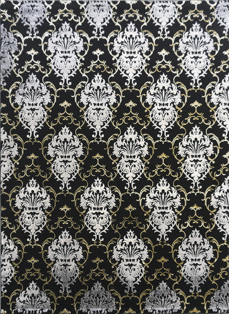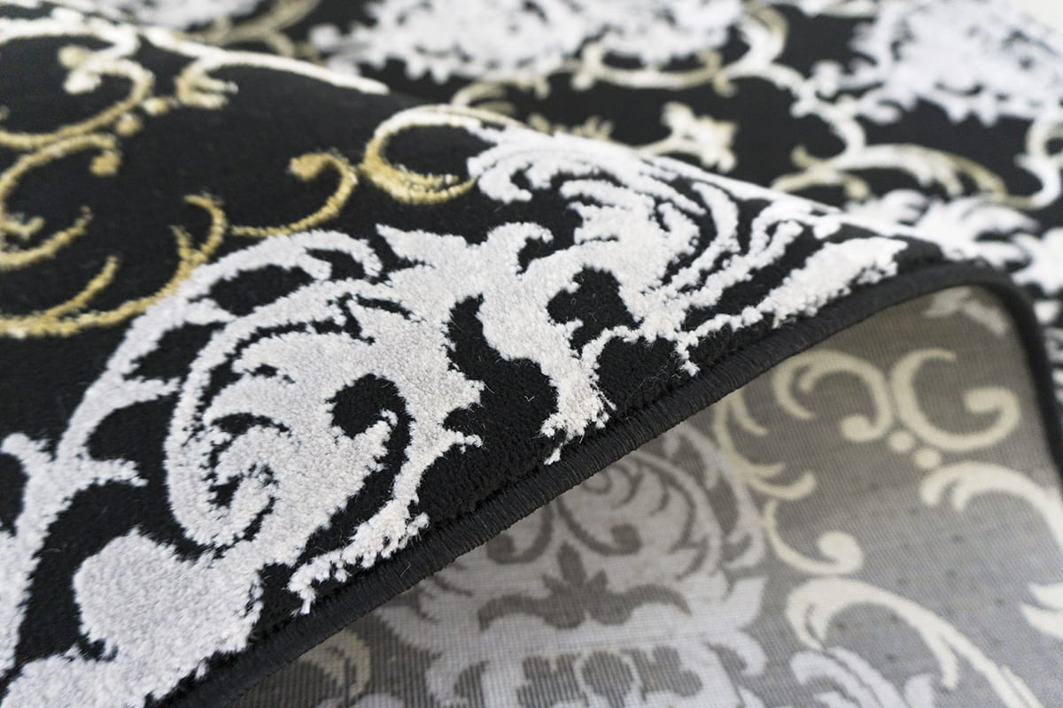 Dywan o powtarzalnym, symetrycznym wzorze przypominającym ornamenty roślinne lub klasyczne motywy damasceńskie. Utrzymany jest w stonowanej kolorystyce czerni, bieli i szarości.Wykonany z dwóch rodzajów przędzy syntetycznej o dobrych parametrach jakościowych. Włókno poliestrowe nadaje mu delikatnego połysku i miękkości.