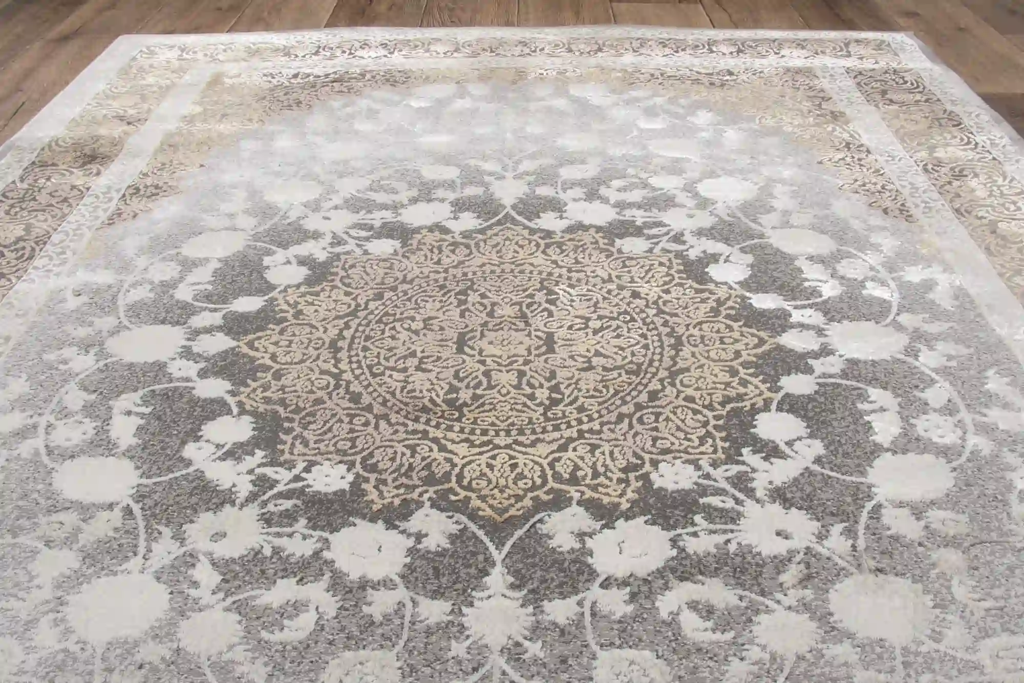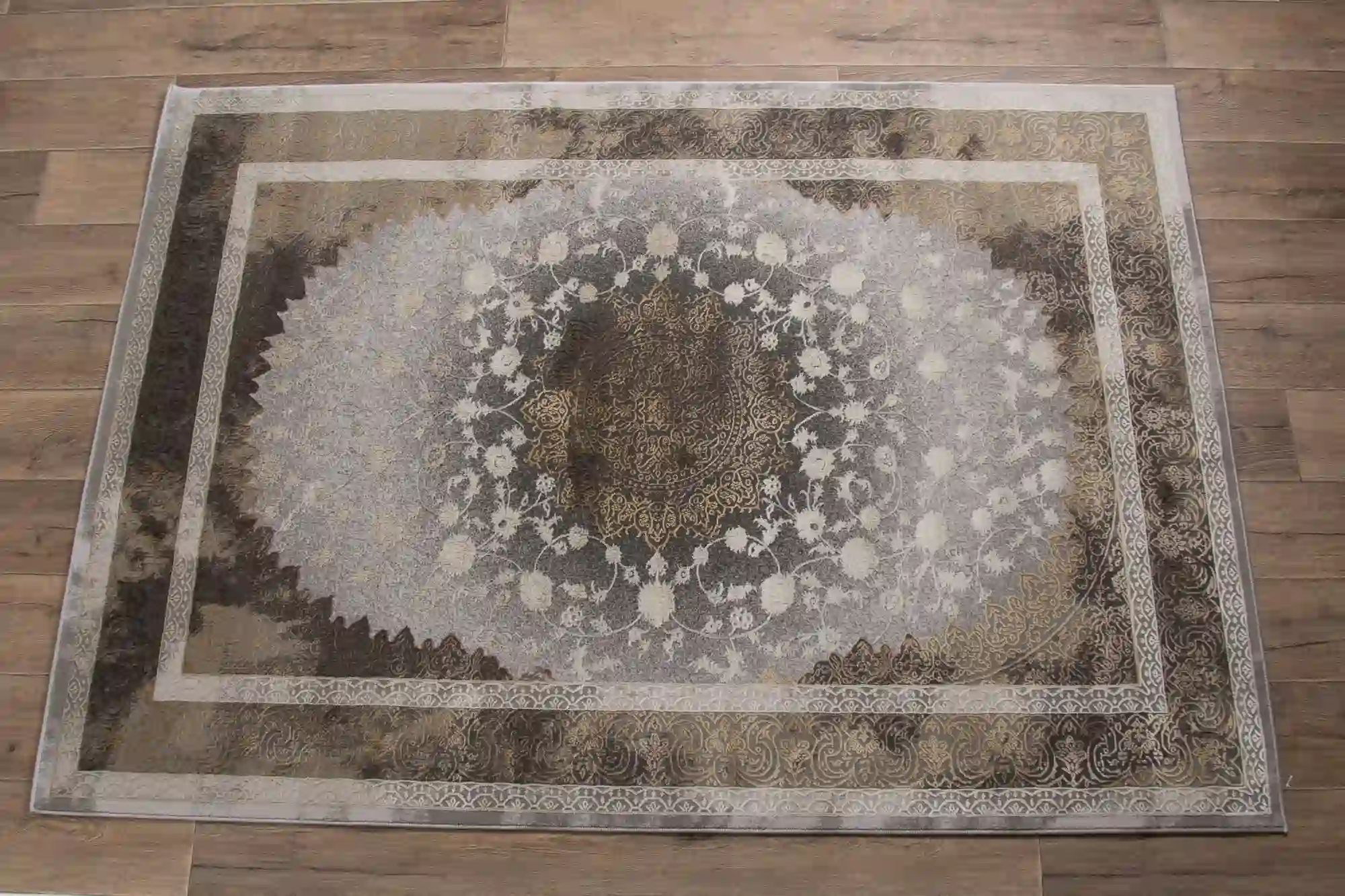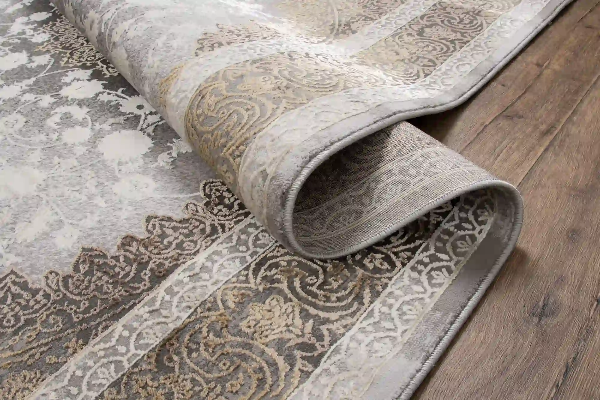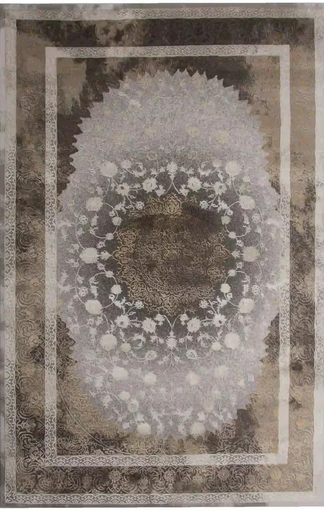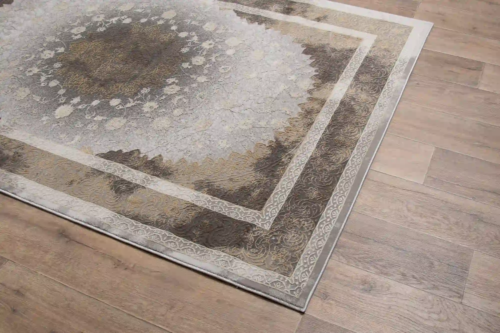 Stylowy dywan wykonany z miękkiej przędzy poliestrowej z delikatnym połyskiem oraz runo o dwóch wysokościach tworzą efekt trójwymiarowości. Dywan w klasycznym stylu z efektem vintage, utrzymany w odcieniach beżu, brązu i złota. Zdobiony centralnym medalionem w stylu perskim, otoczonym roślinnymi ornamentami i wielowarstwową ramą.