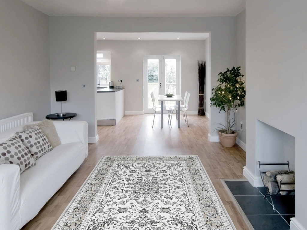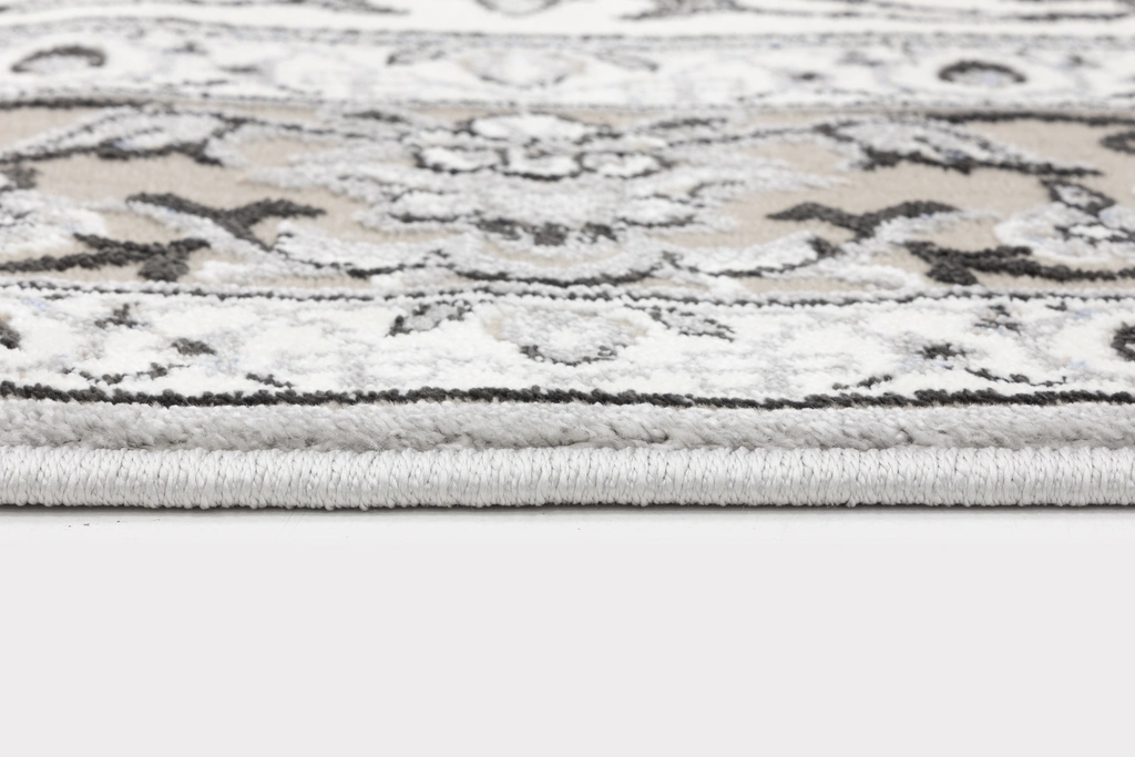 Dywan wykonany z przędzy polipropylenowej Heat Set jest miękki i przyjemny w dotyku. Delikatny połysk sprawia, że w zależności od ułożenia włosia runo subtelnie zmienia odcień, tworząc ciekawy efekt wizualny. Tradycyjny wzór w beżowej kolorystyce dodaje elegancji i doskonale pasuje do klasycznego stylu wnętrz.