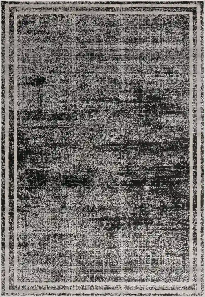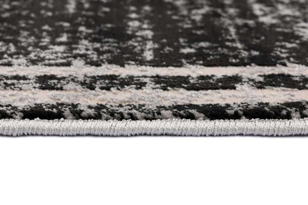 Dywan z uszlachetnionej przędzy Heat Set jest miękki, przyjemny w dotyku i delikatnie połyskuje, tworząc interesujący efekt w zależności od kąta padania światła. Utrzymany w stonowanych odcieniach szarości, prezentuje nowoczesny styl z subtelnym efektem przetarcia i prostą ramką wokół krawędzi.