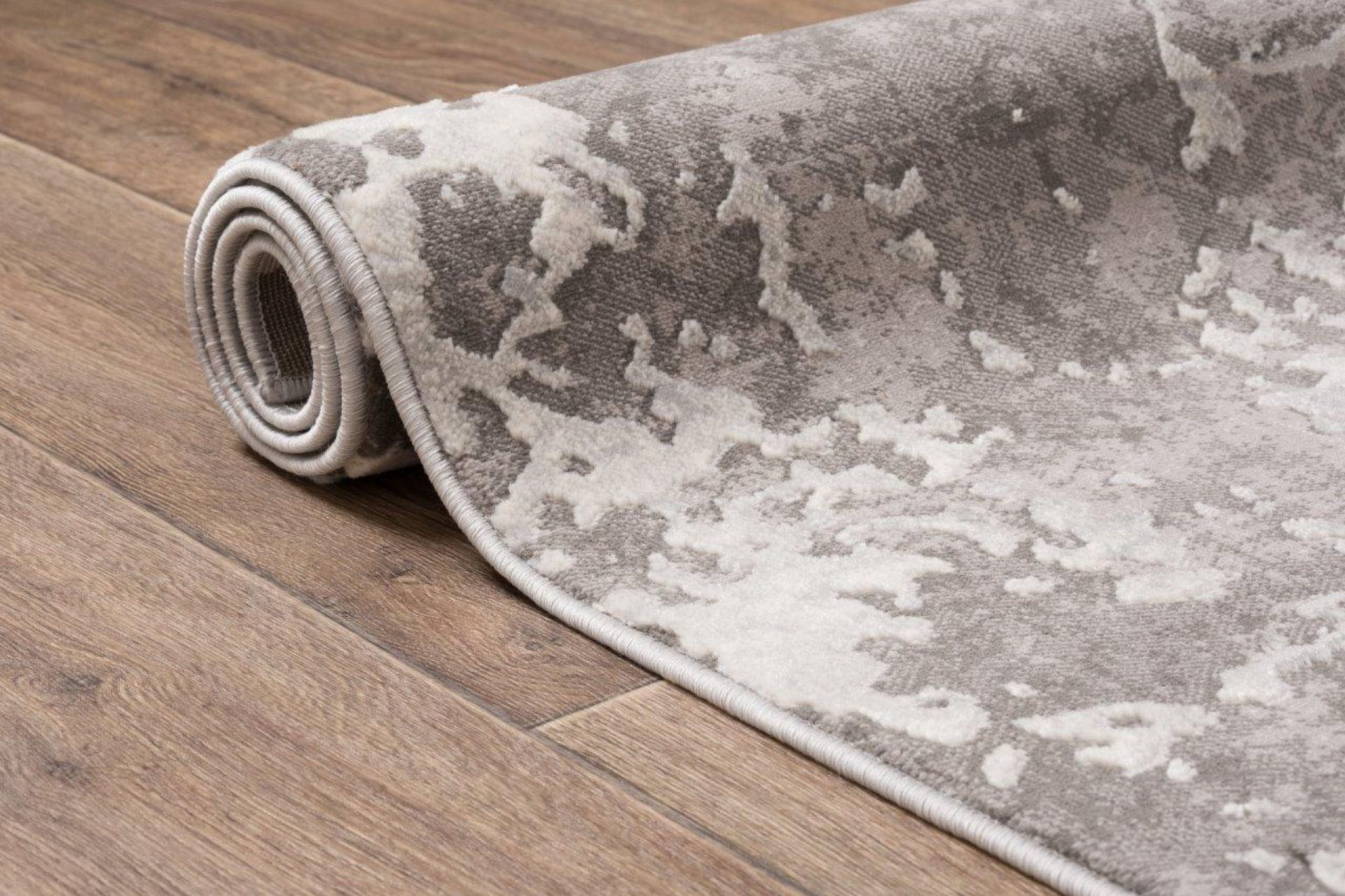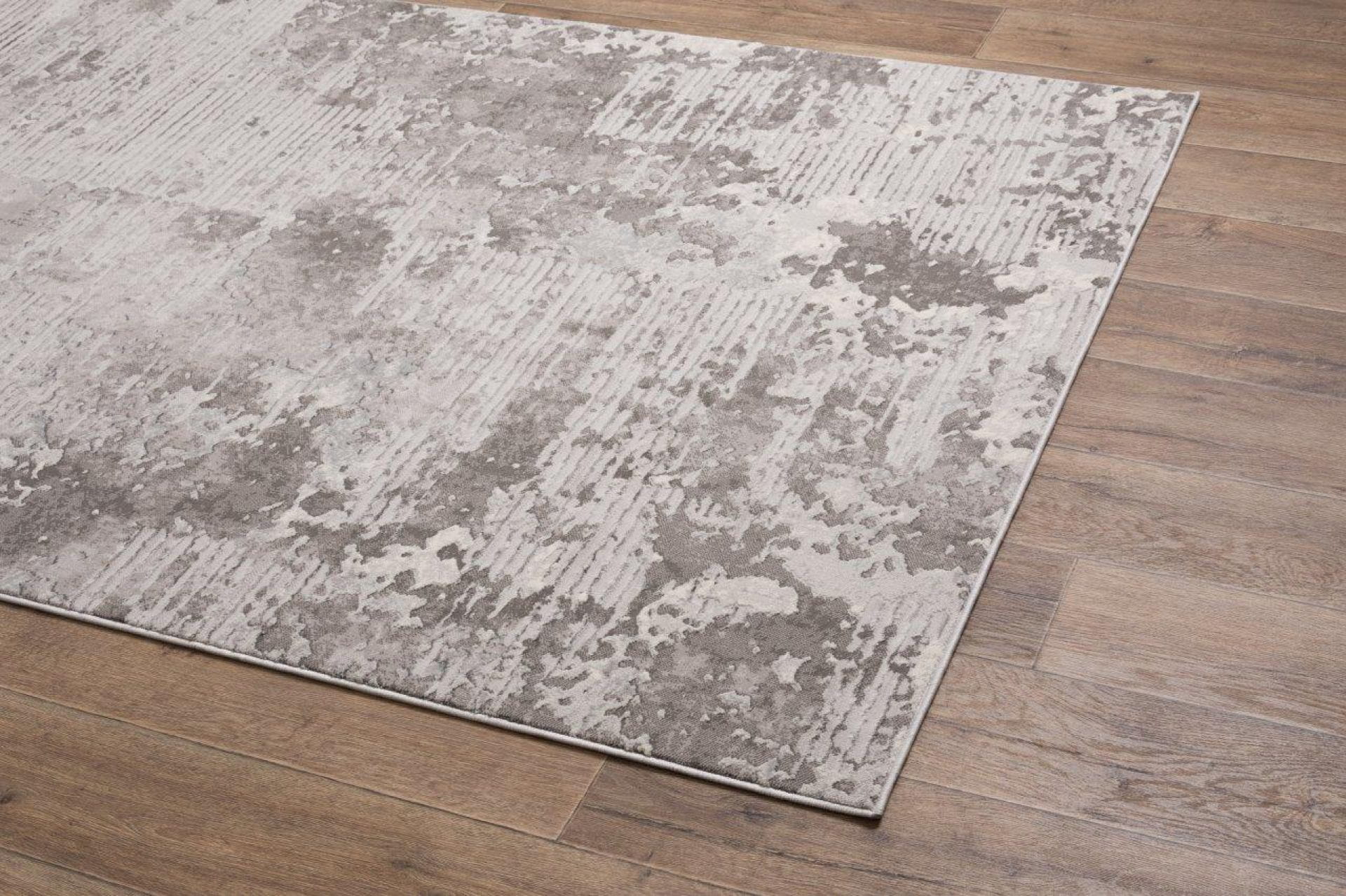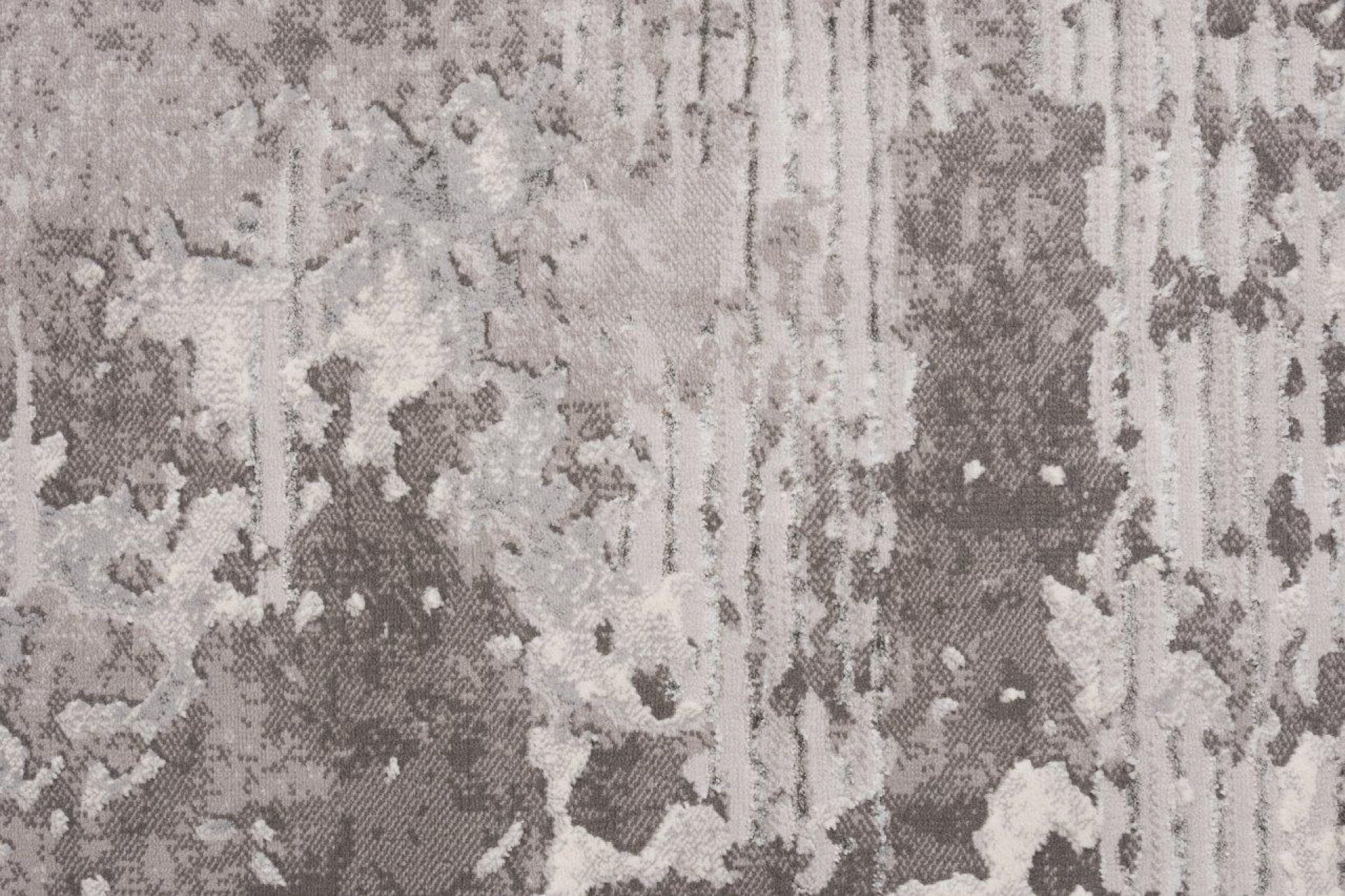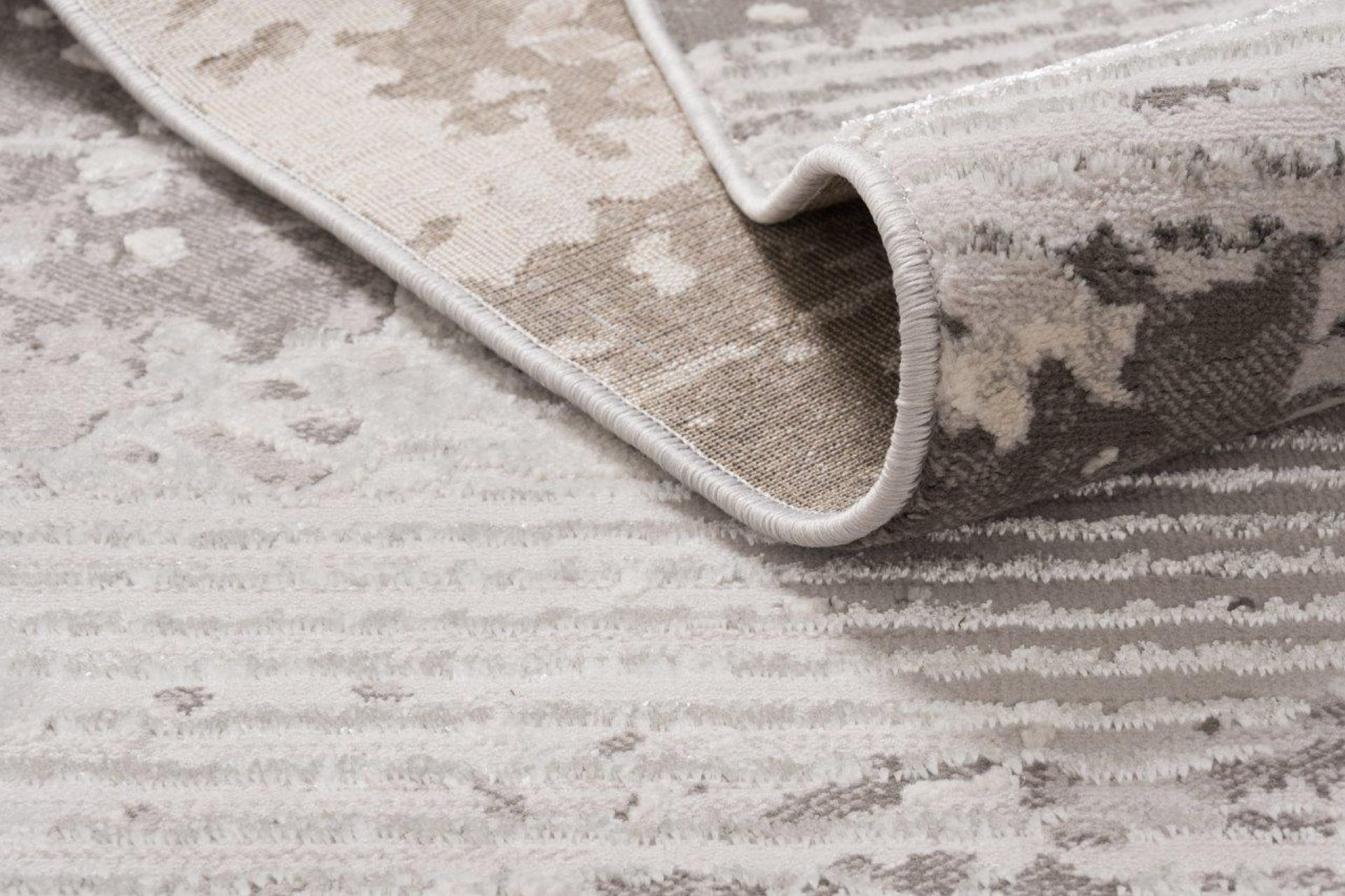 Dywan z przetarciami imitujący surowy beton na tle drobnych paseczków, który delikatnie się błyszczy, dzięki poddanemu obróbce termicznej poliestrowi. Jest praktyczny w użytkowaniu, ponieważ nie odkształca się i nie blaknie od słońca.
