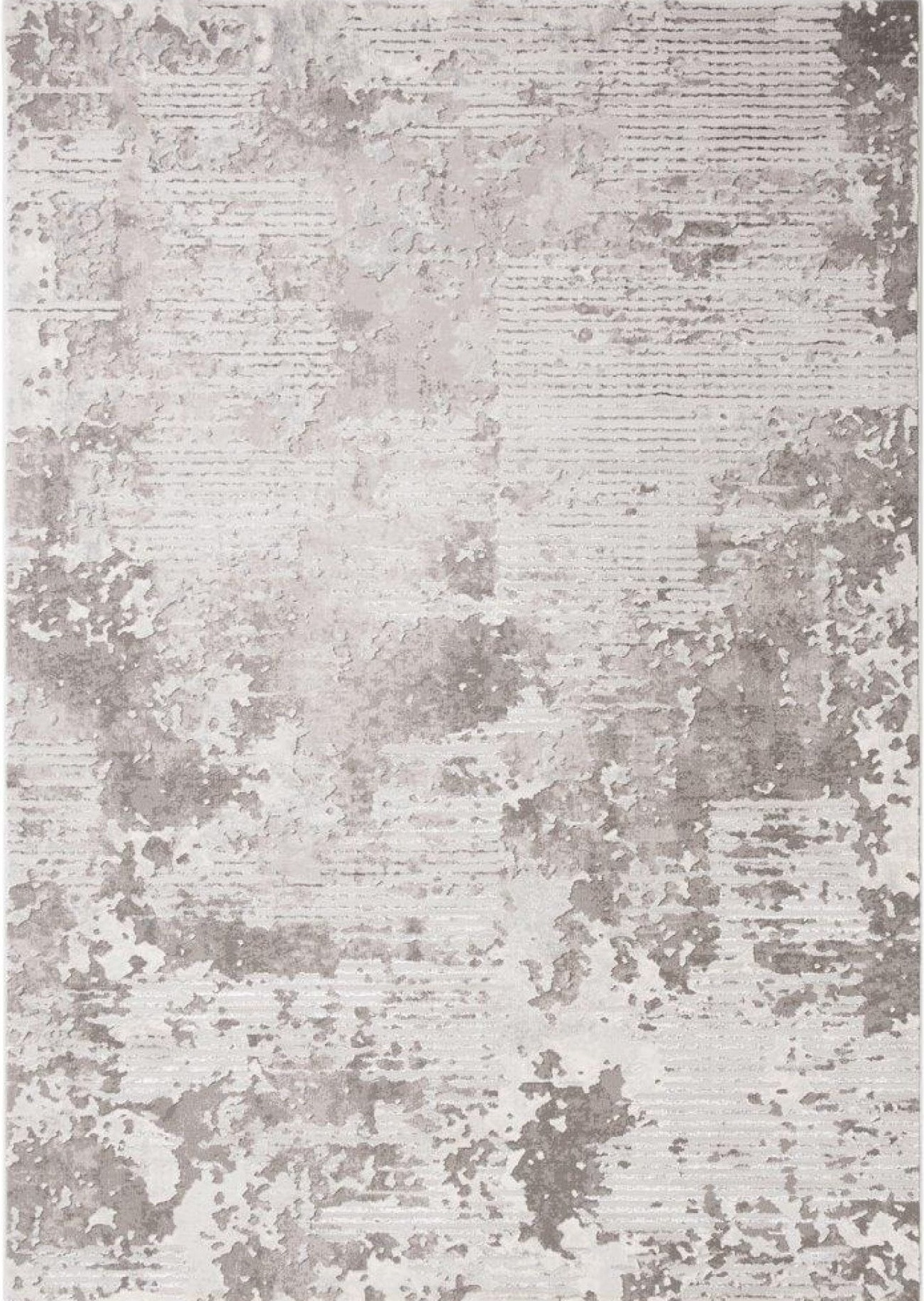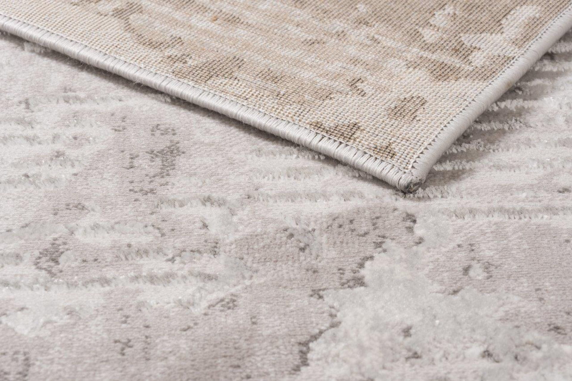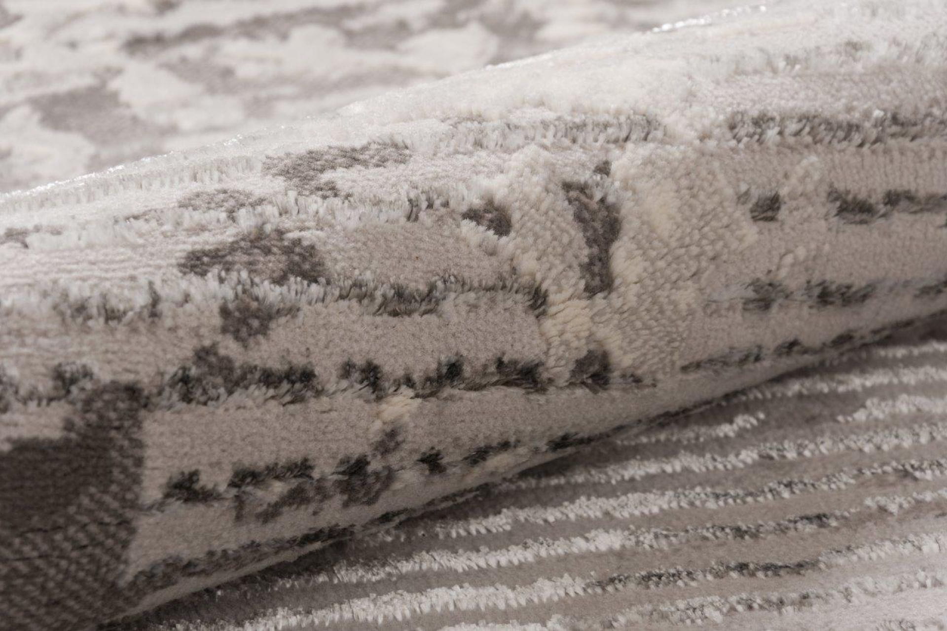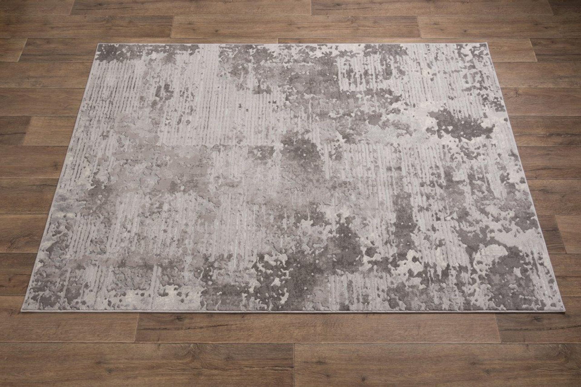 Dywan z przetarciami imitujący surowy beton na tle drobnych paseczków, który delikatnie się błyszczy, dzięki poddanemu obróbce termicznej poliestrowi. Jest praktyczny w użytkowaniu, ponieważ nie odkształca się i nie blaknie od słońca.