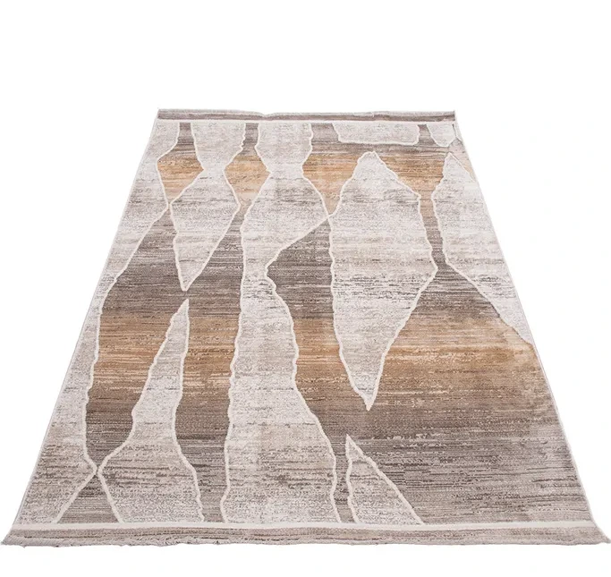 Dywan z miękkiego poliestru w pastelowych, beżowych tonach, ozdobiony frędzlami i abstrakcyjnym wzorem.