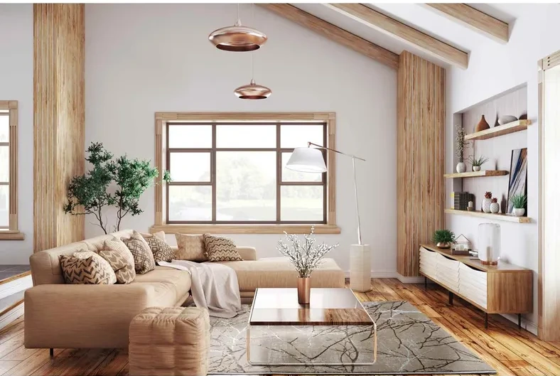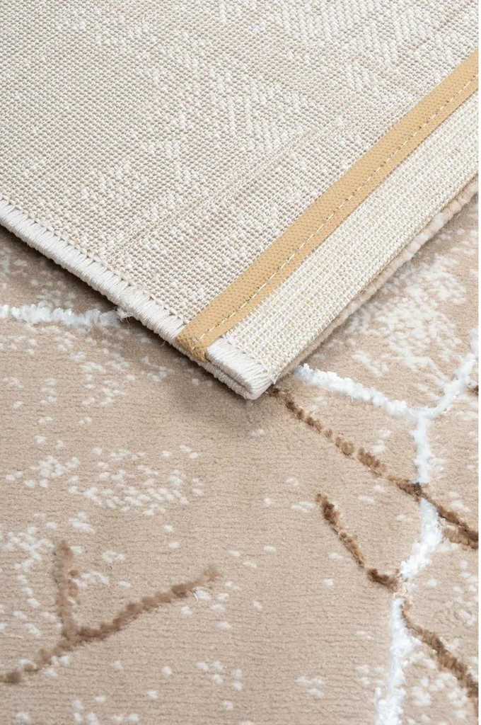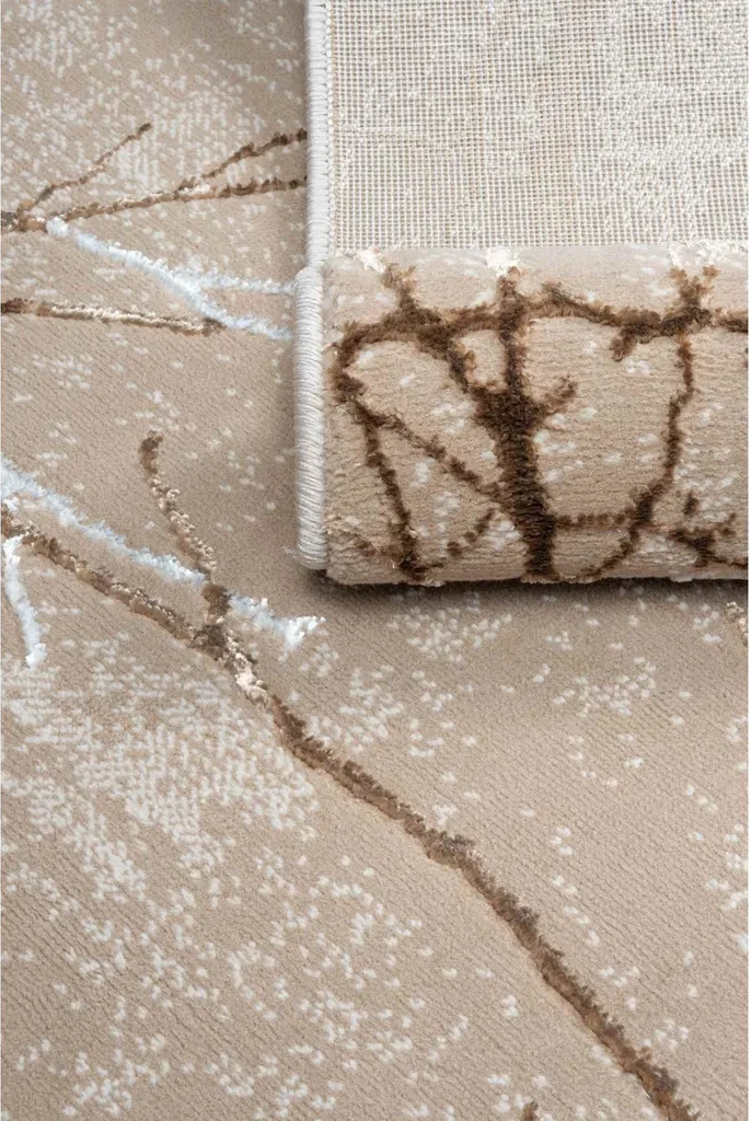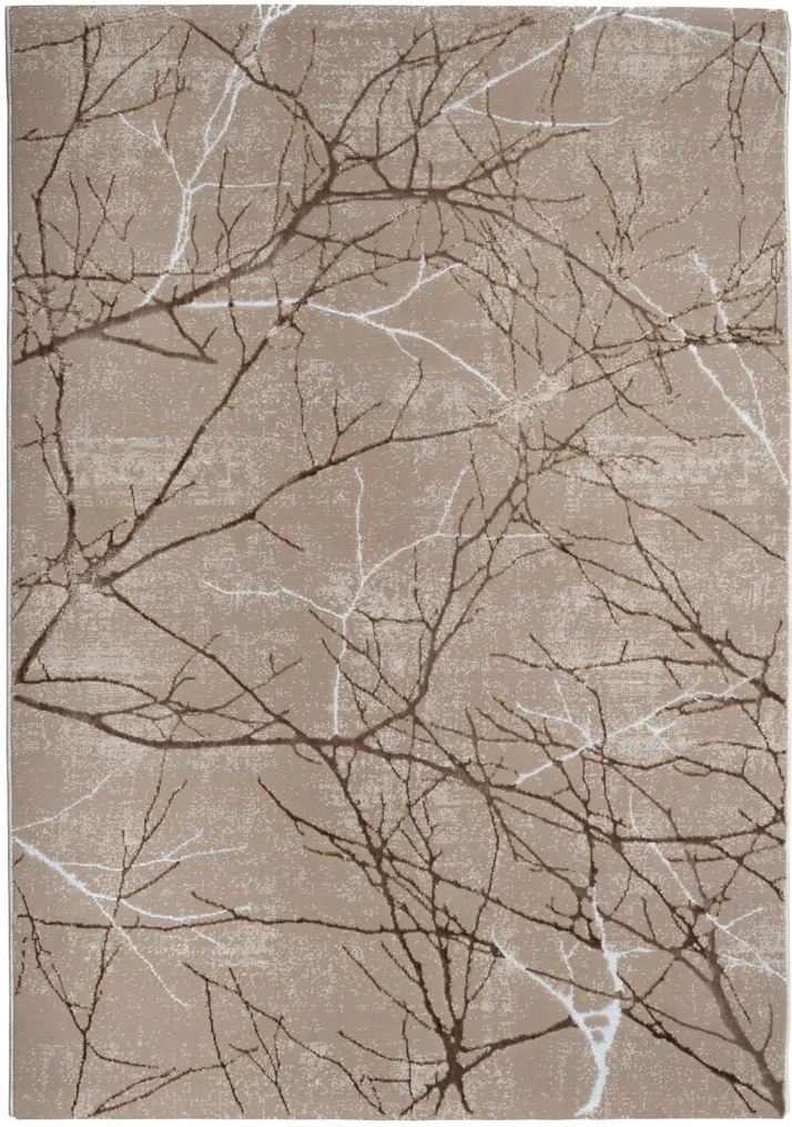 Elegancki beżowy dywan z miękkim, błyszczącym runem z wzorem gałęzi. Trwały i łatwy w czyszczeniu, idealny do stylowych wnętrz.