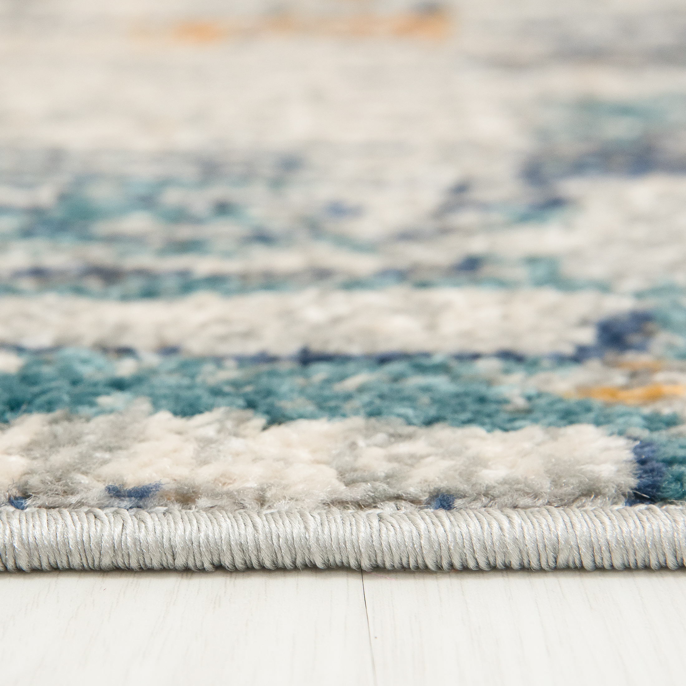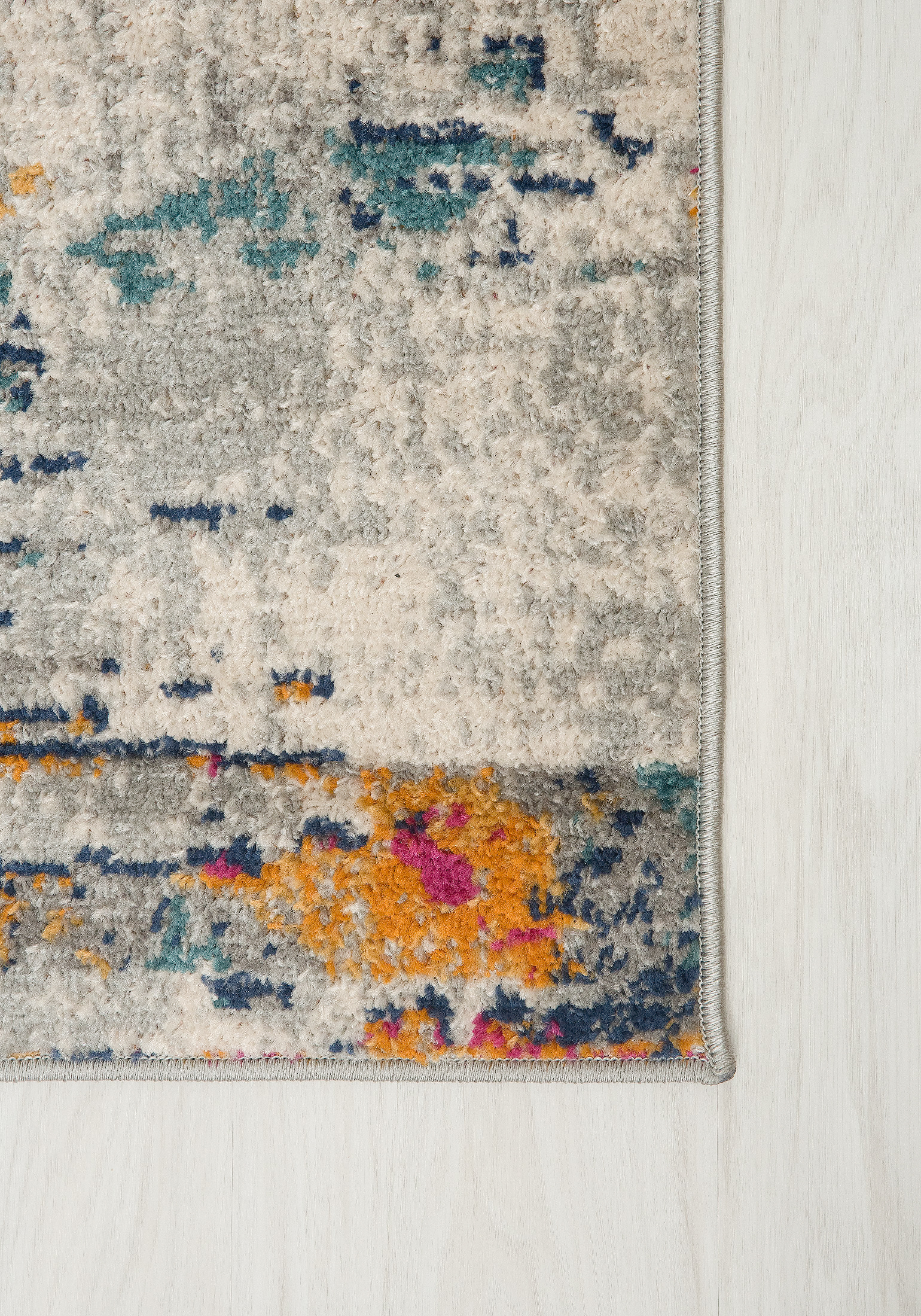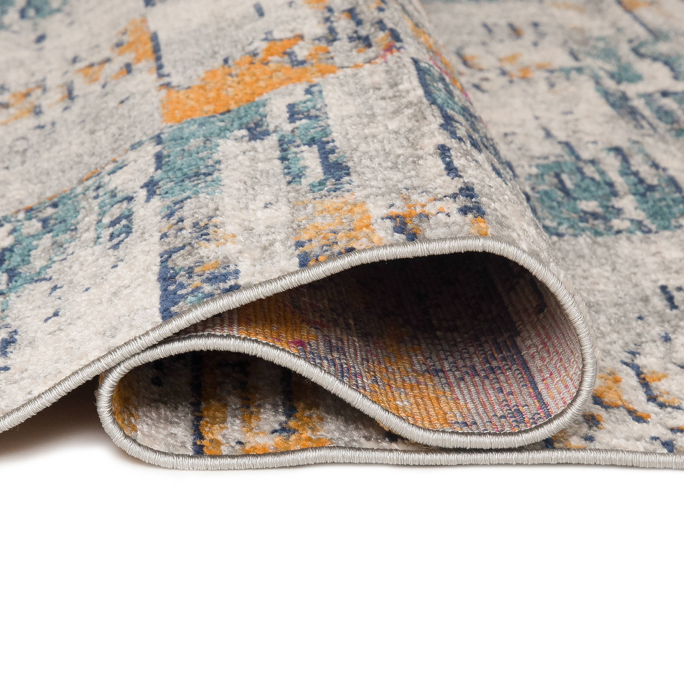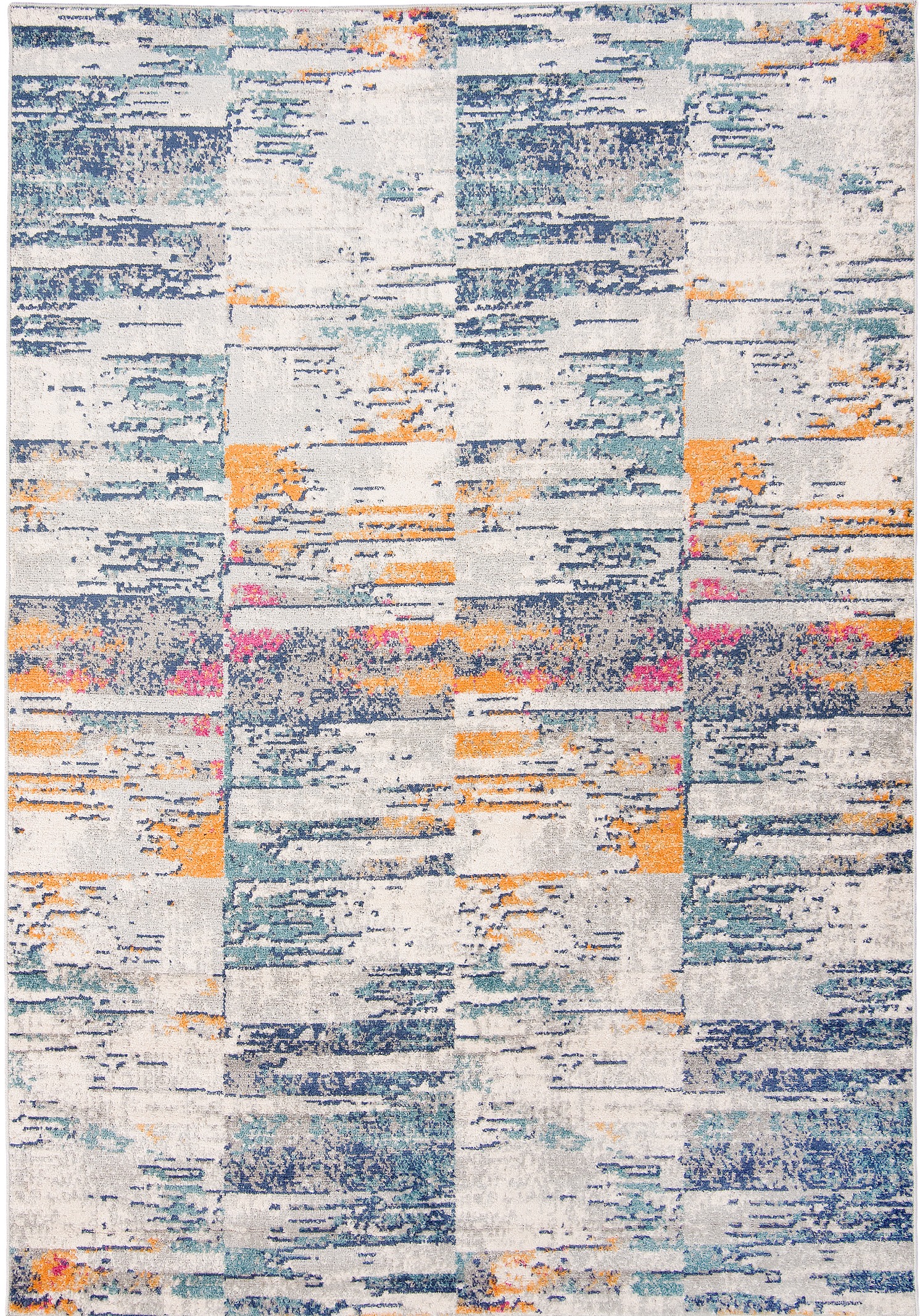 Dywan wykonany z miękkich włókien polipropylenowych Calping Frise, wyglądem przypominających wełnę. Ma sprężyste, trwałe runo, odporne na odkształcenia i łatwe w czyszczeniu. Dywan w nowoczesny wzór z prostokątów i poziomych pasów w odcieniach niebieskiego, szarości, turkusu i pomarańczu, z efektem artystycznego przetarcia.
