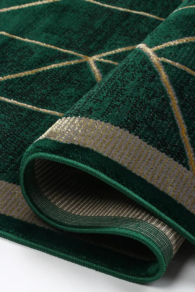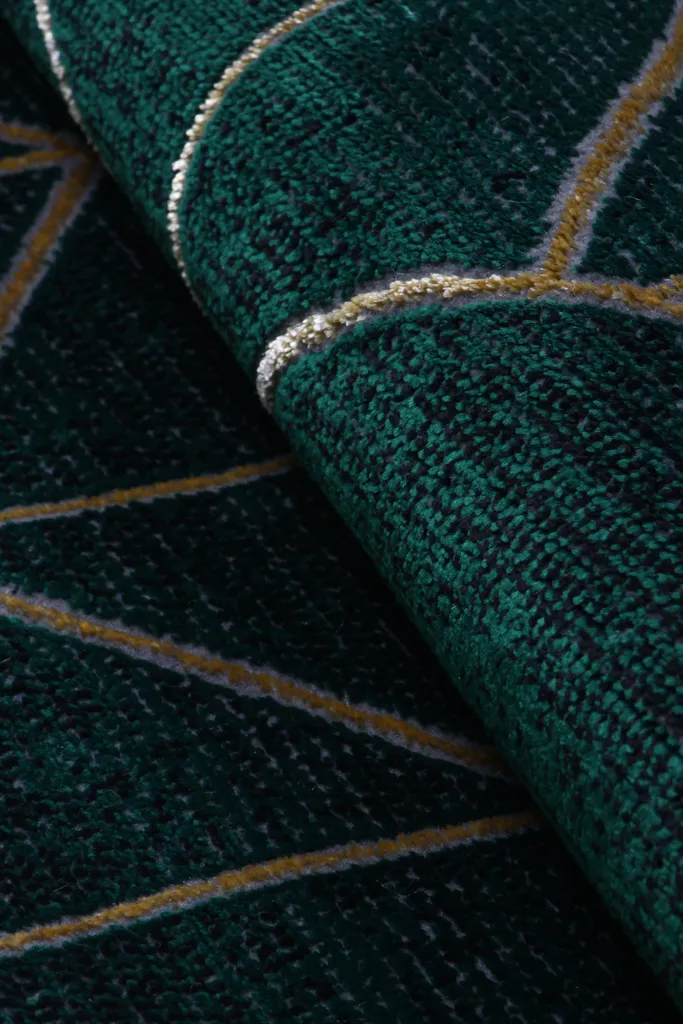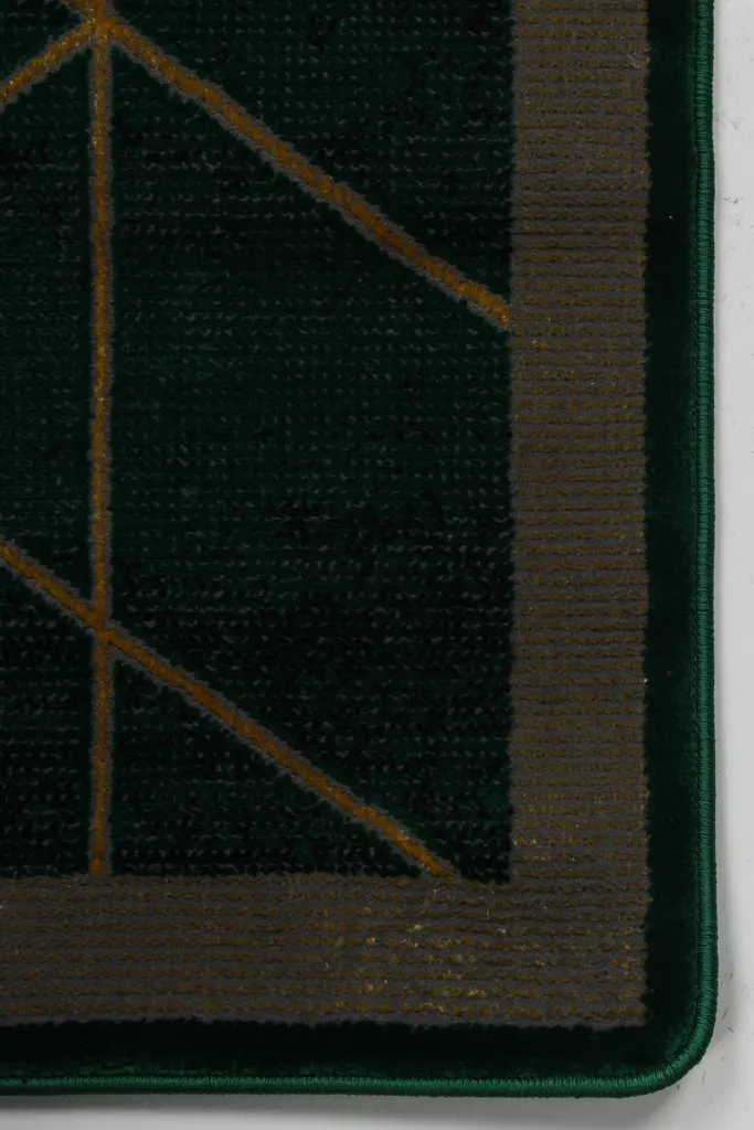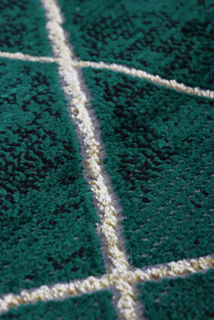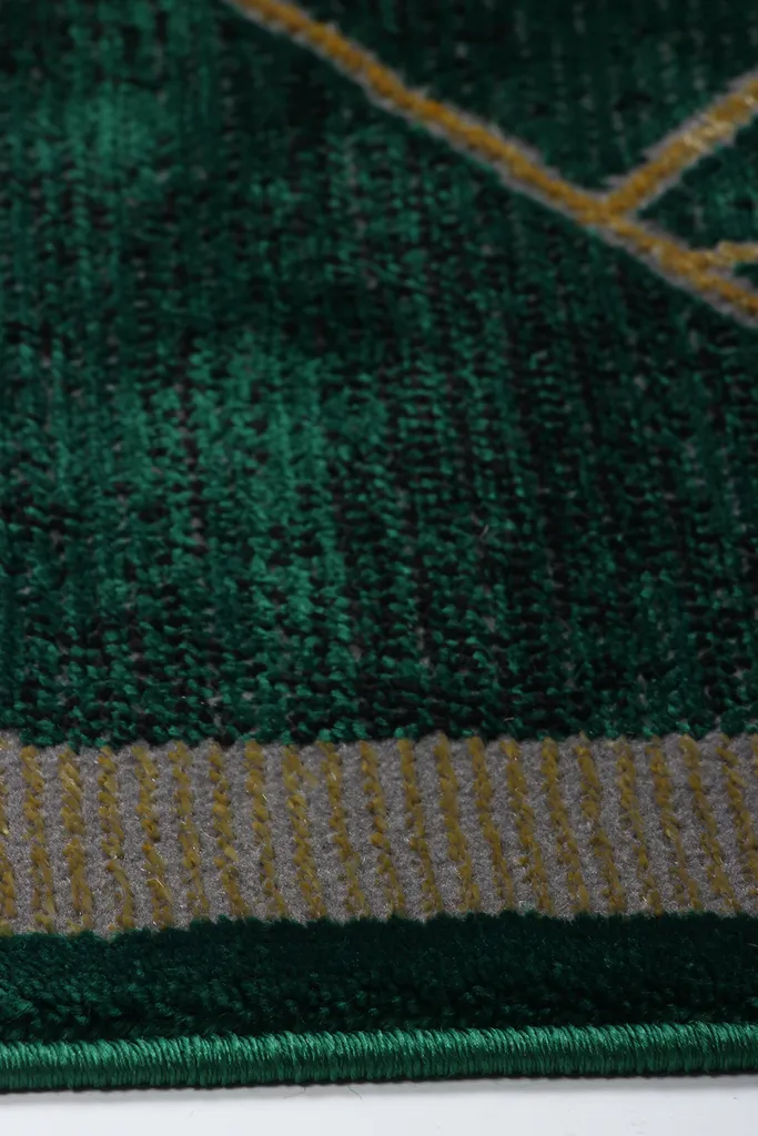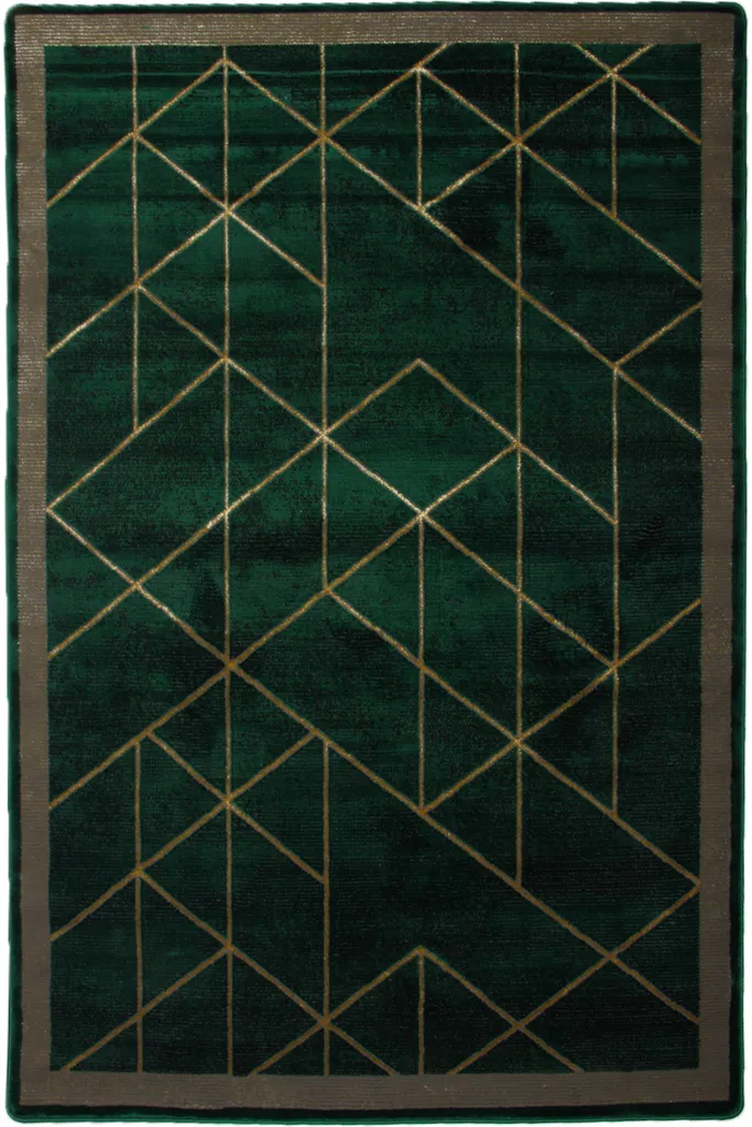 Nowoczesny dywan syntetyczny z miękkim, zielonym runem, ozdobiony złotymi, geometrycznymi figurami – stylowy i przyjemny w dotyku dodatek do współczesnych wnętrz.