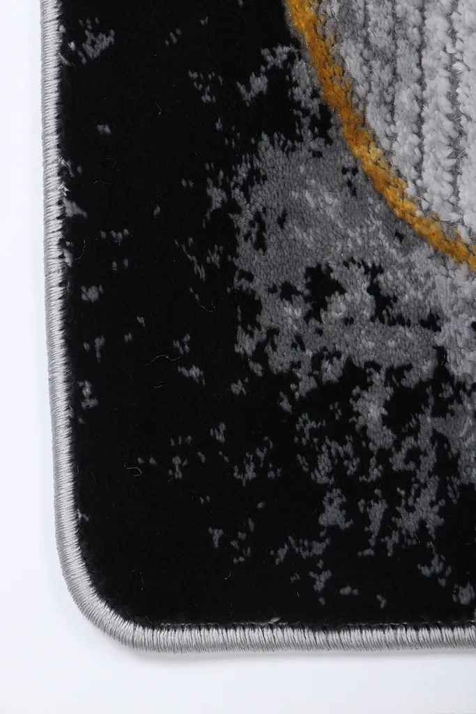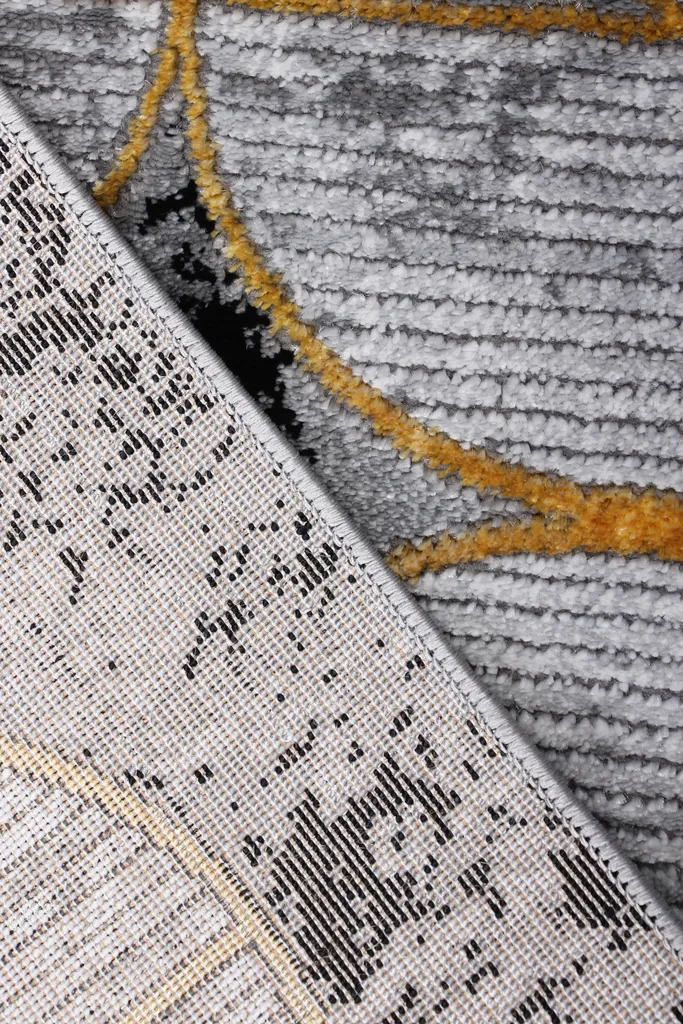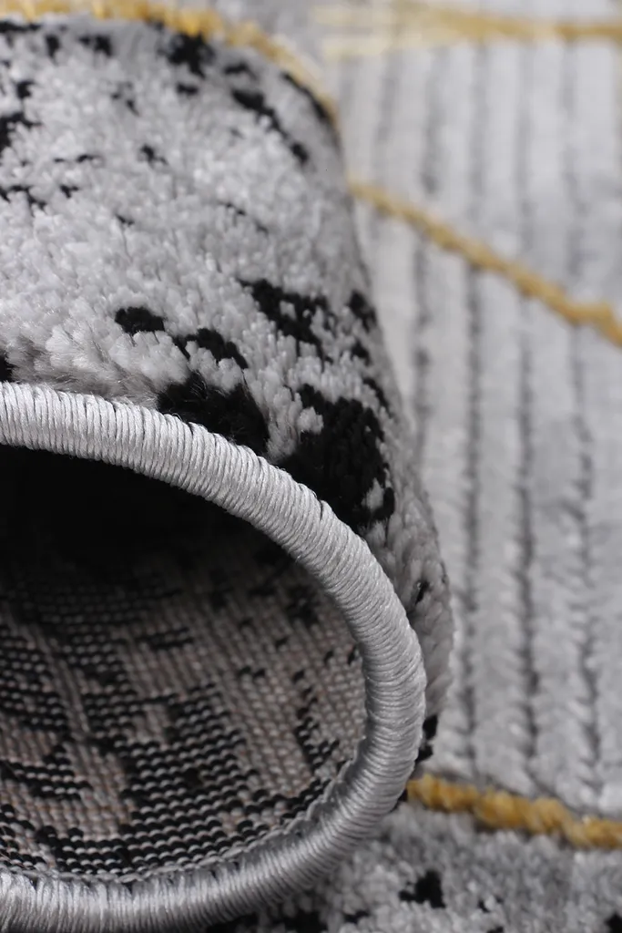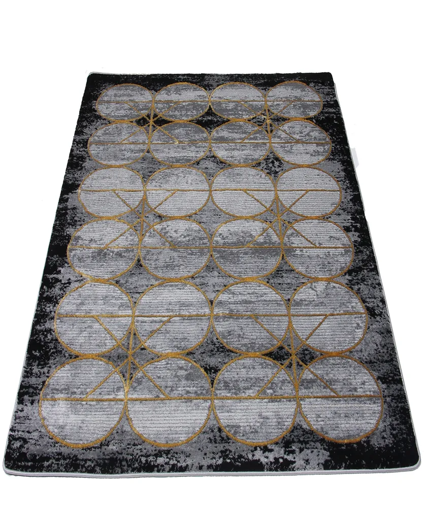 Nowoczesny dywan syntetyczny z miękkim, szarym runem, z wzorem kół, ozdobiony złotymi kreskami – stylowy i przyjemny w dotyku dodatek do współczesnych wnętrz.