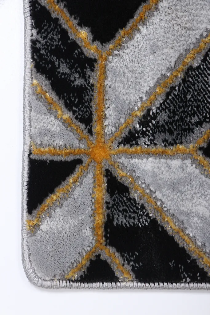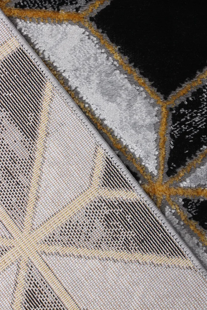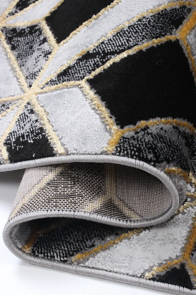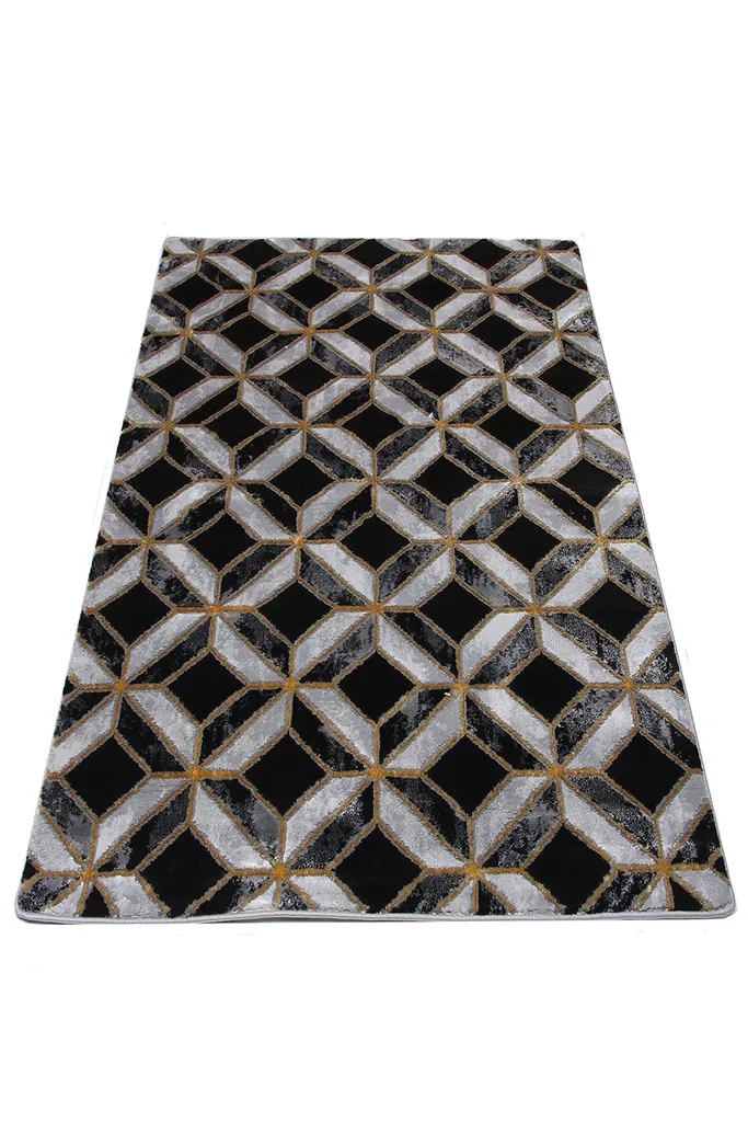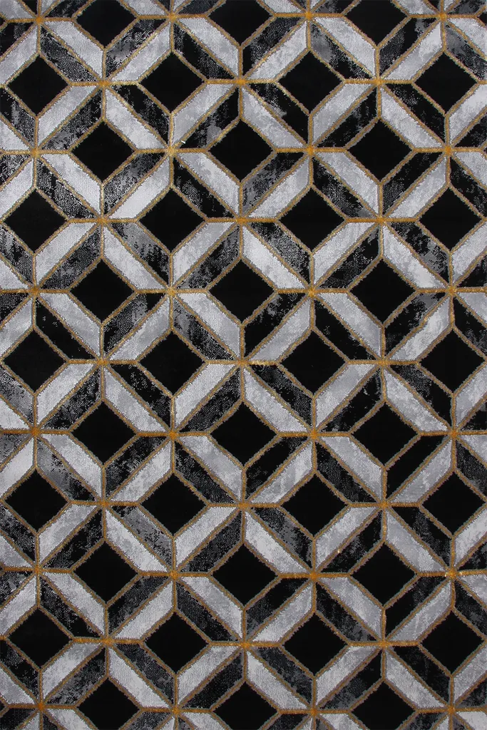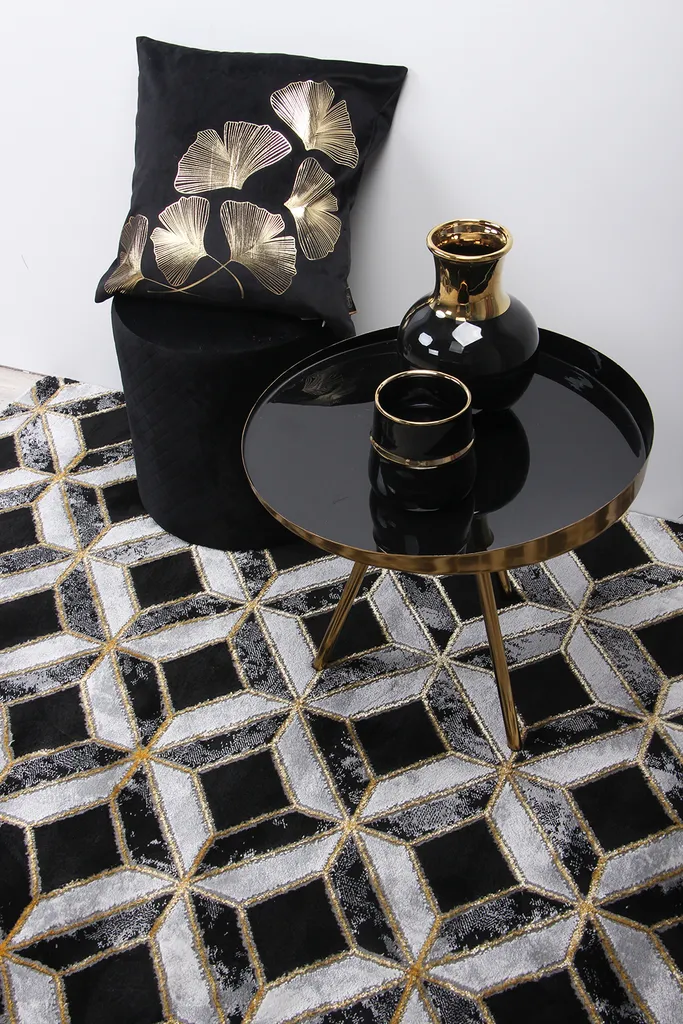 Nowoczesny dywan syntetyczny z czarnym tłem i trójwymiarowym wzorem w szare i białe romby z akcentami w kolorze złota – stylowy i przyjemny w dotyku dodatek do współczesnych wnętrz.