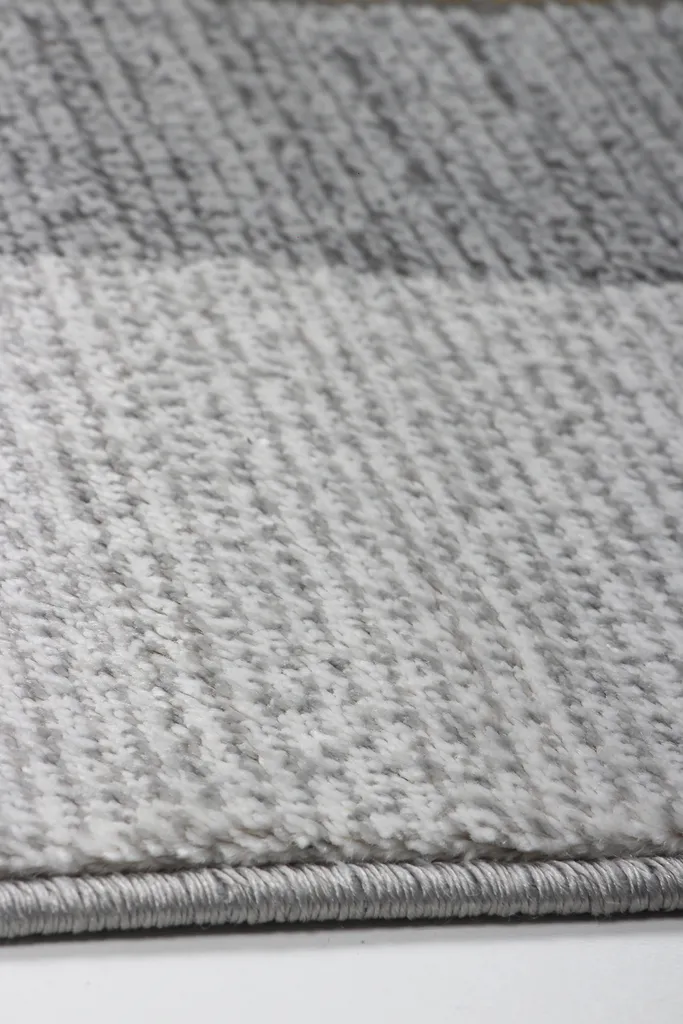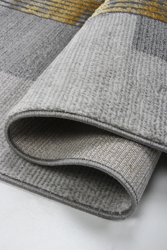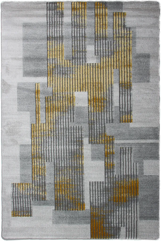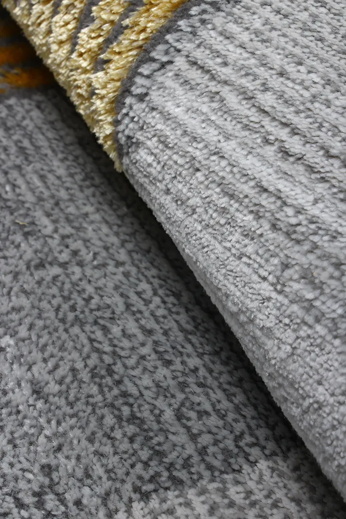 Nowoczesny dywan syntetyczny z trójwymiarowym wzorem szarych i złotych elementów geometrycznych – stylowy i przyjemny w dotyku dodatek do współczesnych wnętrz.