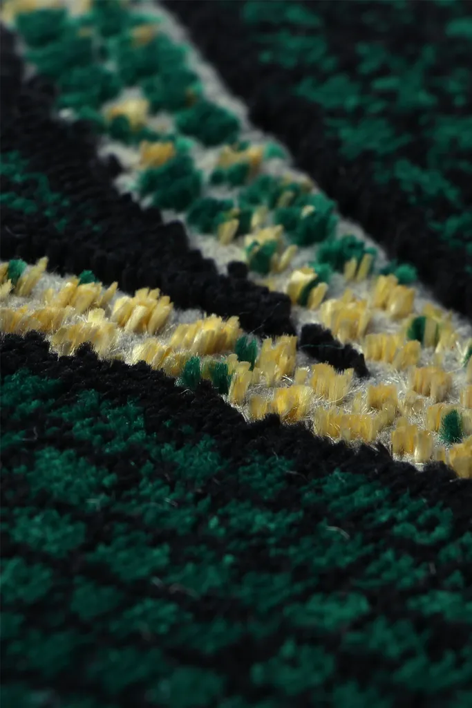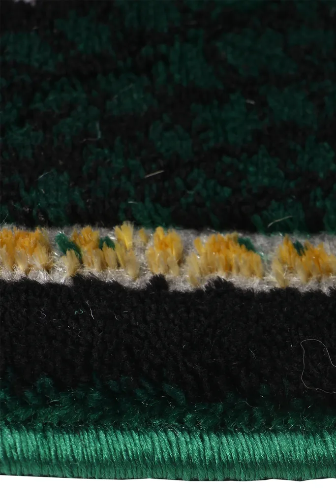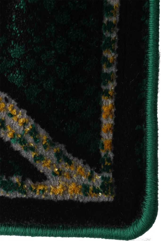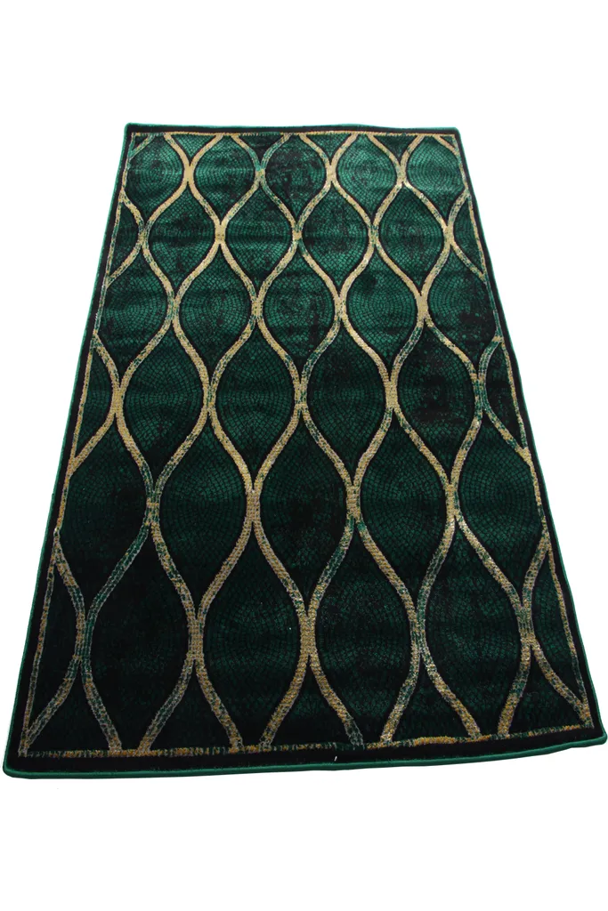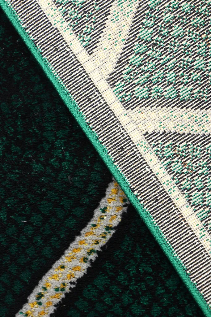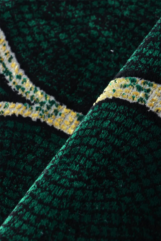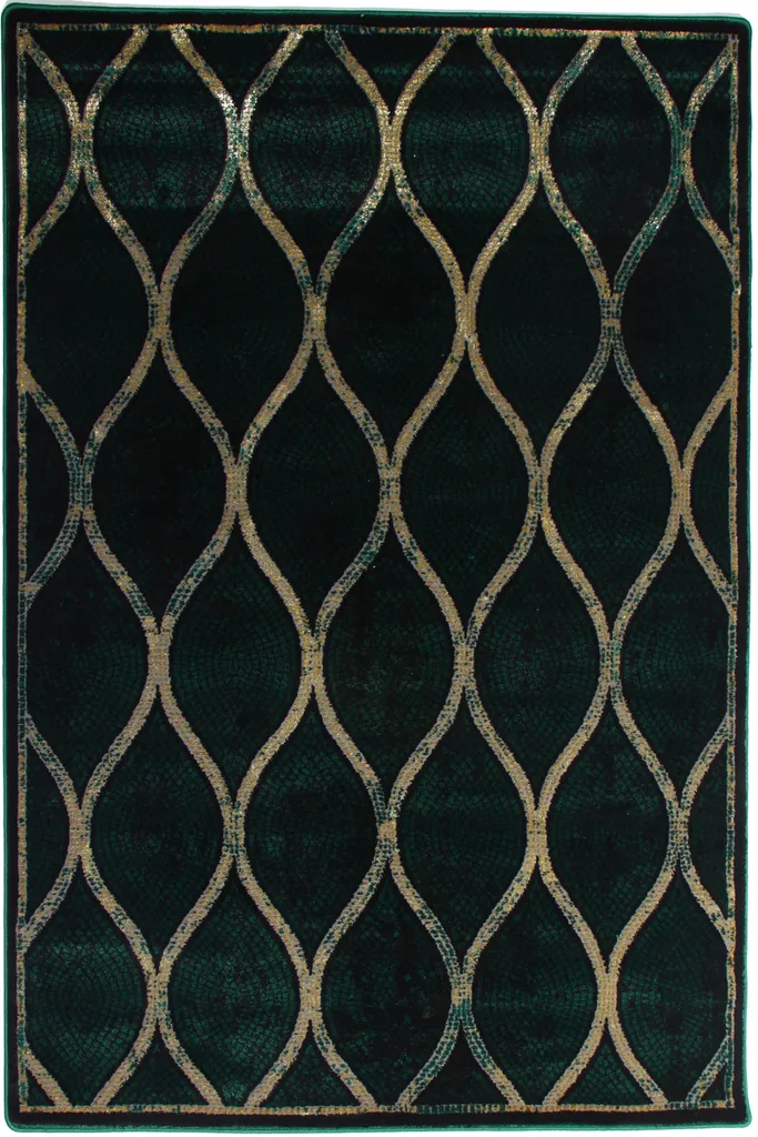Nowoczesny dywan syntetyczny z geometrycznym, złotym wzorem na zielonym tle – stylowy i przyjemny w dotyku dodatek do współczesnych wnętrz.