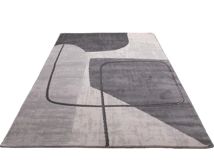 Nowoczesny dywan syntetyczny z miękkim, szarym runem z wzorem abstrakcyjnych figur – stylowy i przyjemny w dotyku dodatek do współczesnych wnętrz.