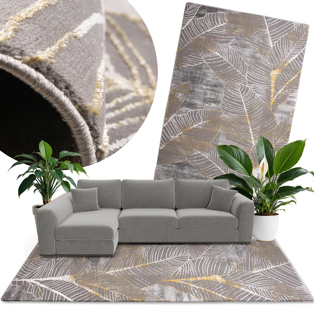 Nowoczesny dywan syntetyczny z miękkim runem, ozdobiony wzorem w duże liście – stylowy i przyjemny w dotyku dodatek do eleganckich wnętrz.