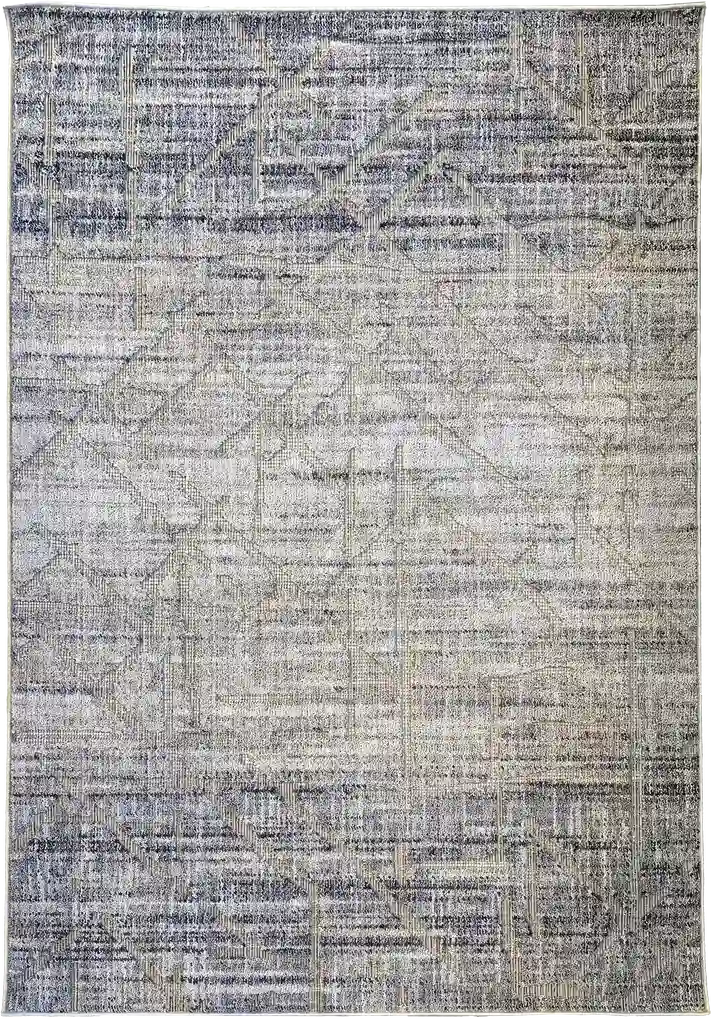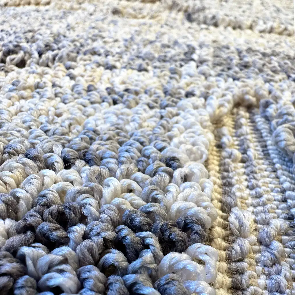 Dywan o miękkim włosiu w subtelnym odcieniu beżu i szarości z geometrycznym wzorem. Zróżnicowana wysokość włókien tworzy efekt trójwymiarowości, nadając powierzchni głębi i dynamicznego charakteru.