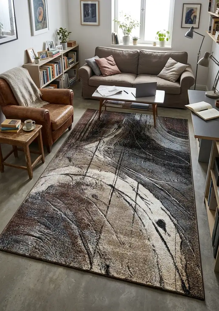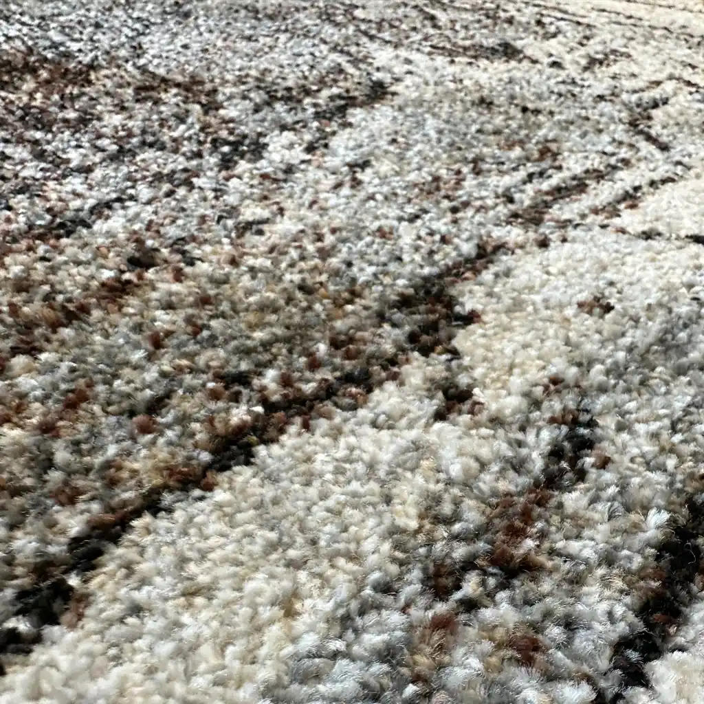 Miękki i trwały dywan z włókna fryz o skręcanej strukturze, łączący komfort i wysoką odporność na codzienne użytkowanie. Nowoczesny, absrtrakcyjny wzór podkreśla charakter współczesnych wnętrz, dodając im stylu i wyrazistości.