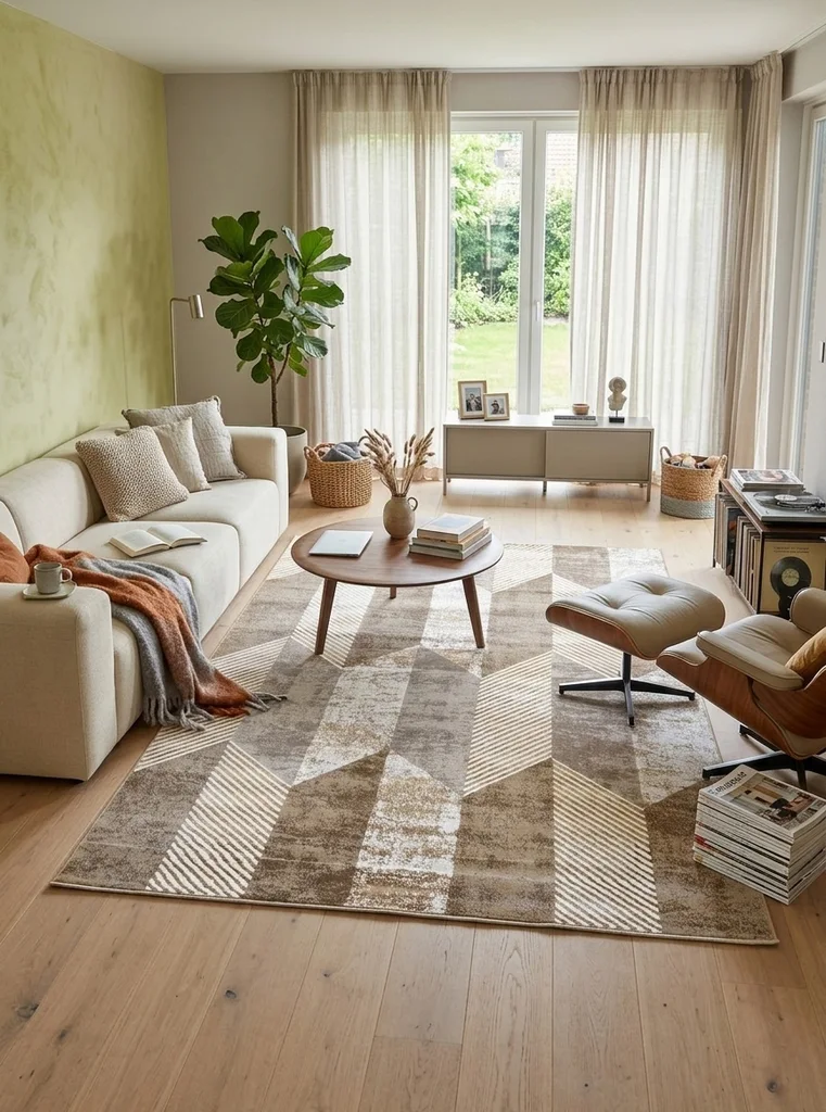 Dywan ma nowoczesny, geometryczny wzór z przetarciami oraz przyjemne w dotyku runo, które delikatnie się błyszczy, dzięki poddanemu obróbce termicznej poliestrowi. Jest praktyczny w użytkowaniu, ponieważ nie odkształca się i nie blaknie od słońca.