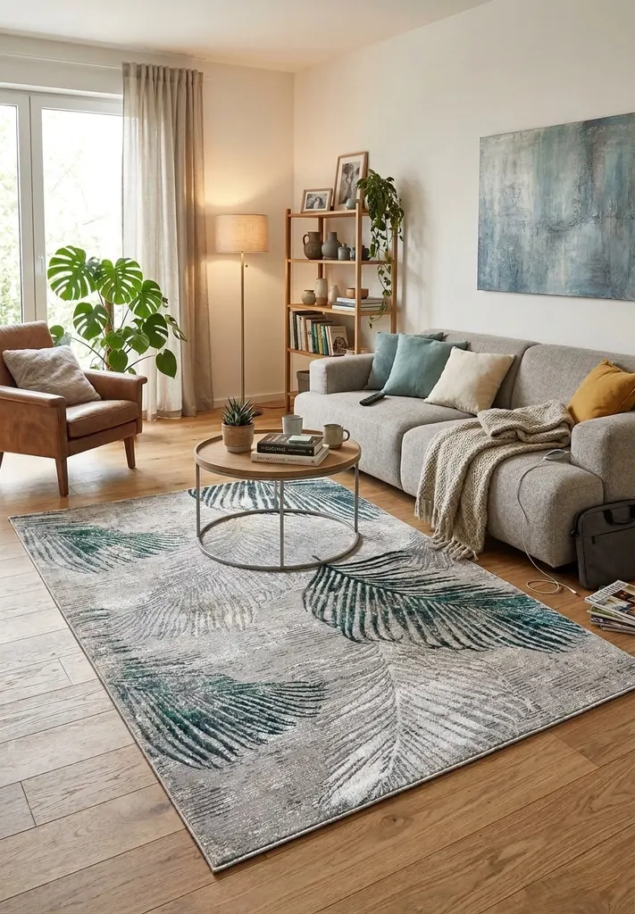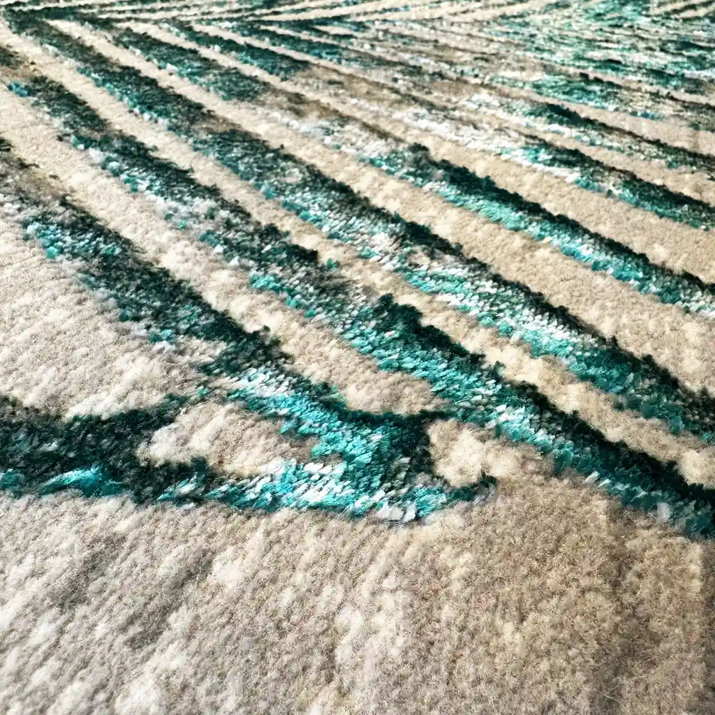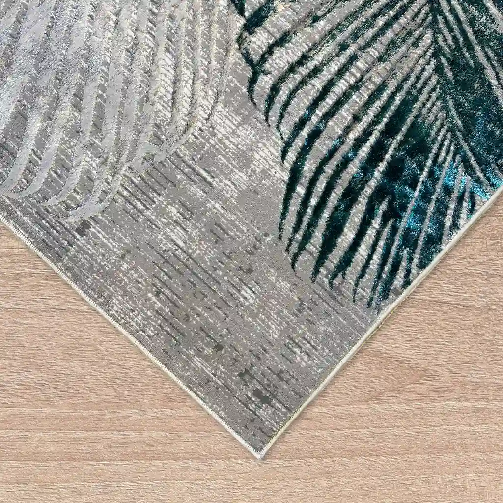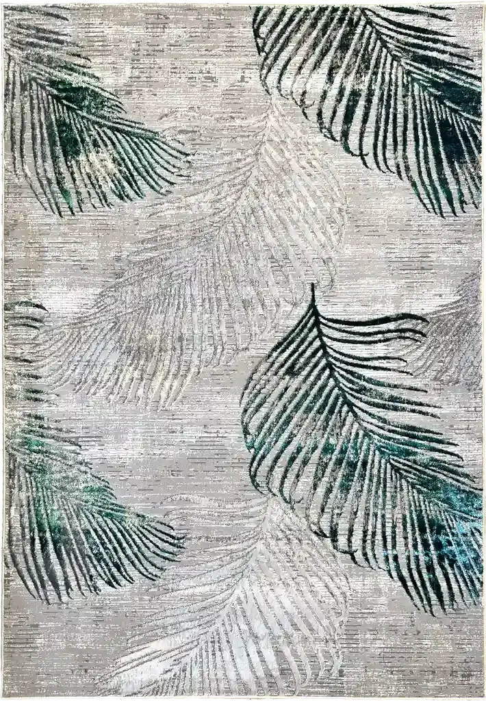 Dywan z motywem zielonych liści palmowych na szarym tle. Elegancki połysk i lekki, egzotyczny wzór dodają wnętrzu stylu i świeżości. Jest praktyczny w użytkowaniu, ponieważ nie odkształca się i nie blaknie od słońca.