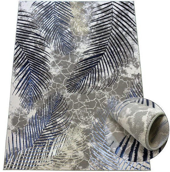 Dywan Esprit jest wykonany z dobrej jakości przędzy poliestrowej. Dwupoziomowe runo tworzy trójwymiarowy efekt, a niebieskie liście palmowe o lekkim połysku, na marmurowym tle dodają mu finezji. To połączenie dobrego stylu z elegancją i komfortem użytkowania.