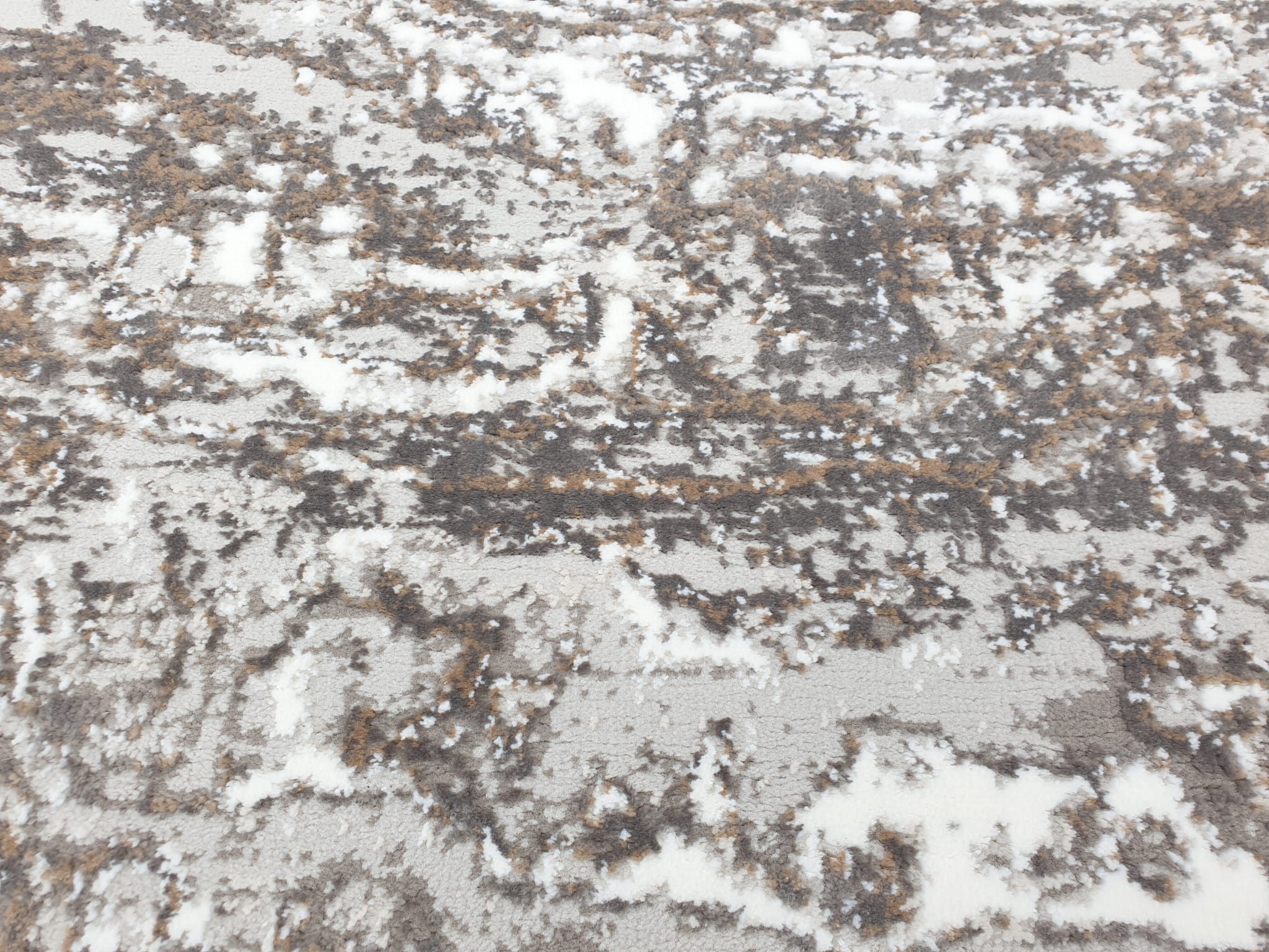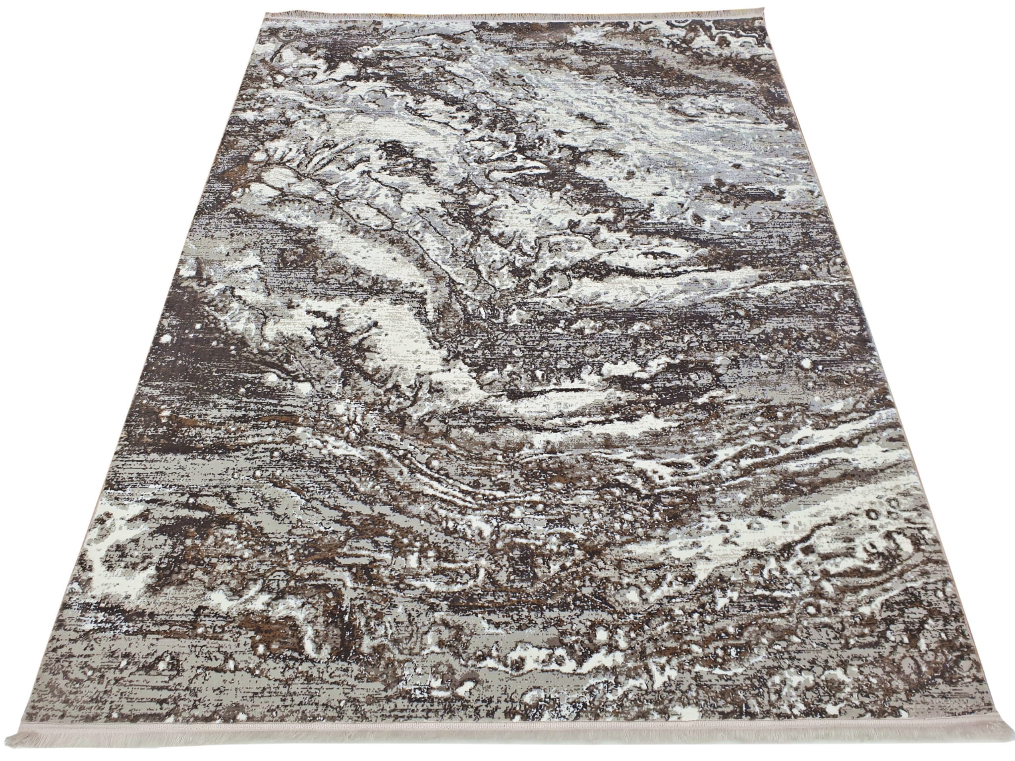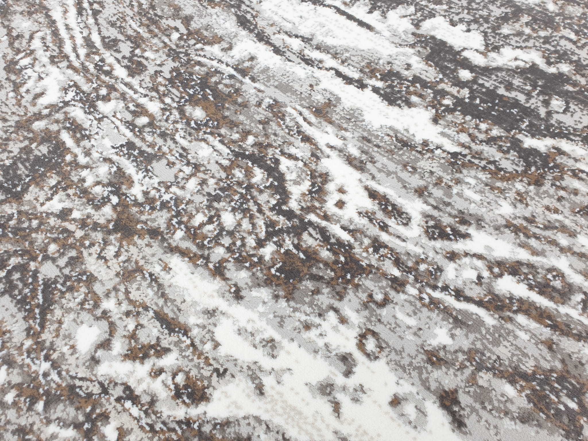 Dywan w kolorystyce brązu i szarości o wzorze imitującym naturalny marmur nada wnętrzu nowoczesny i dynamiczny charakter. Dwupoziomowe runo tworzy trójwymiarowy efekt 3d a całości dopełnia delikatny połysk runa.