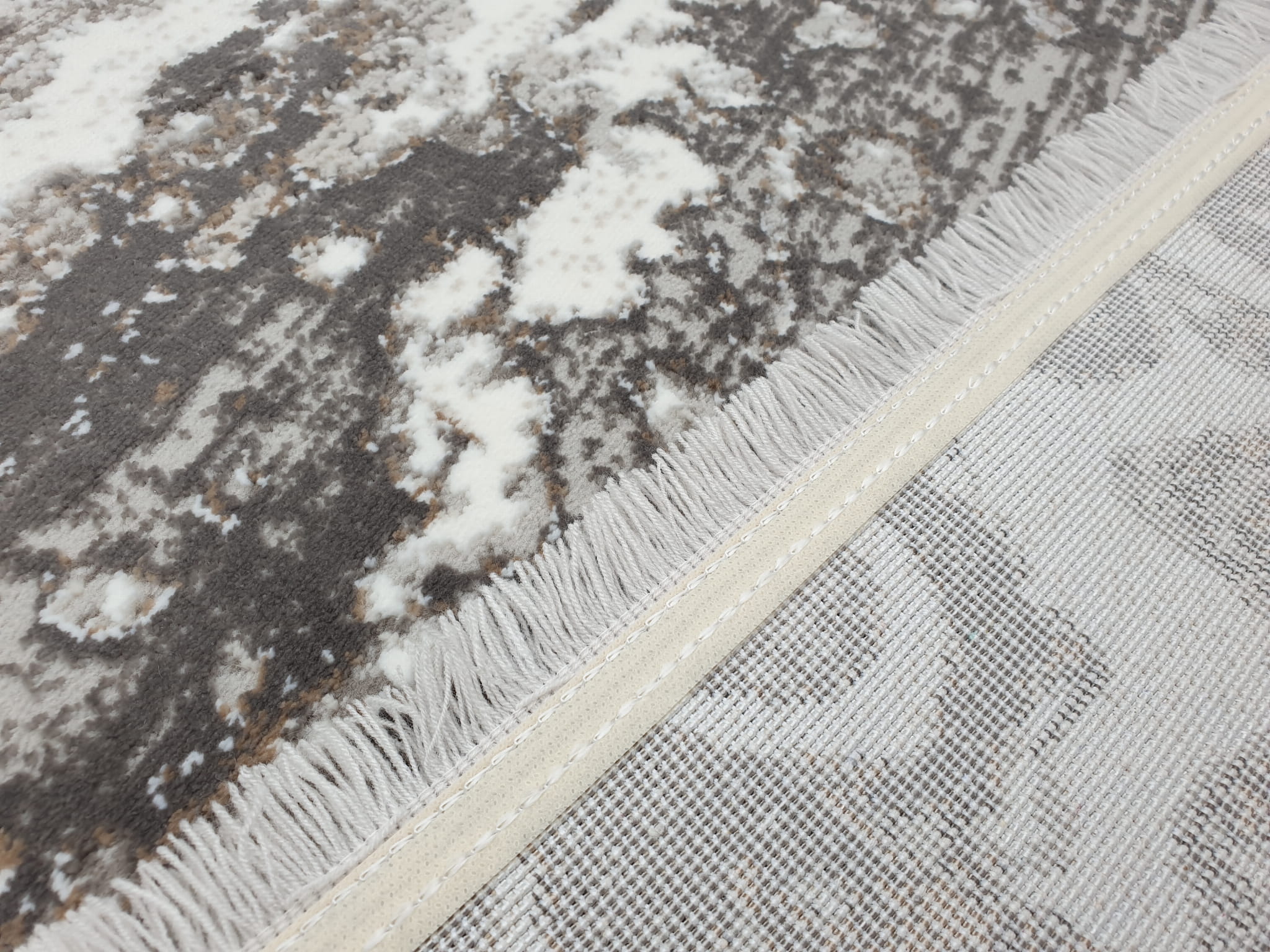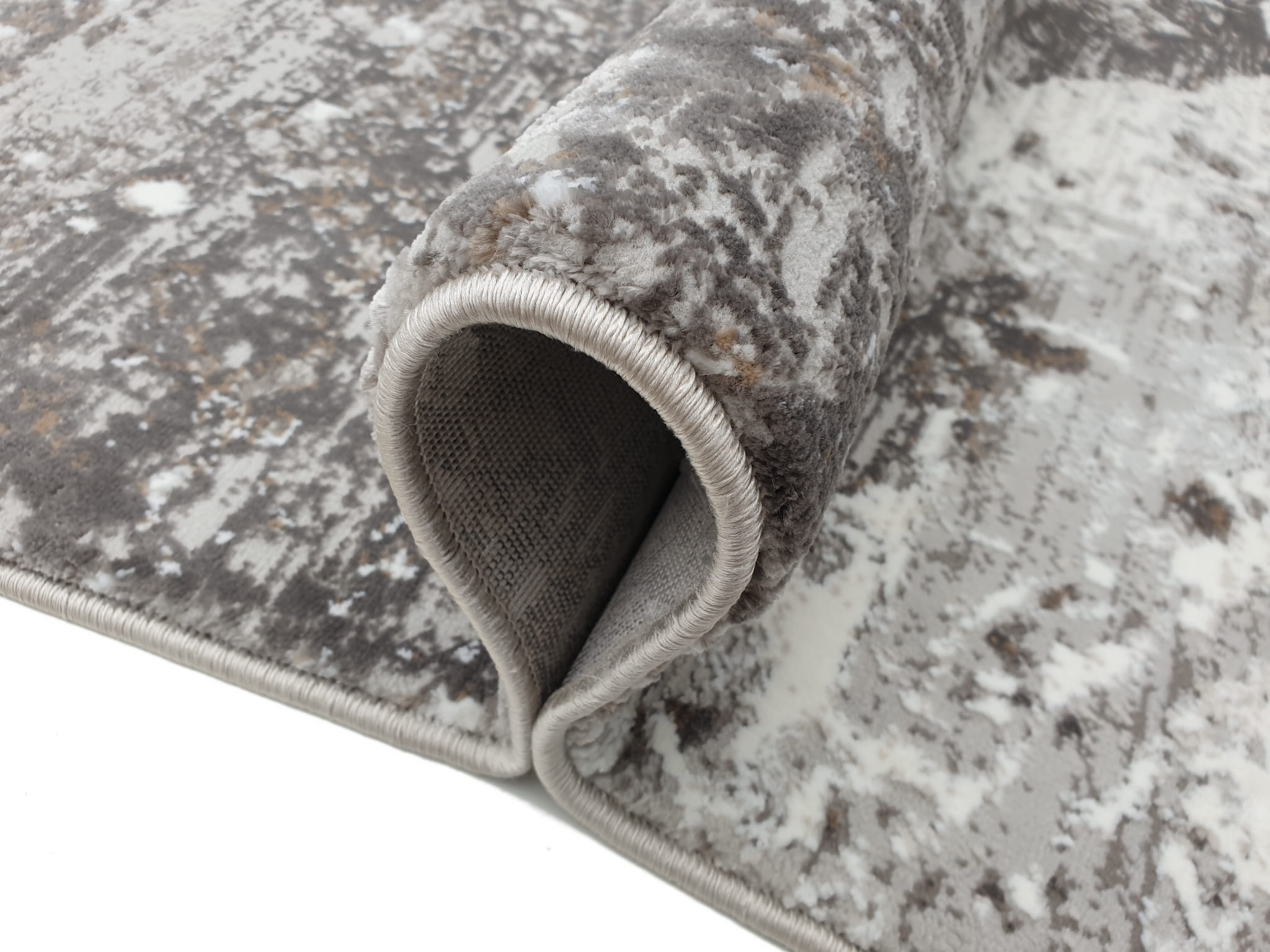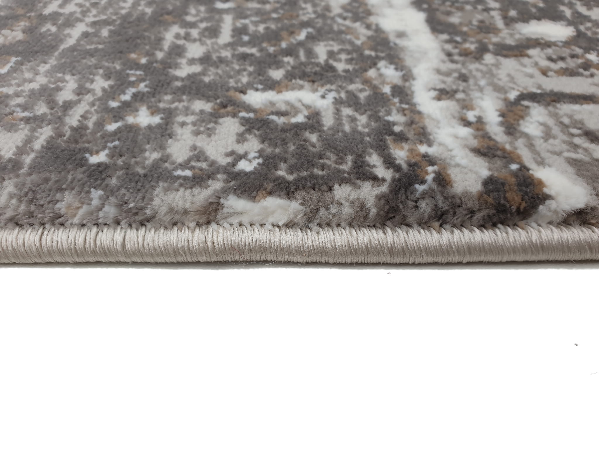 Dywan w kolorystyce brązu i szarości o wzorze imitującym naturalny marmur nada wnętrzu nowoczesny i dynamiczny charakter. Dwupoziomowe runo tworzy trójwymiarowy efekt 3d a całości dopełnia delikatny połysk runa.