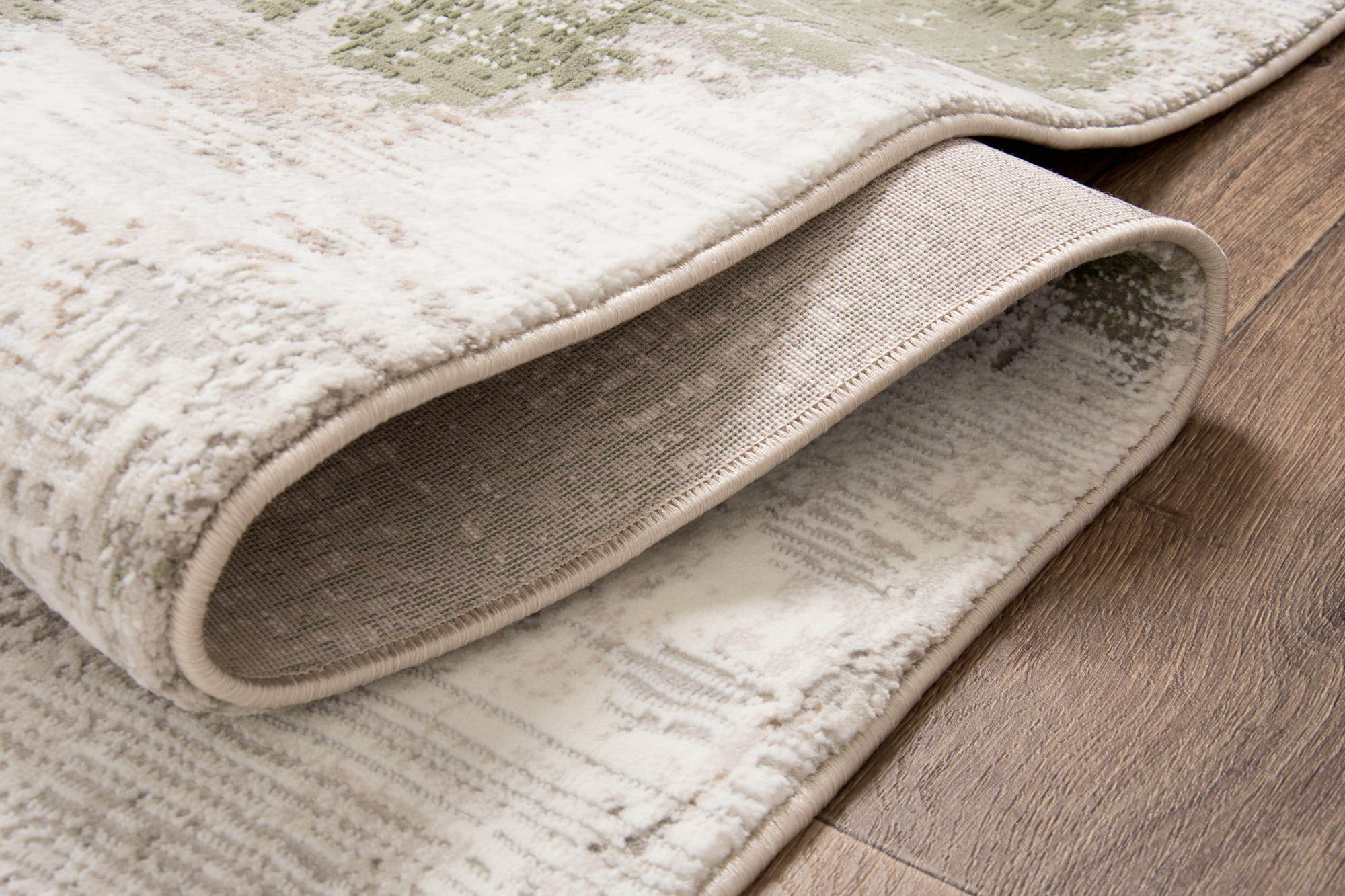 Przecierany dywan w stylu vintage w kolorystyce kremu i zieleni będzie piękną ozdobą wnętrz. Dwupoziomowe runo tworzy trójwymiarowy efekt 3d a całości dopełnia delikatny połysk runa. Ze względu na rodzaj użytego do ich produkcji włókna oraz gęstości runa dywany te są bardzo praktyczne w użytkowaniu.
