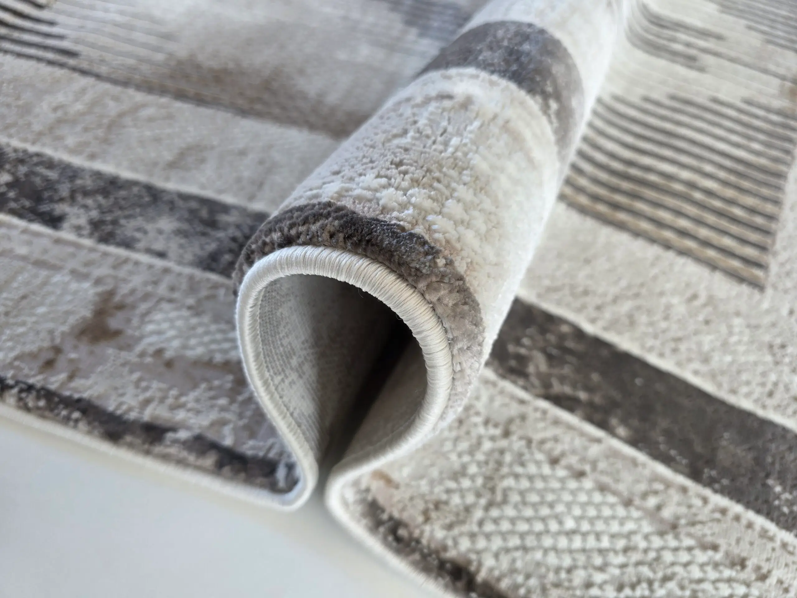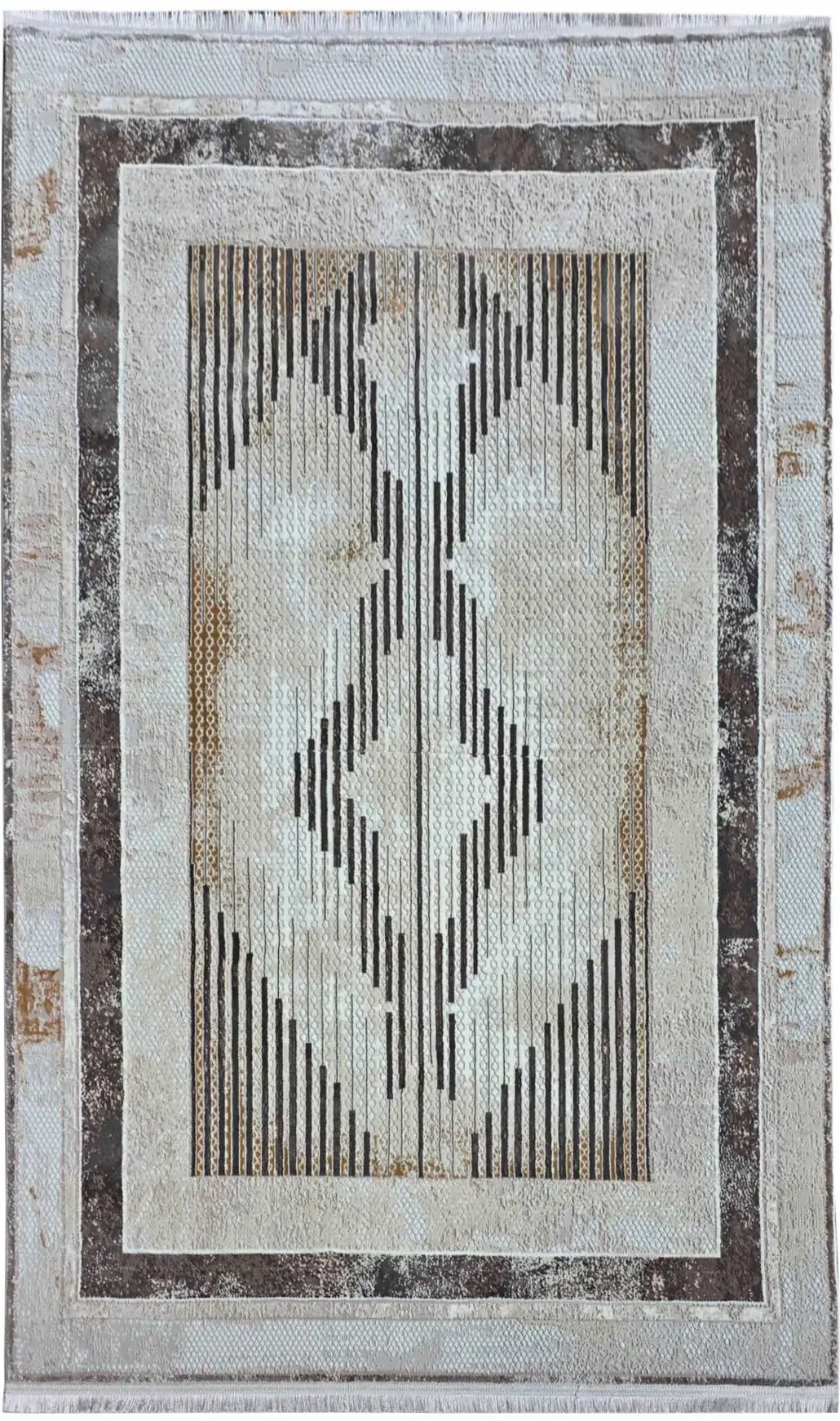 Dywan w kolorystyce beżu i brązu z wzorem otoczonym ramką będzie piękną ozdobą wnętrz. Dwupoziomowe runo tworzy trójwymiarowy efekt 3d, a całości dopełnia delikatny połysk runa. Ze względu na rodzaj użytego do ich produkcji włókna oraz gęstości runa dywany te są bardzo praktyczne w użytkowaniu.