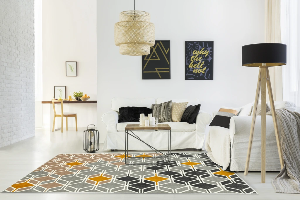 Dywan wykonano z uszlachetnionej termicznie przędzy polipropylenowej Heat Set, dzięki czemu jest miękki i przyjemny w dotyku. Charakteryzuje się również lekkim połyskiem, dzięki czemu w zależności od kierunku ułożenia włosia runo jest jaśniejsze lub ciemniejsze, dając bardzo ciekawy efekt. Geometryczny wzór dodaje elegancji i łatwo komponuje się z różnymi stylami wnętrz.