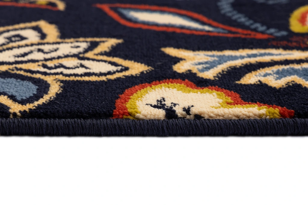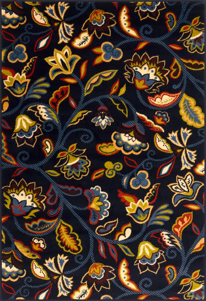 Dywan z dekoracyjnym, kwiatowym wzorem w żywych kolorach na ciemnym tle. Został precyzyjnie utkany maszynowo z wysokiej jakości włókna heat-set. Charakteryzuje się wyjątkową trwałością, odpornością na codzienne użytkowanie oraz łatwością w utrzymaniu czystości