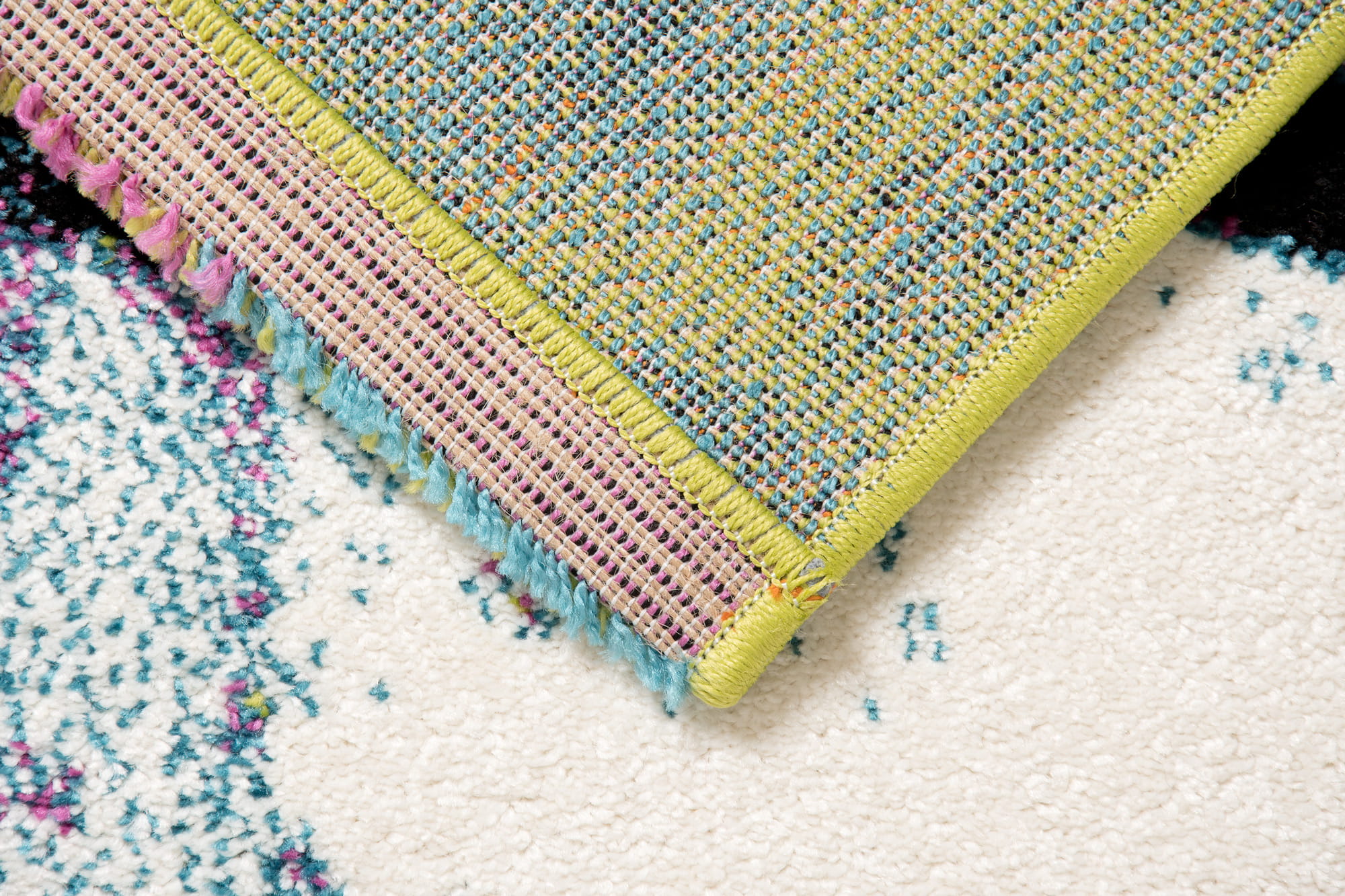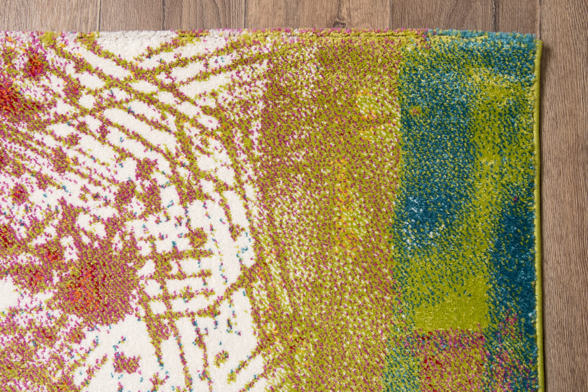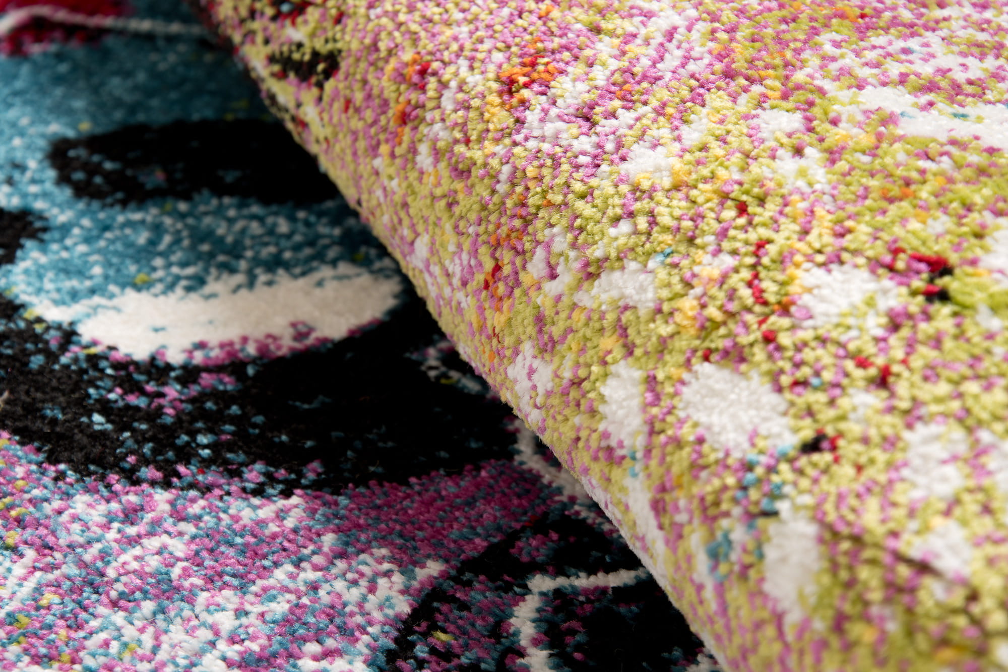 Dywan wyróżnia się gęstym, fryzowanym runem, które jest miękkie, przyjemne w dotyku i wyjątkowo trwałe. Doskonale izoluje od chłodu podłogi, zapewniając komfort i ciepło. Jego intensywne kolory oraz oryginalny wzór dodają wnętrzu charakteru, wprowadzając niepowtarzalny urok.
