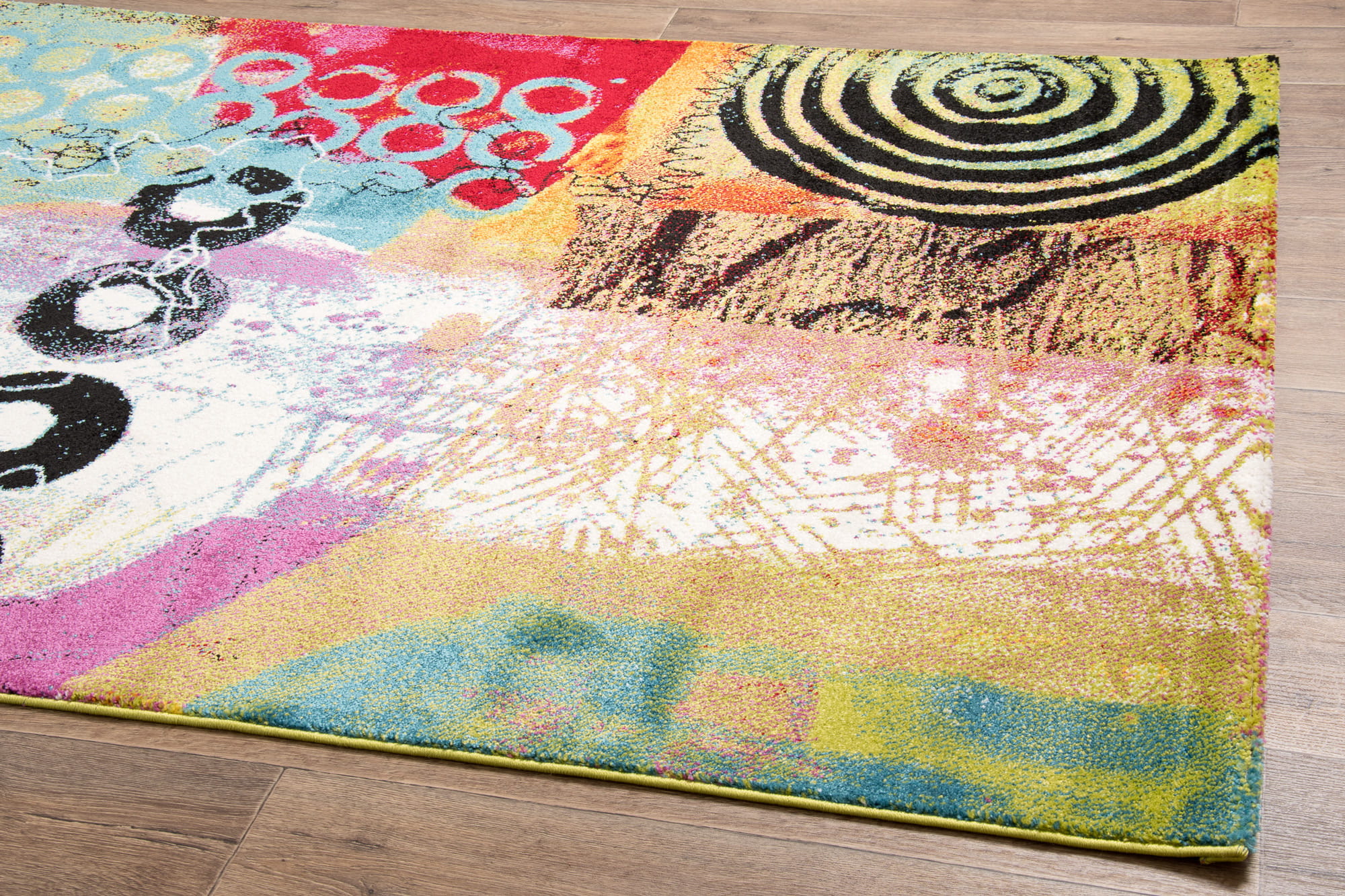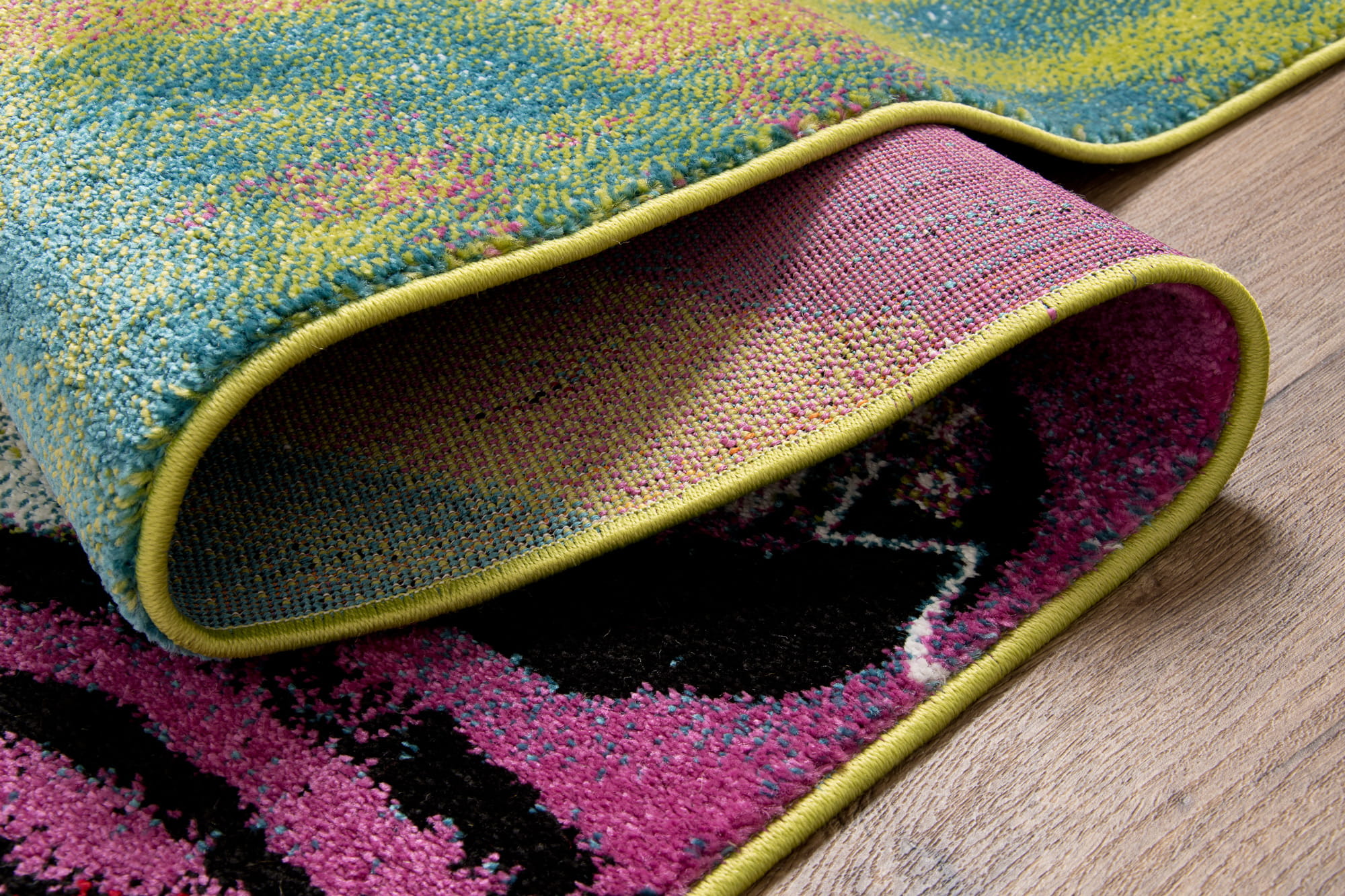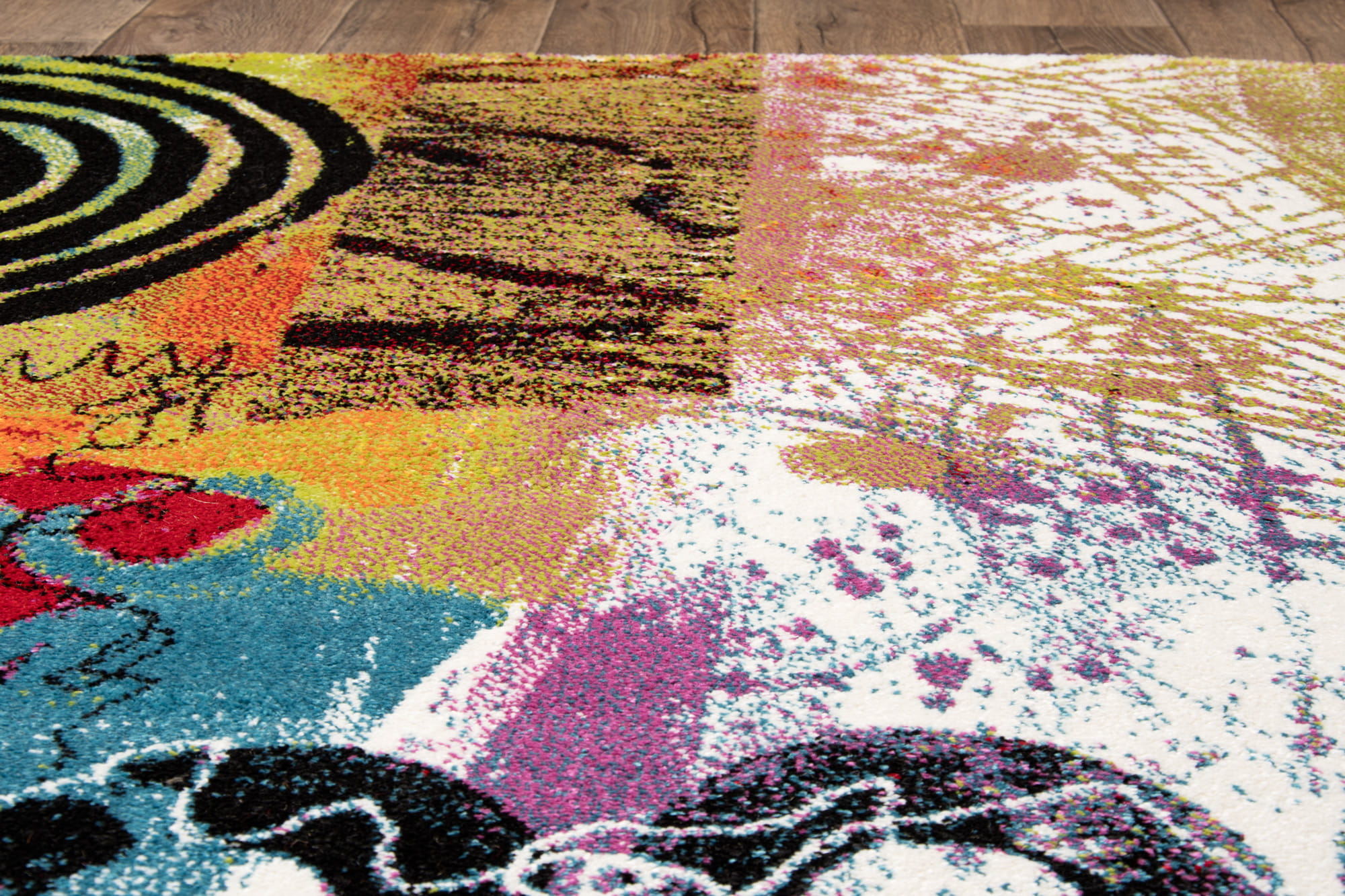 Dywan wyróżnia się gęstym, fryzowanym runem, które jest miękkie, przyjemne w dotyku i wyjątkowo trwałe. Doskonale izoluje od chłodu podłogi, zapewniając komfort i ciepło. Jego intensywne kolory oraz oryginalny wzór dodają wnętrzu charakteru, wprowadzając niepowtarzalny urok.