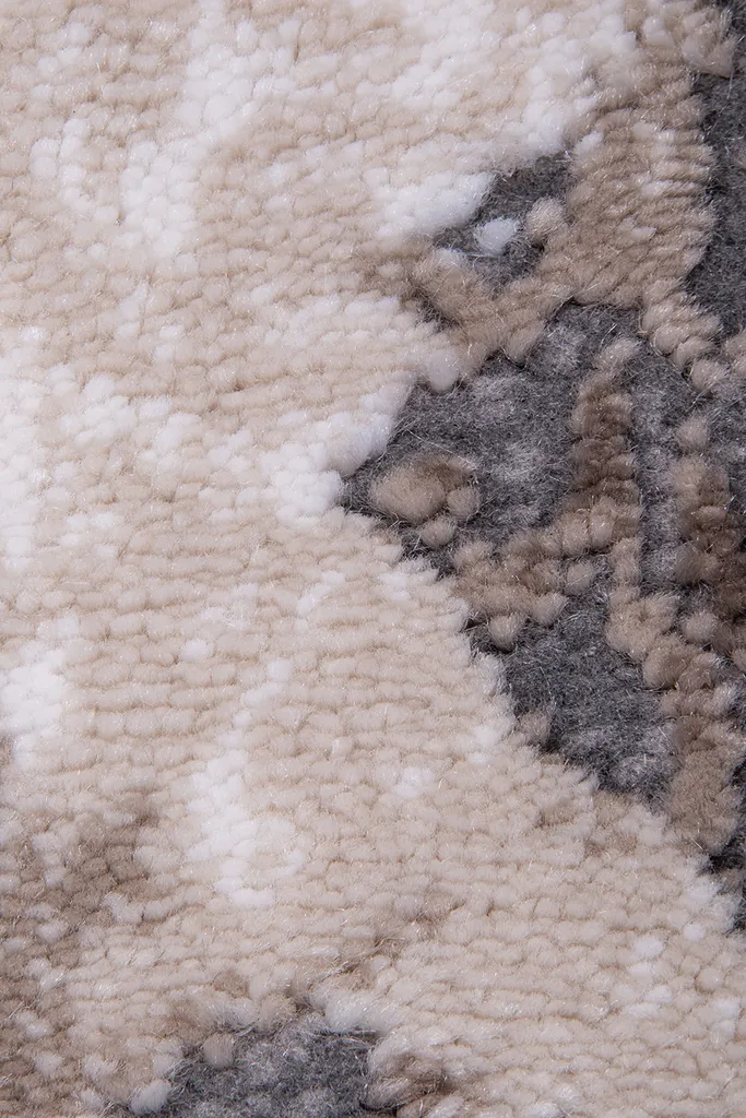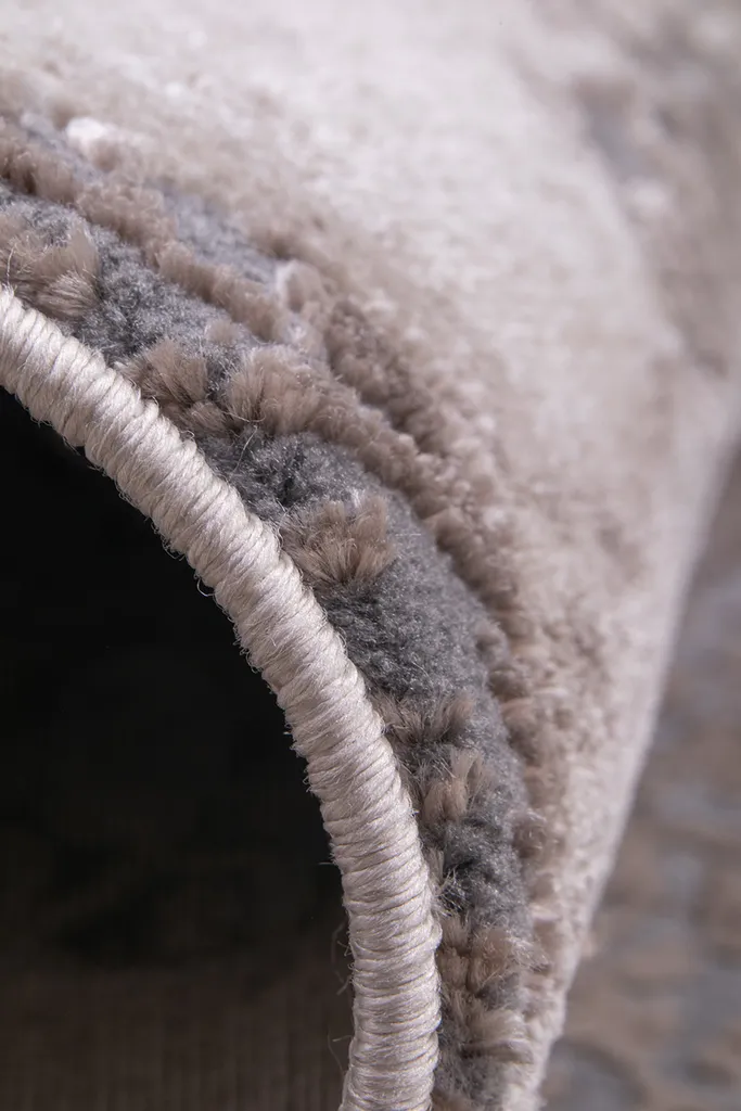 Nowoczesny dywan z poliestru i polipropylenu z dwupoziomowym runem tworzącym efekt 3d. Utrzymany w stonowanej kolorystyce beżu, brązu i szarości, nadaje wnętrzu elegancji i głębi. Miękki w dotyku, trwały i łatwy w pielęgnacji.