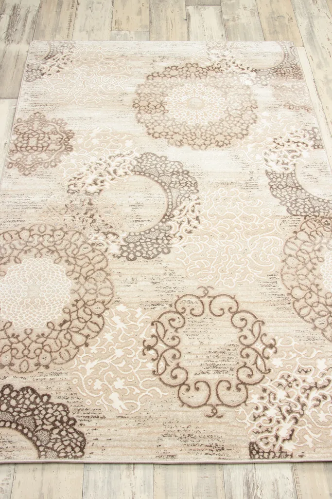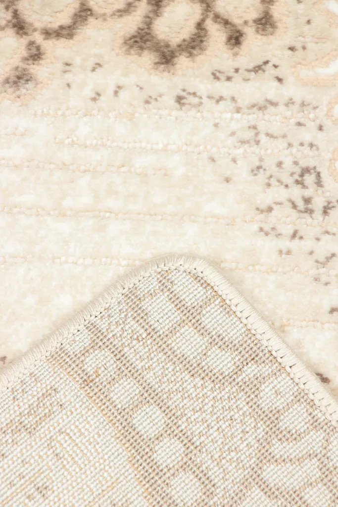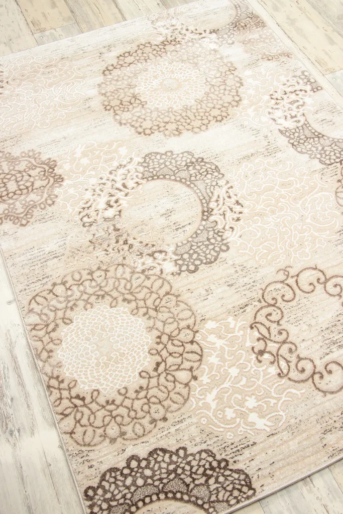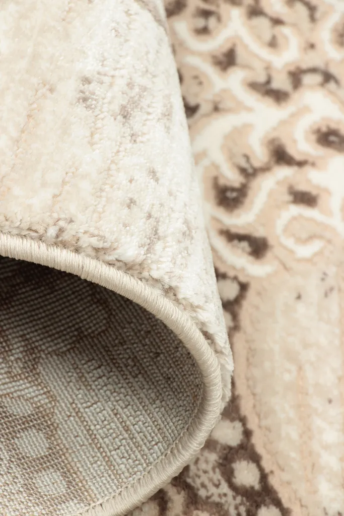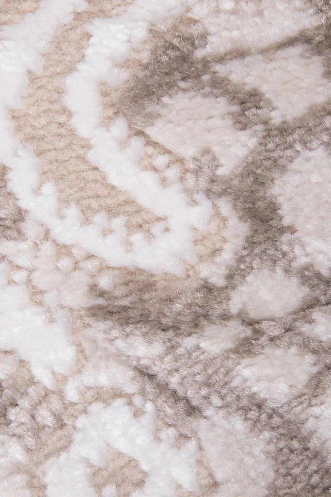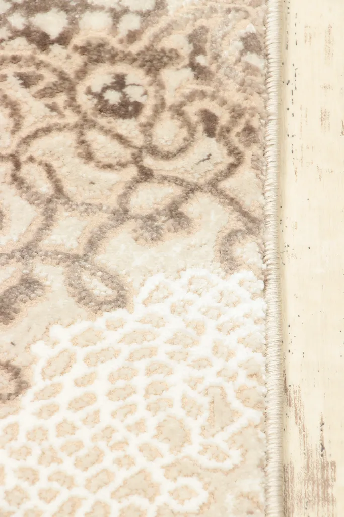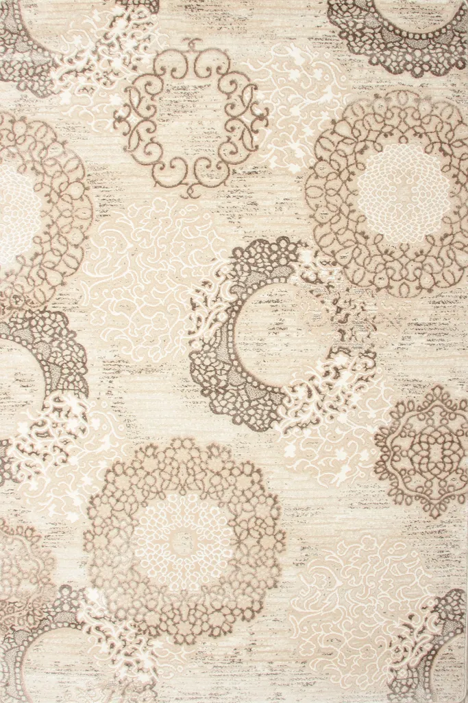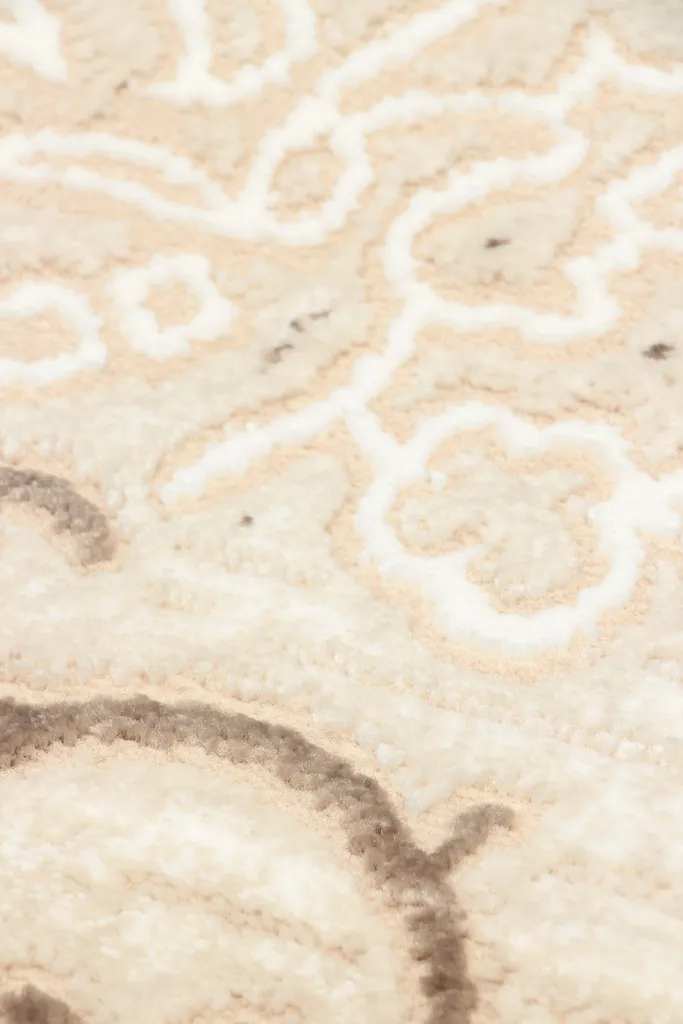 Dywan o subtelnym, dekoracyjnym wzorze inspirowanym koronką i motywami roślinnymi. Dwupoziomowe runo tworzy delikatny efekt 3D, a stonowana kolorystyka beżu, brązu i szarości nadaje mu elegancki, nowoczesny charakter. Miękki w dotyku, trwały i łatwy w pielęgnacji.