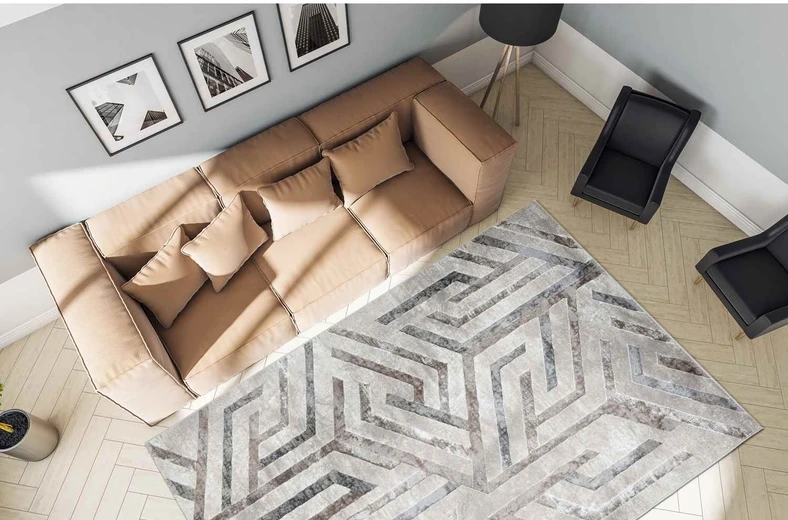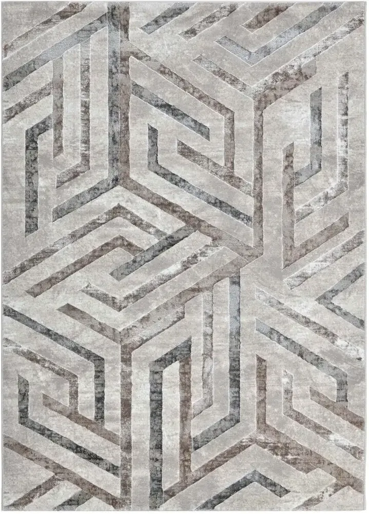 Elegancki dywan wykonany z wytrzymałego poliestru, wyróżniający się delikatnym połyskiem. Zdobiony nowoczesnym motywem geometrycznym w odcieniach szarości i beżu, tworzącym efekt trójwymiarowej kompozycji.