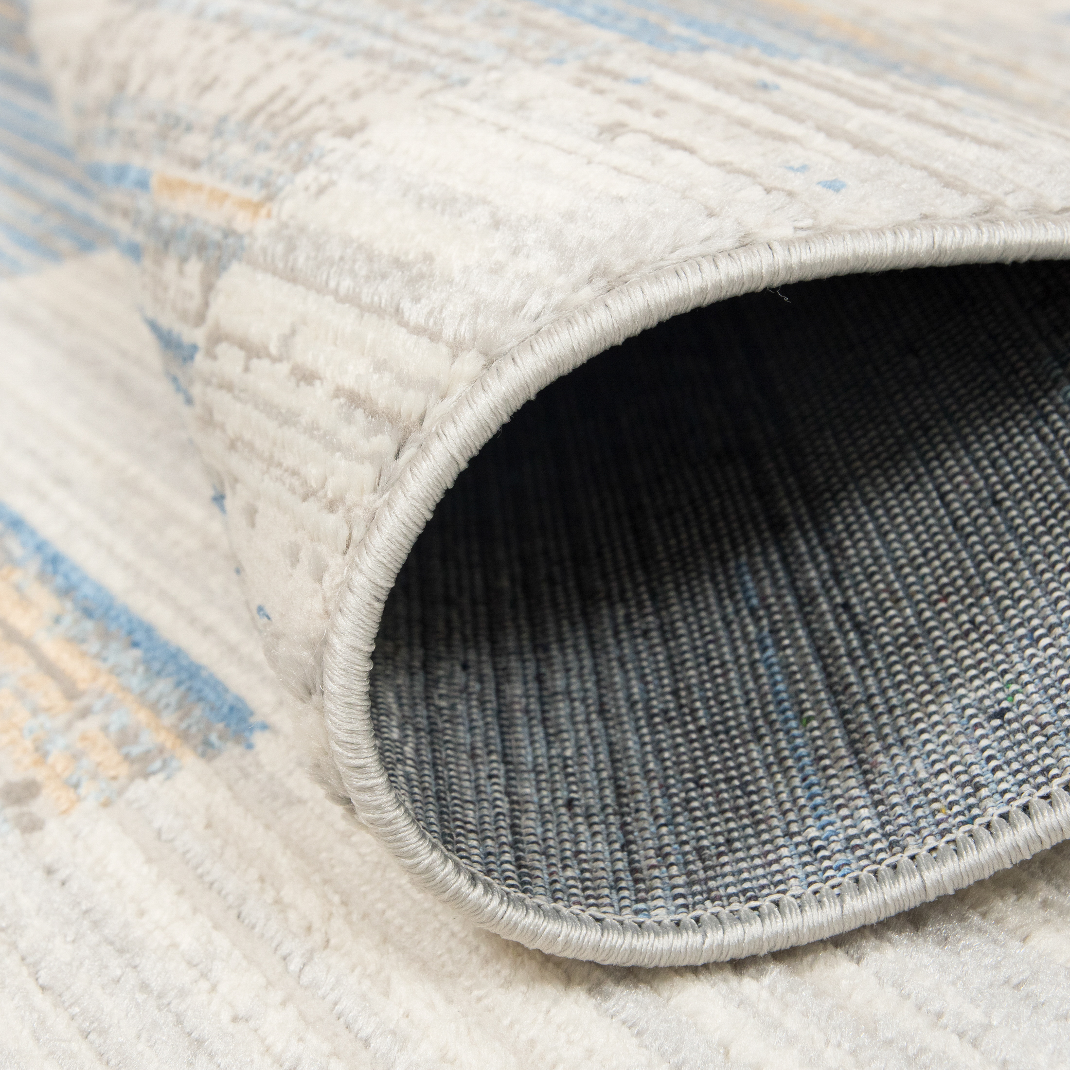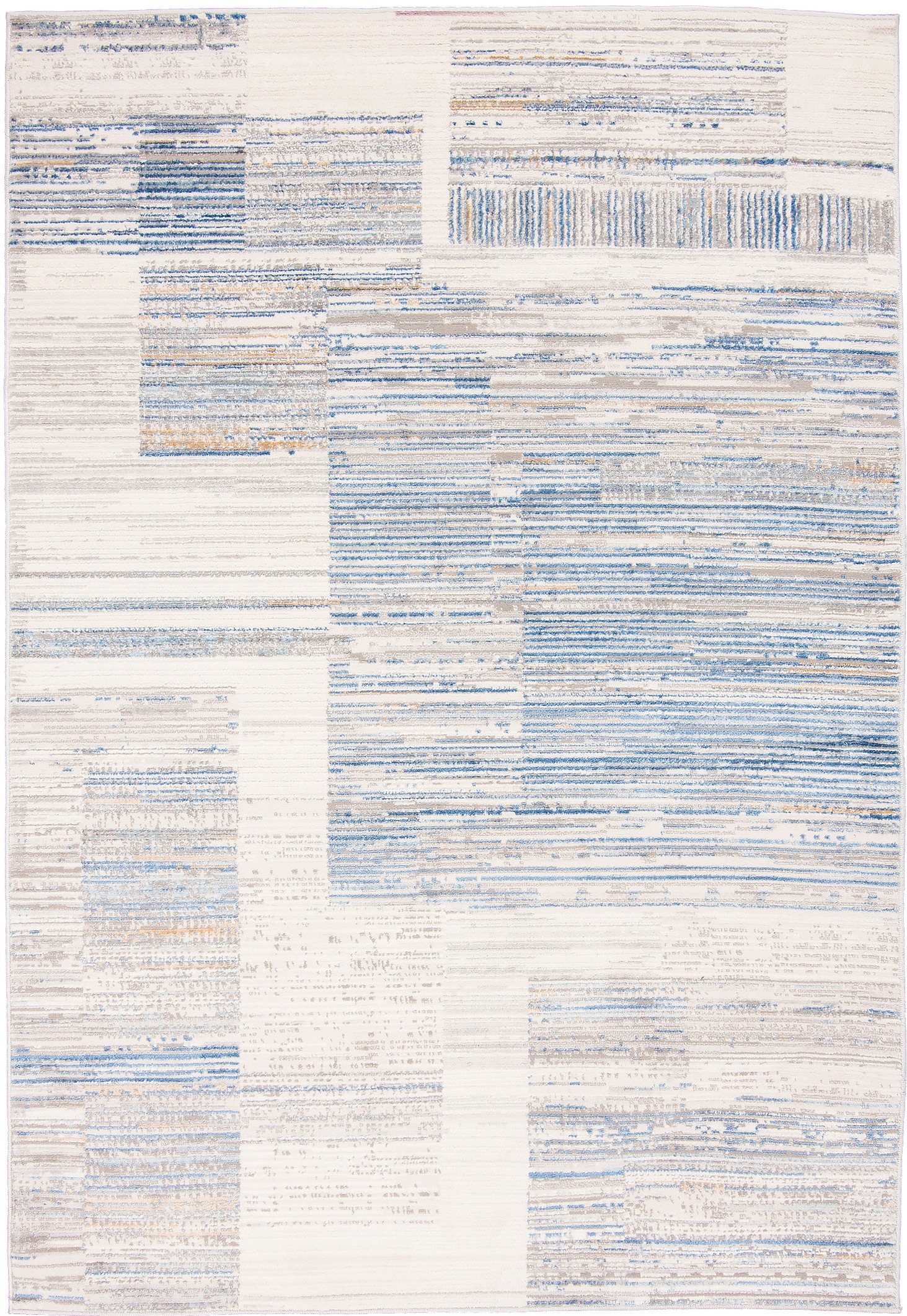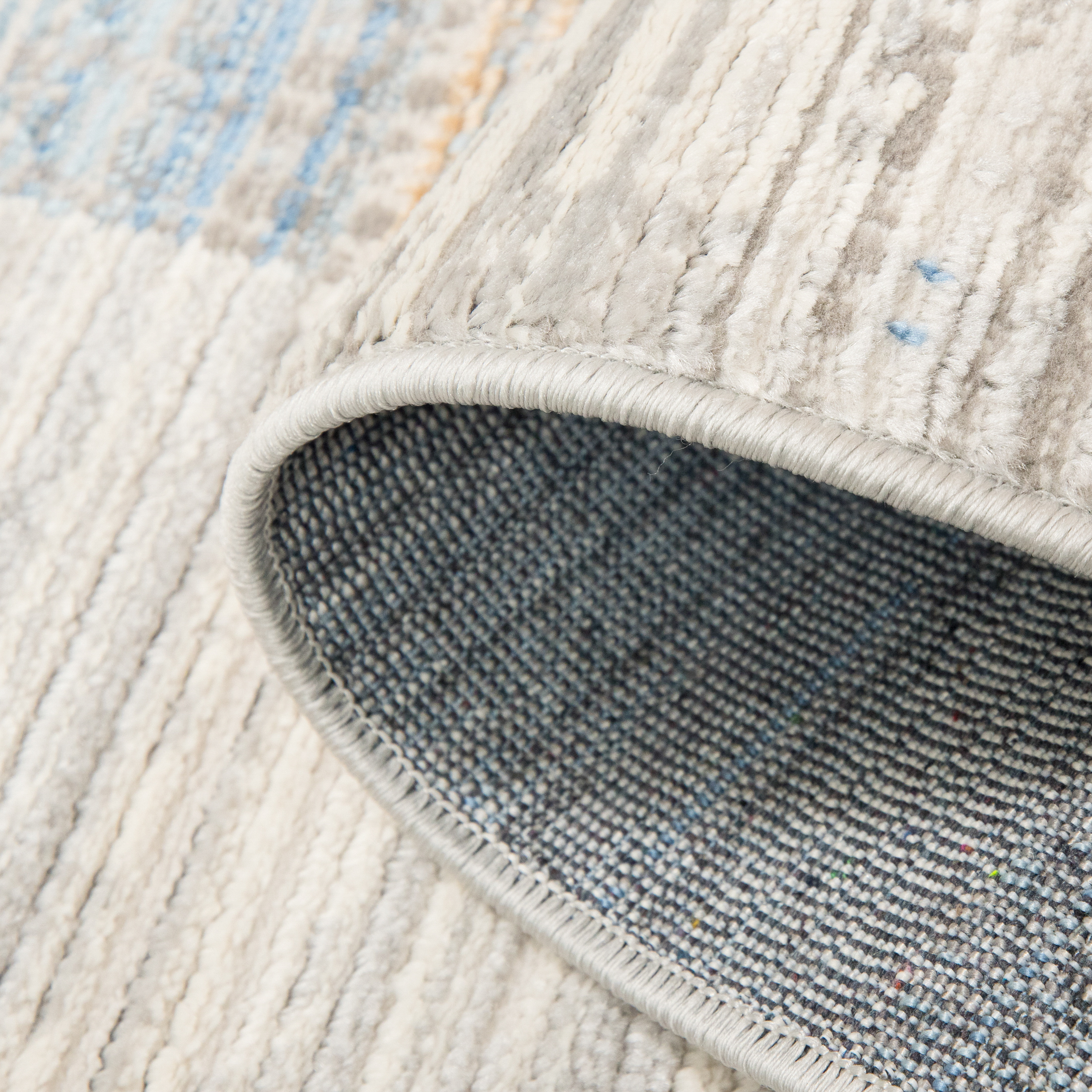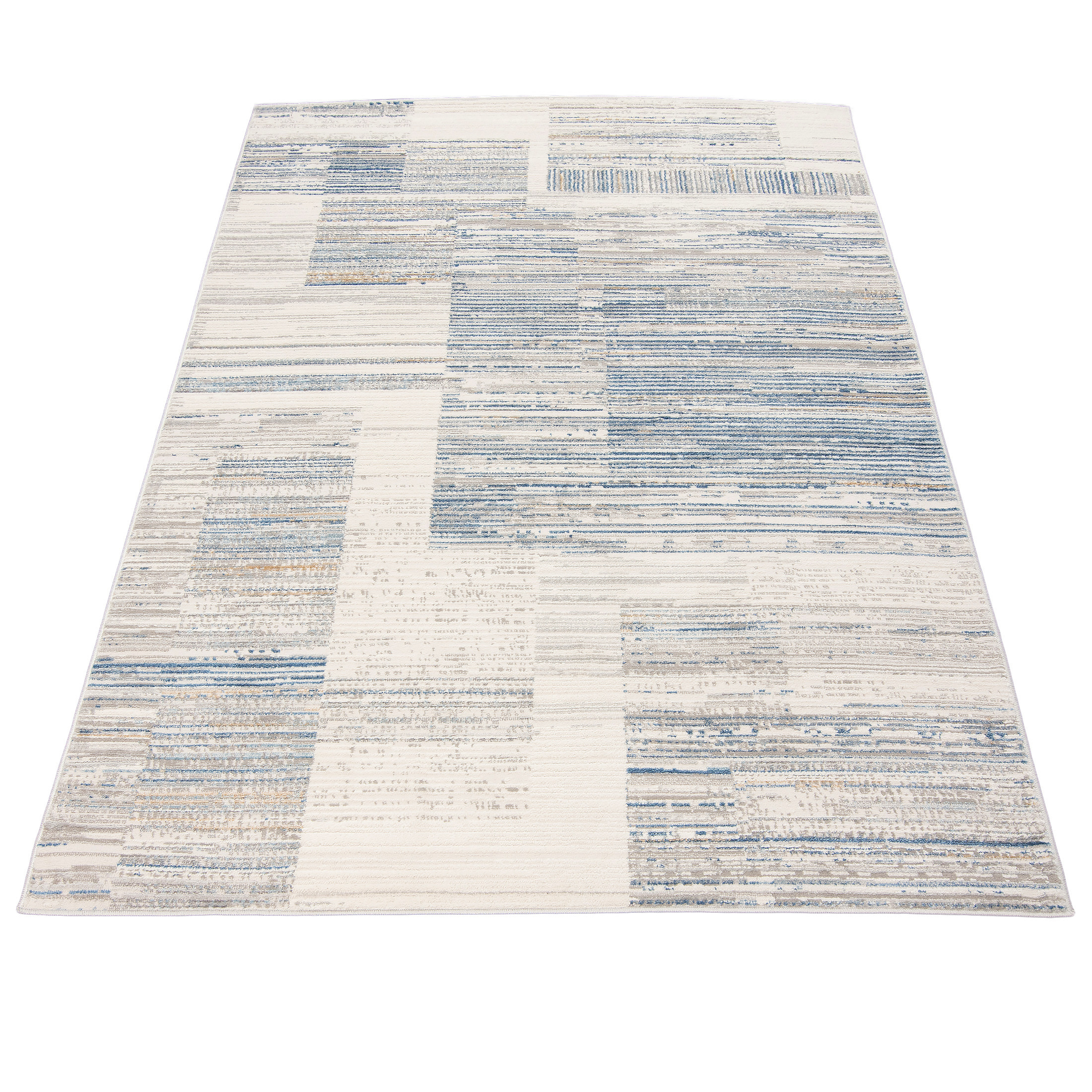 Dywan krótkowłosy wykonany z wysokiej jakości włókien syntetycznych. Dywan zdobi wzór z prostokątnych pól w odcieniach kremu, błękitu, szarości i beżu, tworzący nowoczesny, lekko przecierany efekt. Dywan jest elegancki, trwały i łatwy w utrzymaniu czystości.
